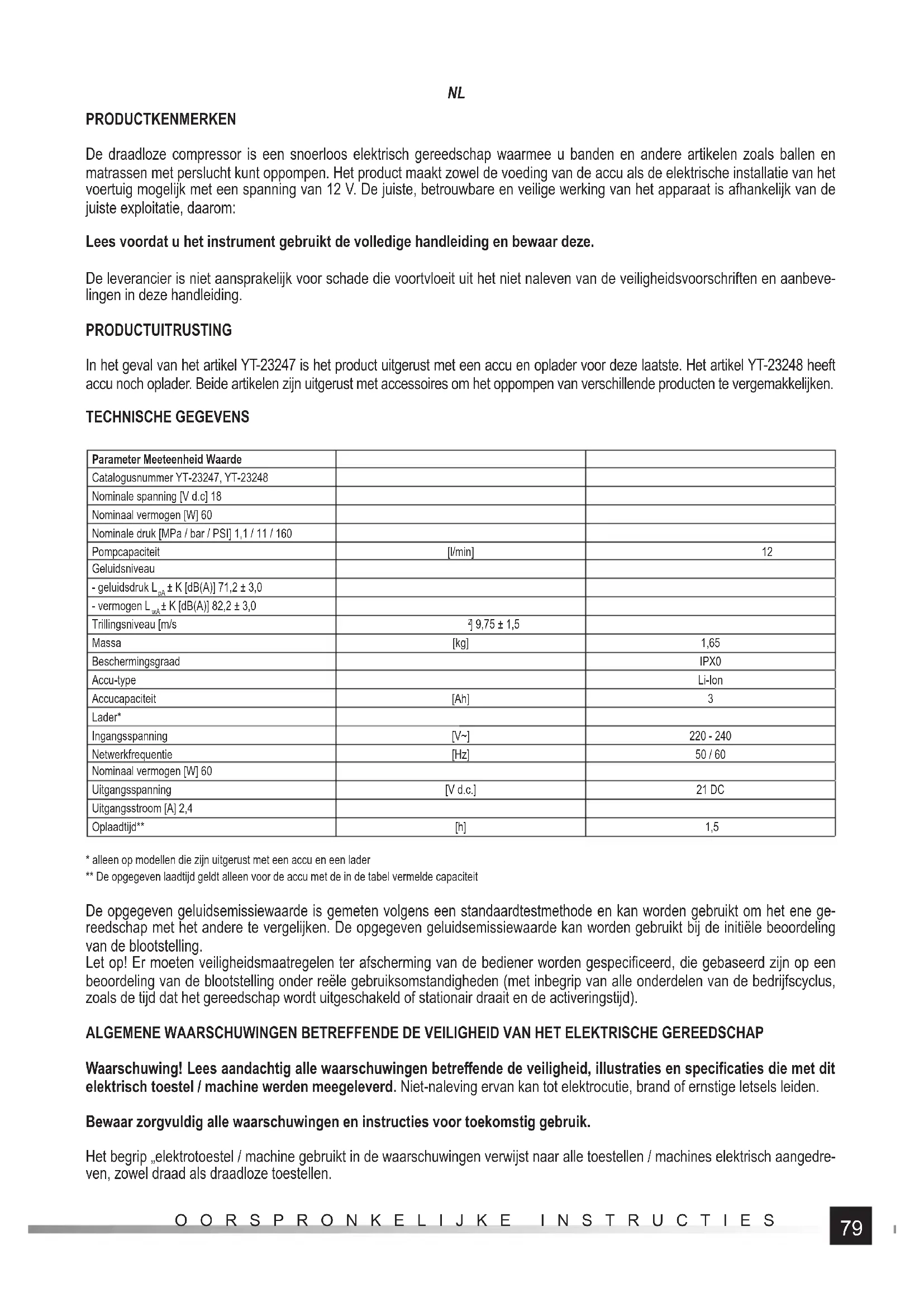 PRODUCTKENMERKEN De draadloze compressor is een snoerloos elektrisch gereedschap waarmee u banden en andere artikelen zoals ballen en matrassen met perslucht kunt oppompen. Het product maakt zowel de voeding van de accu als de elektrische installatie van het voertuig mogelijk met een spanning van 12 V. De juiste, betrouwbare en veilige werking van het apparaat is afhankelijk van de juiste exploitatie, daarom: Lees voordat u het instrument gebruikt de volledige handleiding en bewaar deze. De leverancier is niet aansprakelijk voor schade die voortvloeit uit het niet naleven van de veiligheidsvoorschriften en aanbeve- lingen in deze handleiding. PRODUCTUITRUSTING In het geval van het artikel YT-23247 is het product uitgerust met een accu en oplader voor deze laatste. Het artikel YT-23248 heeft accu noch oplader. Beide artikelen zijn uitgerust met accessoires om het oppompen van verschillende producten te vergemakkelijken. TECHNISCHE GEGEVENS Parameter Meeteenheid Waarde Catalogusnummer YT-23247, YT-23248 Nominale spanning [V d.c] 18 Nominaal vermogen [W] 60 Nominale druk [MPa / bar / PSI] 1,1 / 11 / 160 Pompcapaciteit [l/min] 12 Geluidsniveau - geluidsdruk L