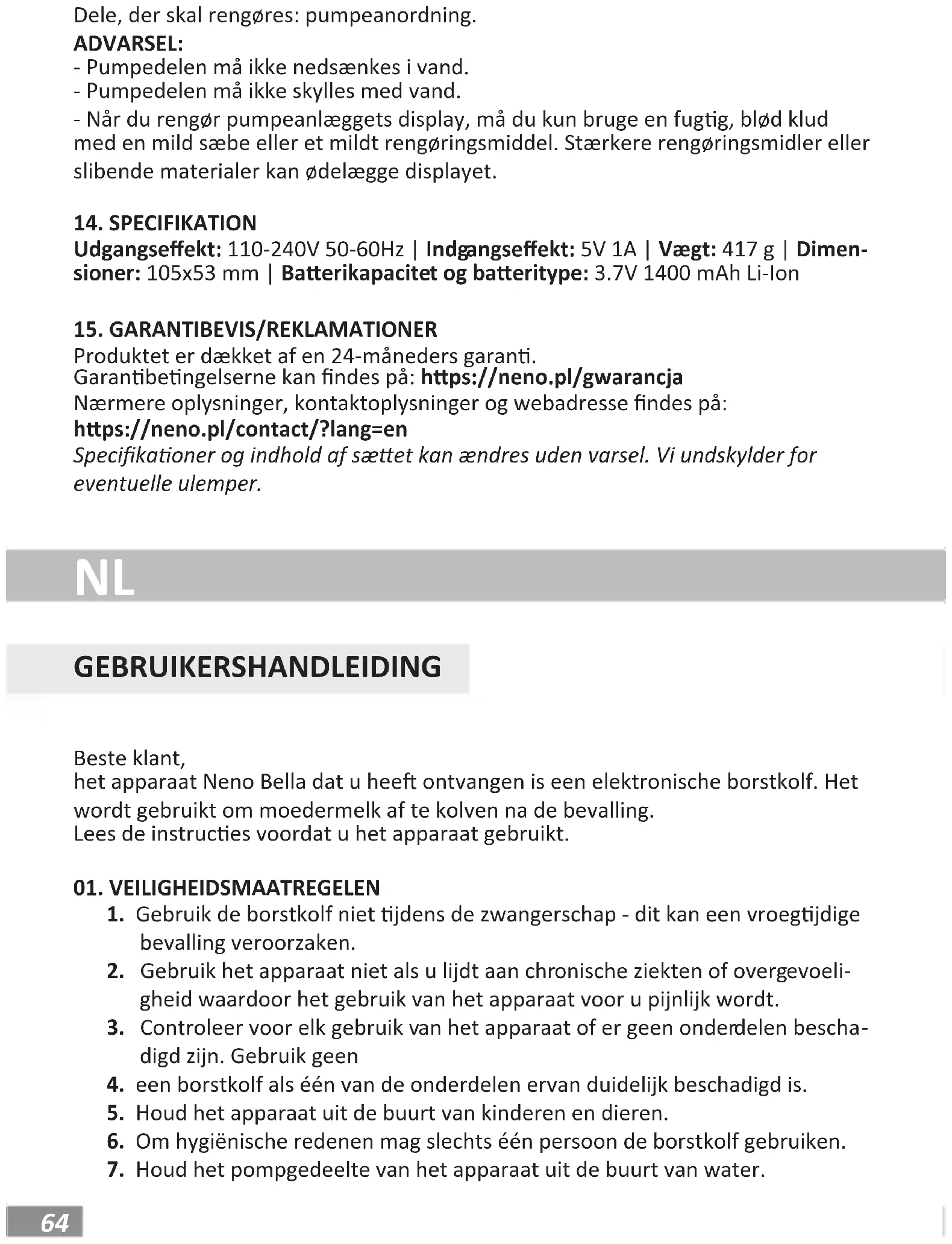 Het product hee een garane van 24 maanden. De voorwaarden van de garane zijn te vinden op: hps://neno.pl/gwarancja Details, contact en website adres zijn te vinden op: hps://neno.pl/contact/?lang=en Specicaes en inhoud van de kit kunnen zonder kennisgeving worden gewijzigd. Onze excuses voor eventueel ongemak. Esmado cliente, El disposivo Neno Bella que ha recibido es un extractor de leche electrónico. Se uliza para extraer leche materna después del parto. Lea las instrucciones antes de ulizar el aparato.