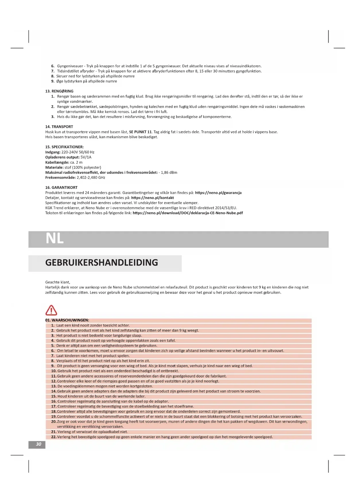 GEBRUIKERSHANDLEIDING Geachte klant, Hartelijk dank voor uw aankoop van de Neno Nube schommelstoel en relaxfauteuil. Dit product is geschikt voor kinderen tot 9 kg en kinderen die nog niet zelfstandig kunnen zien. Lees voor gebruik de gebruiksaanwijzing en bewaar deze voor het geval u het product opnieuw moet gebruiken.