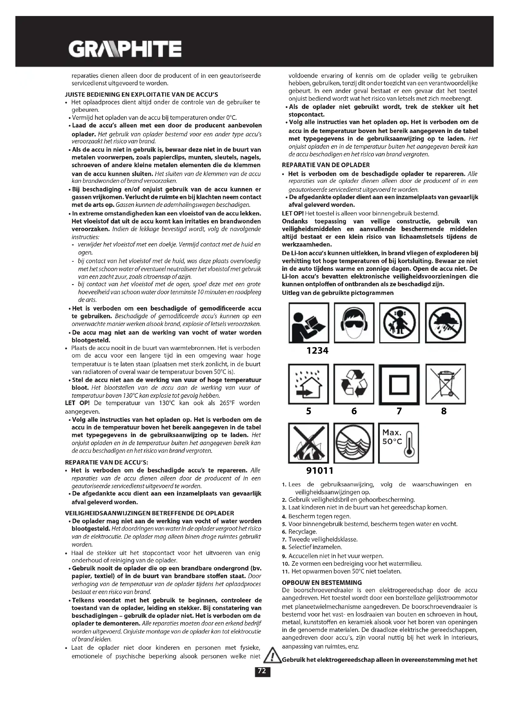 veiligheidsaanwijzingen op. 2. Gebruik veiligheidsbril en gehoorbescherming.3. Laat kinderen niet in de buurt van het gereedschap komen. 4. Bescherm tegen regen.5. Voor binnengebruik bestemd, bescherm tegen water en vocht.6. Recyclage.7. Tweede veiligheidsklasse. 8. Selectief inzamelen.9. Accucellen niet in het vuur werpen.10. Ze vormen een bedreiging voor het watermilieu.11. Het opwarmen boven 50°C niet toelaten.