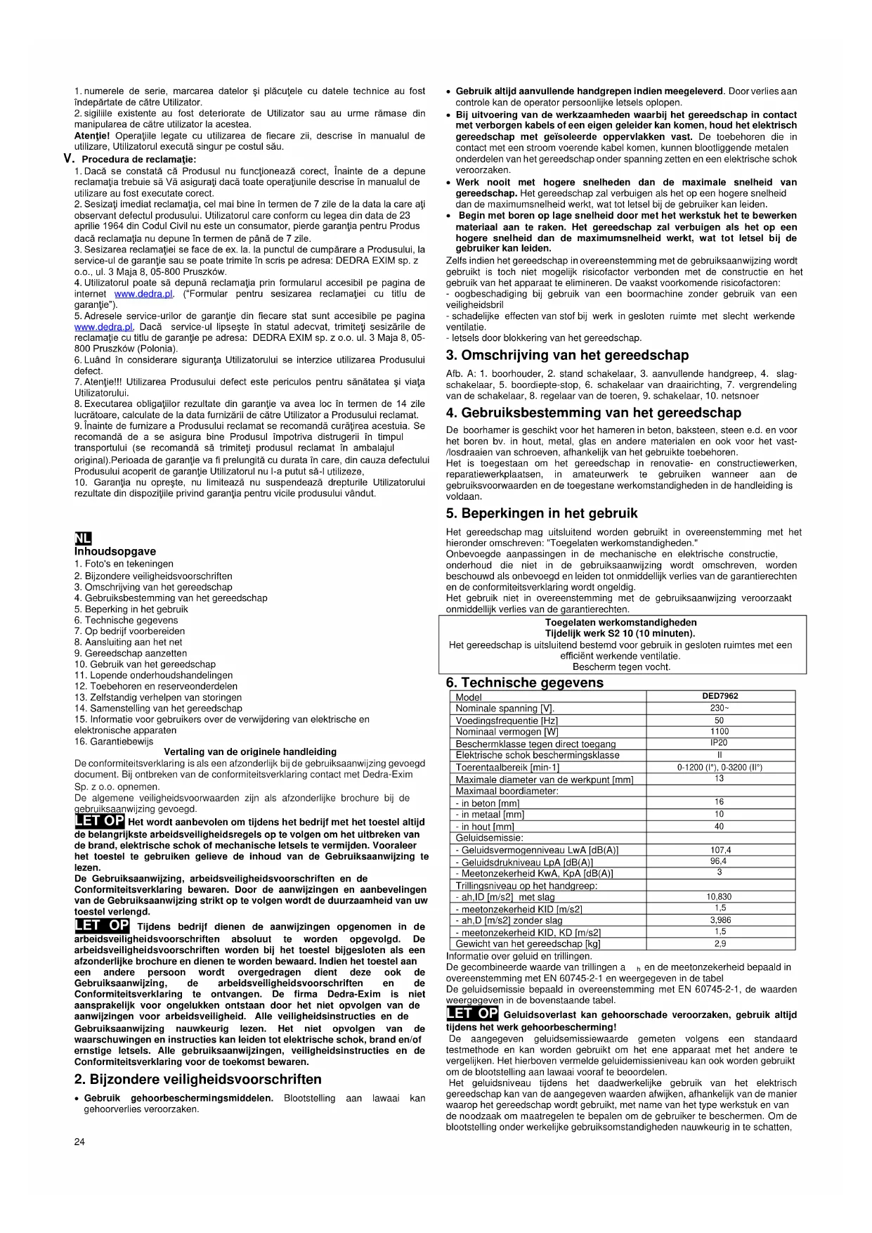 Vertaling van de originele handleiding De conformiteitsverklaring is als een afzonderlijk bij de gebruiksaanwijzing gevoegd document. Bij ontbreken van de conformiteitsverklaring contact met Dedra-Exim Sp. z o.o. opnemen. De algemene veiligheidsvoorwaarden zijn als afzonderlijke brochure bij de gebruiksaanwijzing gevoegd. LET OP Het wordt aanbevolen om tijdens het bedrijf met het toestel altijd de belangrijkste arbeidsveiligheidsregels op te volgen om het uitbreken van de brand, elektrische schok of mechanische letsels te vermijden. Vooraleer het toestel te gebruiken gelieve de inhoud van de Gebruiksaanwijzing te lezen. De Gebruiksaanwijzing, arbeidsveiligheidsvoorschriften en de Conformiteitsverklaring bewaren. Door de aanwijzingen en aanbevelingen van de Gebruiksaanwijzing strikt op te volgen wordt de duurzaamheid van uw toestel verlengd. LET OP Tijdens bedrijf dienen de aanwijzingen opgenomen in de arbeidsveiligheidsvoorschriften absoluut te worden opgevolgd. De arbeidsveiligheidsvoorschriften worden bij het toestel bijgesloten als een afzonderlijke brochure en dienen te worden bewaard. Indien het toestel aan een andere persoon wordt overgedragen dient deze ook de Gebruiksaanwijzing, de arbeidsveiligheidsvoorschriften en de Conformiteitsverklaring te ontvangen. De firma Dedra-Exim is niet aansprakelijk voor ongelukken ontstaan door het niet opvolgen van de aanwijzingen voor arbeidsveiligheid. Alle veiligheidsinstructies en de Gebruiksaanwijzing nauwkeurig lezen. Het niet opvolgen van de waarschuwingen en instructies kan leiden tot elektrische schok, brand en/of ernstige letsels. Alle gebruiksaanwijzingen, veiligheidsinstructies en de Conformiteitsverklaring voor de toekomst bewaren.