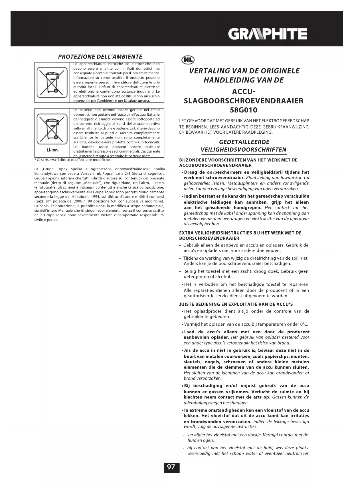 en meetonzekerheid K worden eronder conform de norm EN 60745-2-1 aangegeven. Het in deze gebruiksaanwijzing aangegeven niveau van trillingen werd conform de procedure van de norm EN 60745 gemeten en kan voor vergelijking van elektrogereedschap gebruikt worden. Het kan eveneens voor voorlopige beoordeling van de blootstelling aan trillingen gebruikt worden. Het aangegeven niveau van trillingen is kenmerkend voor de basis toepassingsgebieden van het elektrogereedschap. Bij toepassing voor andere doeleinden of met andere werkstukken alsook bij gebrekkig onderhoud kan het trillingenniveau veranderen. De bovenstaande omstandigheden kunnen de blootstelling aan trillingen tijdens het werk verhogen. Om de blootstelling aan trillingen goed te schatten, neem de periodes van het uitzetten van het elektrogereedschap of de periodes van het aanzetten zonder gebruik in acht. Op die manier kan de totale blootstelling aan trillingen aanzienlijk lager zijn. Voer de extra veiligheidsmaatregelen in om de gebruiker tegen de risico’s van trillingen te beschermen, zoals: onderhoud van het elektrogereedschap en werkstukken, verzekering van de juiste temperatuur van de handen, juiste organisatie van het werk. Akoestische druk niveau: Lp A = 84 dB (A) K=3dB (A) Akoestische kracht niveau: LwA = 95 dB (A) K=3dB (A) Waarde van de trillingen versnelling: ah = 7,528 m/s²; K =1,5 m/s² MILIEUBESCHERMING De elektrisch aangedreven producten mogen niet met het huishoudelijk afval worden afgevoerd, maar moeten voor het hergebruik in aangepaste faciliteiten worden gebracht. Nodige informatie kunt u bij de verkoper of plaatselijke autoriteiten verkrijgen. De afgedankte elektrische en elektronische apparatuur bevat stoen gevaarlijk voor het milieu. De apparatuur die niet aan recycling wordt onderworpen, vormt een potentiële bedreiging voor het milieu en de menselijke gezondheid. Li-Ion Accu’s / batterijen dienen niet tezamen met huisafval verzameld te worden. Het is verboden om het in het vuur of water te werpen. Beschadigde of afgedankte accu’s dienen op een juiste manier gerecycleerd te worden volgens de geldende richtlijn inzake utilisatie van accu’s en batterijen. Batterijen dienen volledig ontladen bij inzamelpunten te worden ingeleverd, indien de batterijen niet volledig ontladen zijn, dienen ze tegen kortsluiting te worden beschermd. Gebruikte batterijen kunnen gratis worden ingeleverd bij commerciële locaties. De koper van de goederen is verplicht de gebruikte batterijen terug te geven.