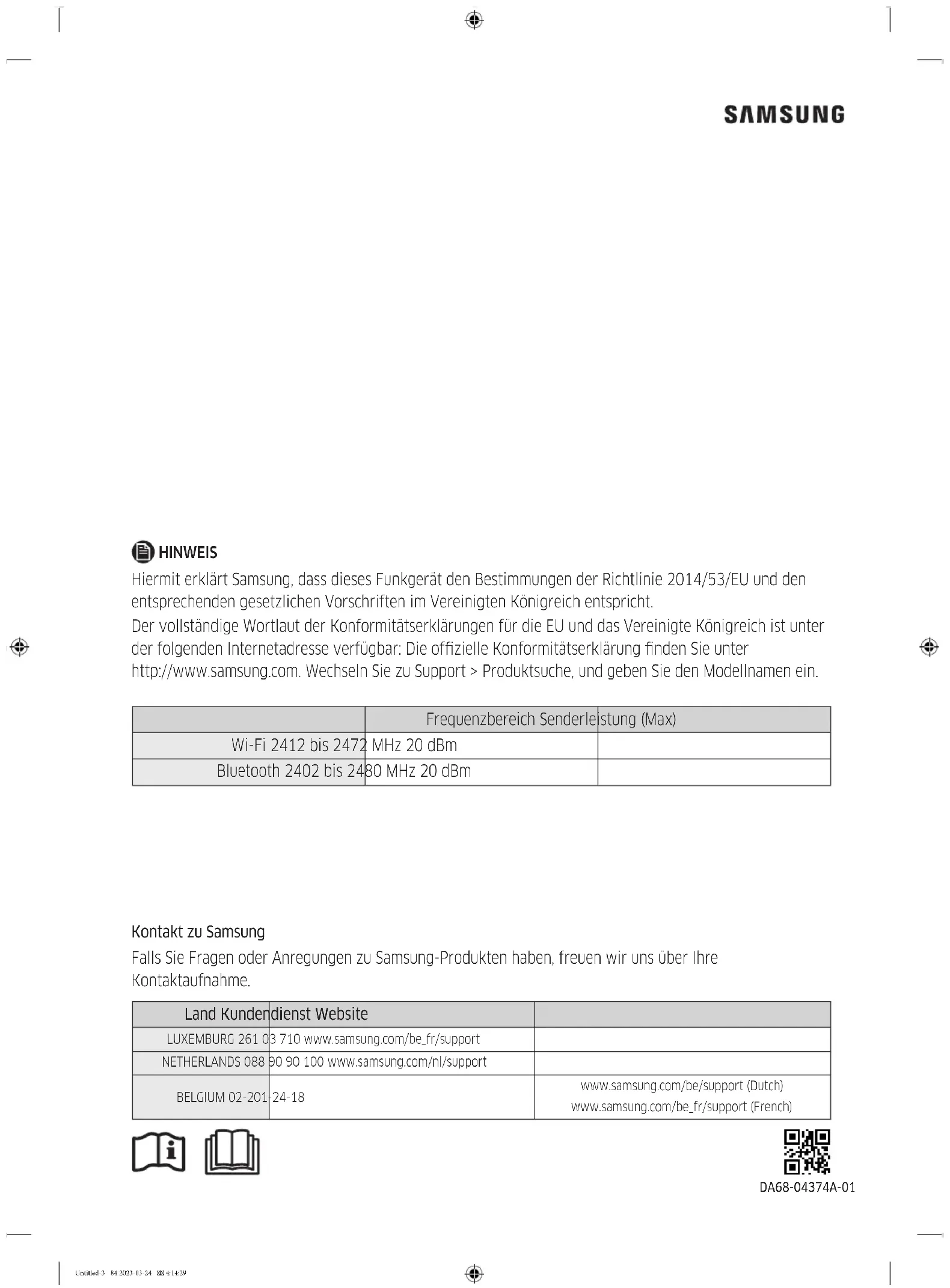 - U kunt professionele reparatie-informatie vinden op http://samsung.com/support. U kunt de onderhoudshandleiding voor gebruikers vinden op http://samsung.com/support. Untitled-5 79 2023-03-24 4:20:18OPMERKING Hierbij verklaart Samsung dat deze radioapparatuur voldoet aan de richtlijn 2014/53/EU en met de relevante wettelijke vereisten in het VK. De volledige tekst van de EU-conformiteitsverklaring en de VK-conformiteitsverklaring is beschikbaar op het volgende internetadres: De ofciële conformiteitsverklaring vindt u op http://www.samsung.com. Ga hiervoor naar Support > Zoeken en geef de modelnaam op. Frequentiebereik Zendvermogen (maximaal) Wi 2412 - 2472 MHz 20 dBm Bluetooth 2402 - 2480 MHz 20 dBm Contact Samsung wereldwijd Wanneer u suggesties of vragen heeft met betrekking tot Samsung producten, verzoeken wij u contact op te nemen met de consumenten service- en informatie dienst van Samsung. Land Contactcentrum Website LUXEMBURG 261 03 710 www.samsung.com/be_fr/support NETHERLANDS 088 90 90 100 www.samsung.com/nl/support