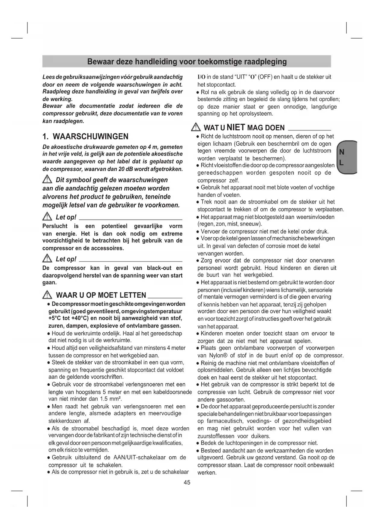 Bewaar deze handleiding voor toekomstige raadpleging Lees de gebruiksaanwijzingen vóór gebruik aandachtig door en neem de volgende waarschuwingen in acht. Raadpleeg deze handleiding in geval van twijfels over de werking. Bewaar alle documentatie zodat iedereen die de compressor gebruikt, deze documentatie van te voren kan raadplegen.