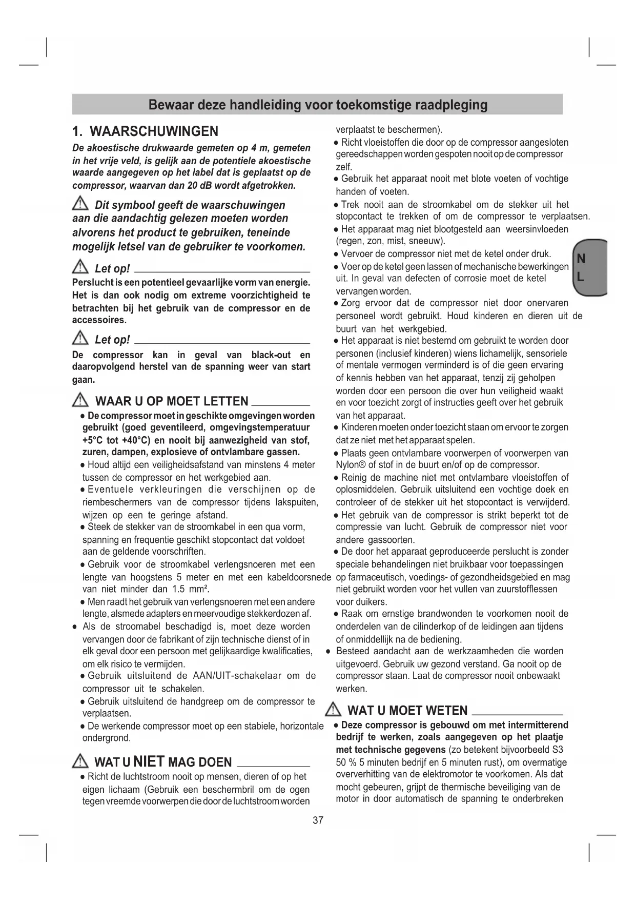De akoestische drukwaarde gemeten op 4 m, gemeten in het vrije veld, is gelijk aan de potentiele akoestische waarde aangegeven op het label dat is geplaatst op de compressor, waarvan dan 20 dB wordt afgetrokken. Dit symbool geeft de waarschuwingen aan die aandachtig gelezen moeten worden alvorens het product te gebruiken, teneinde mogelijk letsel van de gebruiker te voorkomen. Let op! Perslucht is een potentieel gevaarlijke vorm van energie. Het is dan ook nodig om extreme voorzichtigheid te betrachten bij het gebruik van de compressor en de accessoires. Let op! De compressor kan in geval van black-out en daaropvolgend herstel van de spanning weer van start gaan.