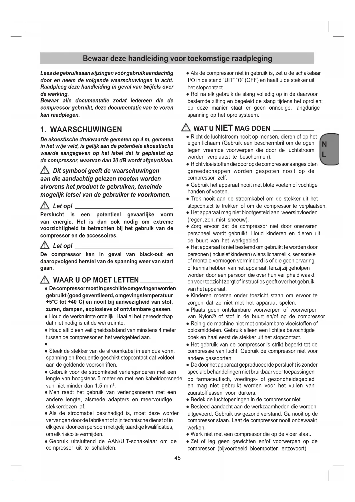 ● Richt de luchtstroom nooit op mensen, dieren of op het eigen lichaam (Gebruik een beschermbril om de ogen tegen vreemde voorwerpen die door de luchtstroom worden verplaatst te beschermen). ● Richt vloeistoffen die door op de compressor aangesloten gereedschappen worden gespoten nooit op de compressor zelf. ● Gebruik het apparaat nooit met blote voeten of vochtige handen of voeten. ● Trek nooit aan de stroomkabel om de stekker uit het stopcontact te trekken of om de compressor te verplaatsen. ● Het apparaat mag niet blootgesteld aan weersinvloeden (regen, zon, mist, sneeuw). ● Zorg ervoor dat de compressor niet door onervaren personeel wordt gebruikt. Houd kinderen en dieren uit de buurt van het werkgebied. ● Het apparaat is niet bestemd om gebruikt te worden door personen (inclusief kinderen) wiens lichamelijk, sensoriele of mentale vermogen verminderd is of die geen ervaring of kennis hebben van het apparaat, tenzij zij geholpen worden door een persoon die over hun veiligheid waakt en voor toezicht zorgt of instructies geeft over het gebruik van het apparaat. ● Kinderen moeten onder toezicht staan om ervoor te zorgen dat ze niet met het apparaat spelen. ● Plaats geen ontvlambare voorwerpen of voorwerpen van Nylon® of stof in de buurt en/of op de compressor. ● Reinig de machine niet met ontvlambare vloeistoffen of oplosmiddelen. Gebruik alleen een lichtjes bevochtigde doek en haal eerst de stekker uit het stopcontact. ● Het gebruik van de compressor is strikt beperkt tot de compressie van lucht. Gebruik de compressor niet voor andere gassoorten. ● De door het apparaat geproduceerde perslucht is zonder speciale behandelingen niet bruikbaar voor toepassingen op farmaceutisch, voedings- of gezondheidsgebied en mag niet gebruikt worden voor het vullen van zuurstofessen voor duikers. ● Bedek de luchtopeningen in de compressor niet. ● Besteed aandacht aan de werkzaamheden die worden uitgevoerd. Gebruik uw gezond verstand. Ga nooit op de compressor staan. Laat de compressor nooit onbewaakt werken. ● Werk niet met een compressor die op de vloer staat. ● Zet of leg geen gewichten en/of voorwerpen op de compressor (bijvoorbeeld bloempotten enzovoort).46