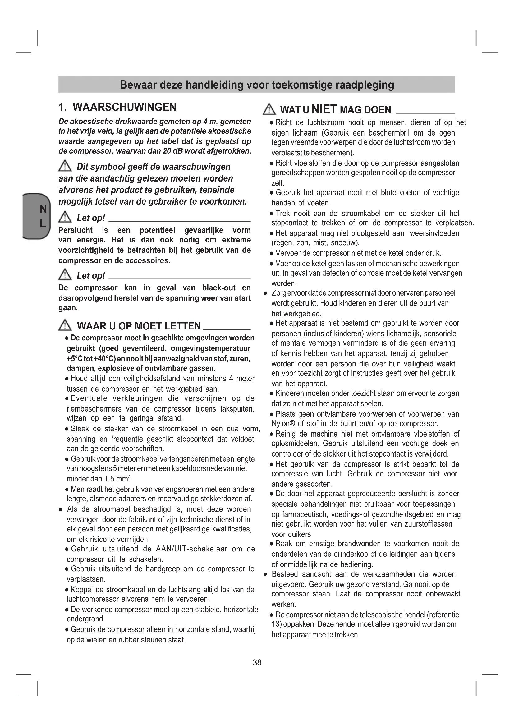 De akoestische drukwaarde gemeten op 4 m, gemeten in het vrije veld, is gelijk aan de potentiele akoestische waarde aangegeven op het label dat is geplaatst op de compressor, waarvan dan 20 dB wordt afgetrokken. Dit symbool geeft de waarschuwingen aan die aandachtig gelezen moeten worden alvorens het product te gebruiken, teneinde mogelijk letsel van de gebruiker te voorkomen. Let op! Perslucht is een potentieel gevaarlijke vorm van energie. Het is dan ook nodig om extreme voorzichtigheid te betrachten bij het gebruik van de compressor en de accessoires. Let op! De compressor kan in geval van black-out en daaropvolgend herstel van de spanning weer van start gaan.