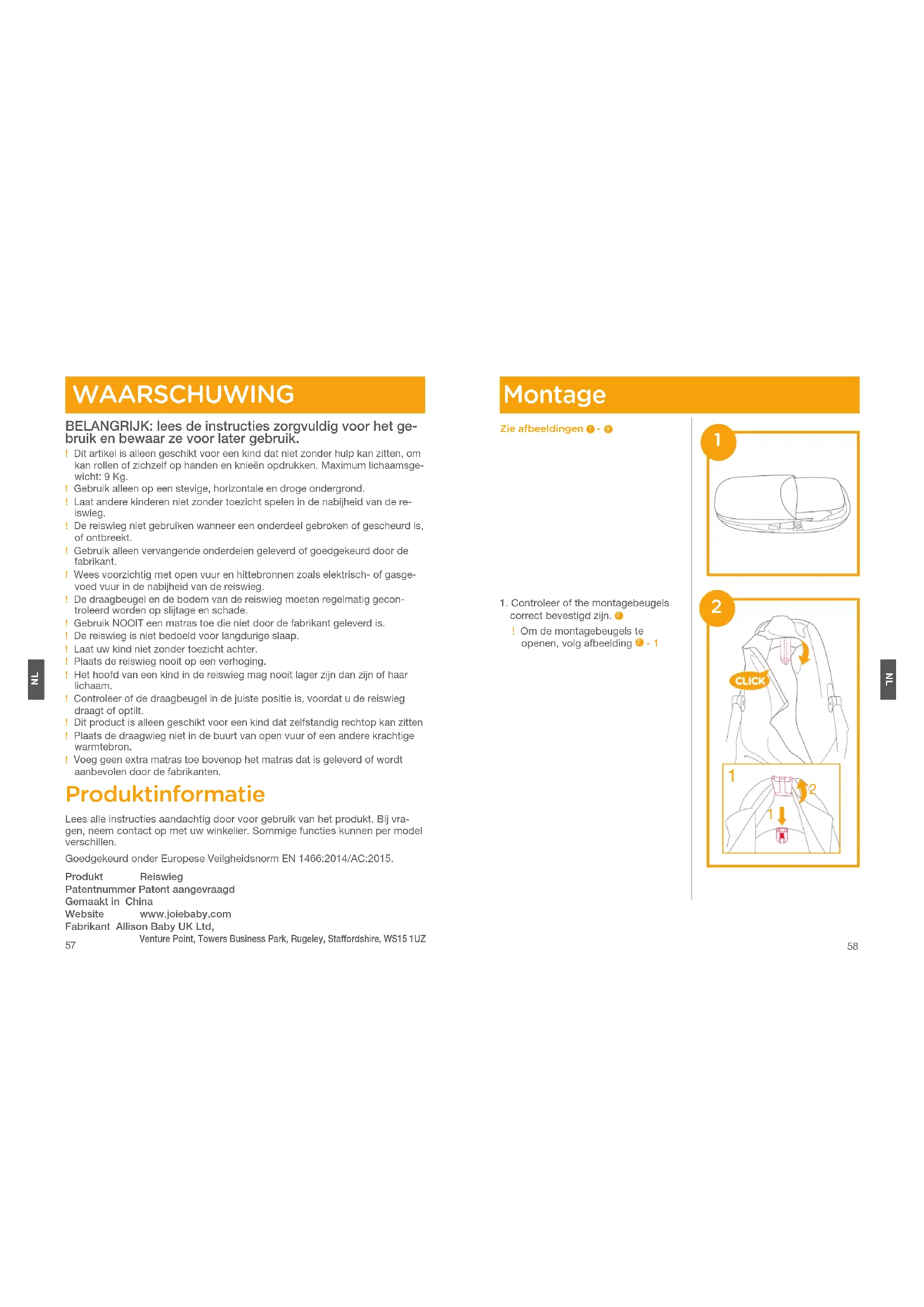 WAARSCHUWING BELANGRIJK: lees de instructies zorgvuldig voor het ge-bruik en bewaar ze voor later gebruik.! Dit artikel is alleen geschikt voor een kind dat niet zonder hulp kan zitten, om kan rollen of zichzelf op handen en knieën opdrukken. Maximum lichaamsge-wicht: 9 Kg.! Gebruik alleen op een stevige, horizontale en droge ondergrond.! Laat andere kinderen niet zonder toezicht spelen in de nabijheid van de re-iswieg.! De reiswieg niet gebruiken wanneer een onderdeel gebroken of gescheurd is, of ontbreekt.! Gebruik alleen vervangende onderdelen geleverd of goedgekeurd door de fabrikant.! Wees voorzichtig met open vuur en hittebronnen zoals elektrisch- of gasge-voed vuur in de nabijheid van de reiswieg.! De draagbeugel en de bodem van de reiswieg moeten regelmatig gecon-troleerd worden op slijtage en schade.! Gebruik NOOIT een matras toe die niet door de fabrikant geleverd is.! De reiswieg is niet bedoeld voor langdurige slaap.! Laat uw kind niet zonder toezicht achter.! Plaats de reiswieg nooit op een verhoging.! Het hoofd van een kind in de reiswieg mag nooit lager zijn dan zijn of haar lichaam.! Controleer of de draagbeugel in de juiste positie is, voordat u de reiswieg draagt of optilt.! Dit product is alleen geschikt voor een kind dat zelfstandig rechtop kan zitten! Plaats de draagwieg niet in de buurt van open vuur of een andere krachtige warmtebron.! Voeg geen extra matras toe bovenop het matras dat is geleverd of wordt aanbevolen door de fabrikanten. Produktinformatie Lees alle instructies aandachtig door voor gebruik van het produkt. Bij vra-gen, neem contact op met uw winkelier. Sommige functies kunnen per model verschillen.Goedgekeurd onder Europese Veilgheidsnorm EN 1466:2014/AC:2015. Produkt ReiswiegPatentnummer Patent aangevraagdGemaakt in ChinaWebsite www.joiebaby.comFabrikant Allison Baby UK Ltd, Venture Point, Towers Business Park, Rugeley, Staffordshire, WS15 1UZ Montage Zie afbeeldingen