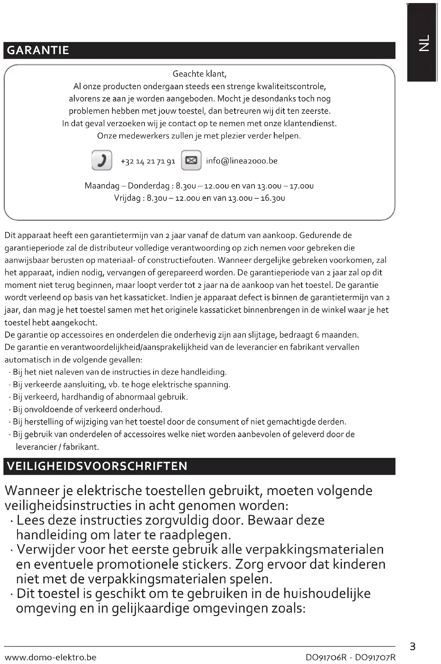 GARANTIE Geachte klant, Al onze producten ondergaan steeds een strenge kwaliteitscontrole, alvorens ze aan je worden aangeboden. Mocht je desondanks toch nog problemen hebben met jouw toestel, dan betreuren wij dit ten zeerste. In dat geval verzoeken wij je contact op te nemen met onze klantendienst. Onze medewerkers zullen je met plezier verder helpen. +32 14 21 71 91 info@linea2000.be Maandag – Donderdag : 8.30u – 12.00u en van 13.00u – 17.00u Vrijdag : 8.30u – 12.00u en van 13.00u – 16.30u Dit apparaat heeft een garantietermijn van 2 jaar vanaf de datum van aankoop. Gedurende de garantieperiode zal de distributeur volledige verantwoording op zich nemen voor gebreken die aanwijsbaar berusten op materiaal- of constructiefouten. Wanneer dergelijke gebreken voorkomen, zal het apparaat, indien nodig, vervangen of gerepareerd worden. De garantieperiode van 2 jaar zal op dit moment niet terug beginnen, maar loopt verder tot 2 jaar na de aankoop van het toestel. De garantie wordt verleend op basis van het kassaticket. Indien je apparaat defect is binnen de garantietermijn van 2 jaar, dan mag je het toestel samen met het originele kassaticket binnenbrengen in de winkel waar je het toestel hebt aangekocht. De garantie op accessoires en onderdelen die onderhevig zijn aan slijtage, bedraagt 6 maanden. De garantie en verantwoordelijkheid/aansprakelijkheid van de leverancier en fabrikant vervallen automatisch in de volgende gevallen: