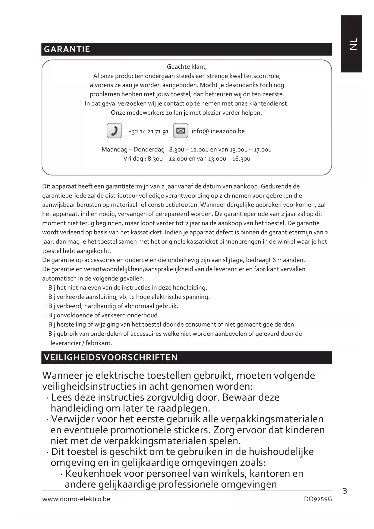 GARANTIE Geachte klant, Al onze producten ondergaan steeds een strenge kwaliteitscontrole, alvorens ze aan je worden aangeboden. Mocht je desondanks toch nog problemen hebben met jouw toestel, dan betreuren wij dit ten zeerste. In dat geval verzoeken wij je contact op te nemen met onze klantendienst. Onze medewerkers zullen je met plezier verder helpen. +32 14 21 71 91 info@linea2000.be Maandag – Donderdag : 8.30u – 12.00u en van 13.00u – 17.00u Vrijdag : 8.30u – 12.00u en van 13.00u – 16.30u Dit apparaat heeft een garantietermijn van 2 jaar vanaf de datum van aankoop. Gedurende de garantieperiode zal de distributeur volledige verantwoording op zich nemen voor gebreken die aanwijsbaar berusten op materiaal- of constructiefouten. Wanneer dergelijke gebreken voorkomen, zal het apparaat, indien nodig, vervangen of gerepareerd worden. De garantieperiode van 2 jaar zal op dit moment niet terug beginnen, maar loopt verder tot 2 jaar na de aankoop van het toestel. De garantie wordt verleend op basis van het kassaticket. Indien je apparaat defect is binnen de garantietermijn van 2 jaar, dan mag je het toestel samen met het originele kassaticket binnenbrengen in de winkel waar je het toestel hebt aangekocht. De garantie op accessoires en onderdelen die onderhevig zijn aan slijtage, bedraagt 6 maanden. De garantie en verantwoordelijkheid/aansprakelijkheid van de leverancier en fabrikant vervallen automatisch in de volgende gevallen: