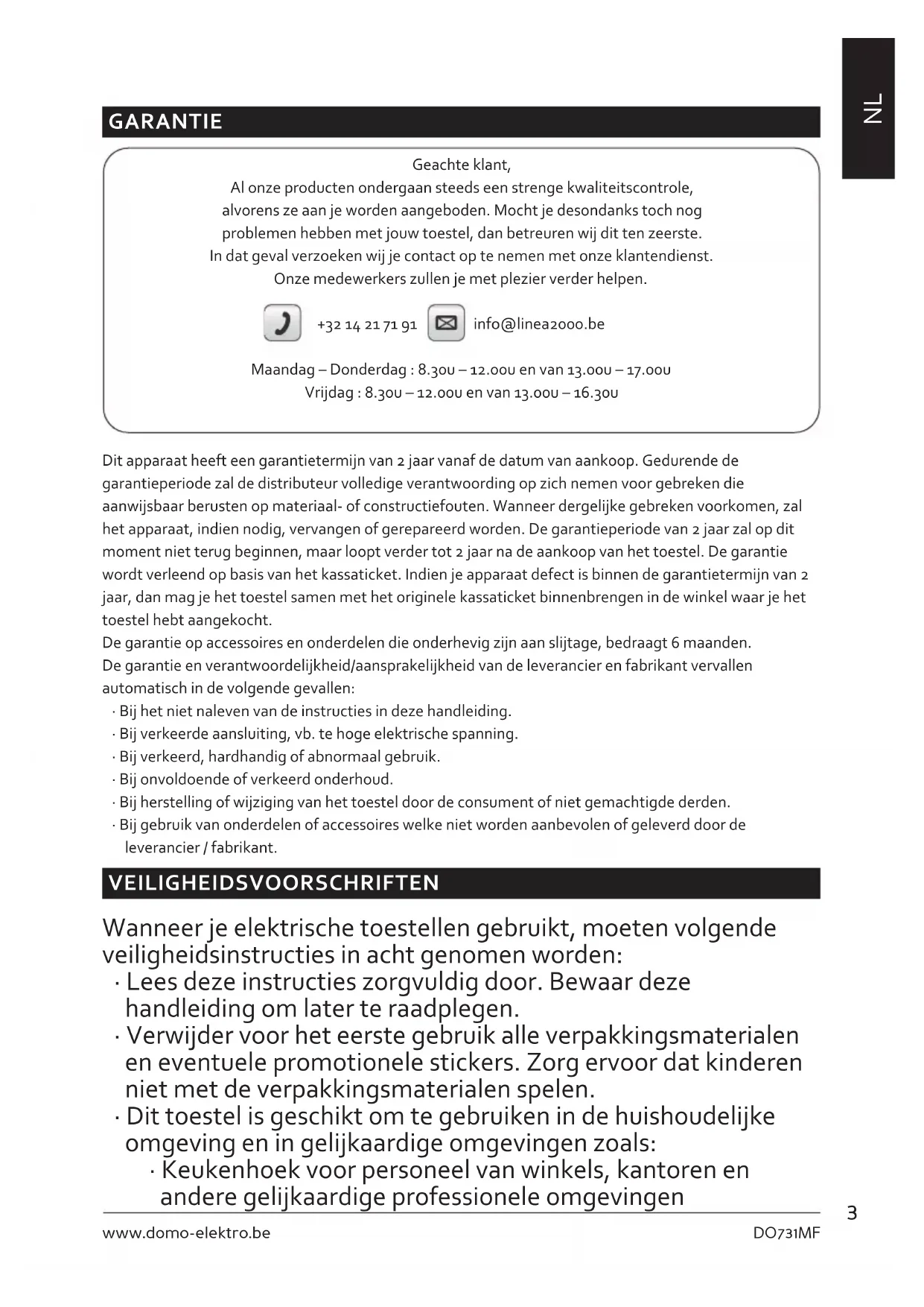 GARANTIE Geachte klant, Al onze producten ondergaan steeds een strenge kwaliteitscontrole, alvorens ze aan je worden aangeboden. Mocht je desondanks toch nog problemen hebben met jouw toestel, dan betreuren wij dit ten zeerste. In dat geval verzoeken wij je contact op te nemen met onze klantendienst. Onze medewerkers zullen je met plezier verder helpen. +32 14 21 71 91 info@linea2000.be Maandag – Donderdag : 8.30u – 12.00u en van 13.00u – 17.00u Vrijdag : 8.30u – 12.00u en van 13.00u – 16.30u Dit apparaat heeft een garantietermijn van 2 jaar vanaf de datum van aankoop. Gedurende de garantieperiode zal de distributeur volledige verantwoording op zich nemen voor gebreken die aanwijsbaar berusten op materiaal- of constructiefouten. Wanneer dergelijke gebreken voorkomen, zal het apparaat, indien nodig, vervangen of gerepareerd worden. De garantieperiode van 2 jaar zal op dit moment niet terug beginnen, maar loopt verder tot 2 jaar na de aankoop van het toestel. De garantie wordt verleend op basis van het kassaticket. Indien je apparaat defect is binnen de garantietermijn van 2 jaar, dan mag je het toestel samen met het originele kassaticket binnenbrengen in de winkel waar je het toestel hebt aangekocht. De garantie op accessoires en onderdelen die onderhevig zijn aan slijtage, bedraagt 6 maanden. De garantie en verantwoordelijkheid/aansprakelijkheid van de leverancier en fabrikant vervallen automatisch in de volgende gevallen: