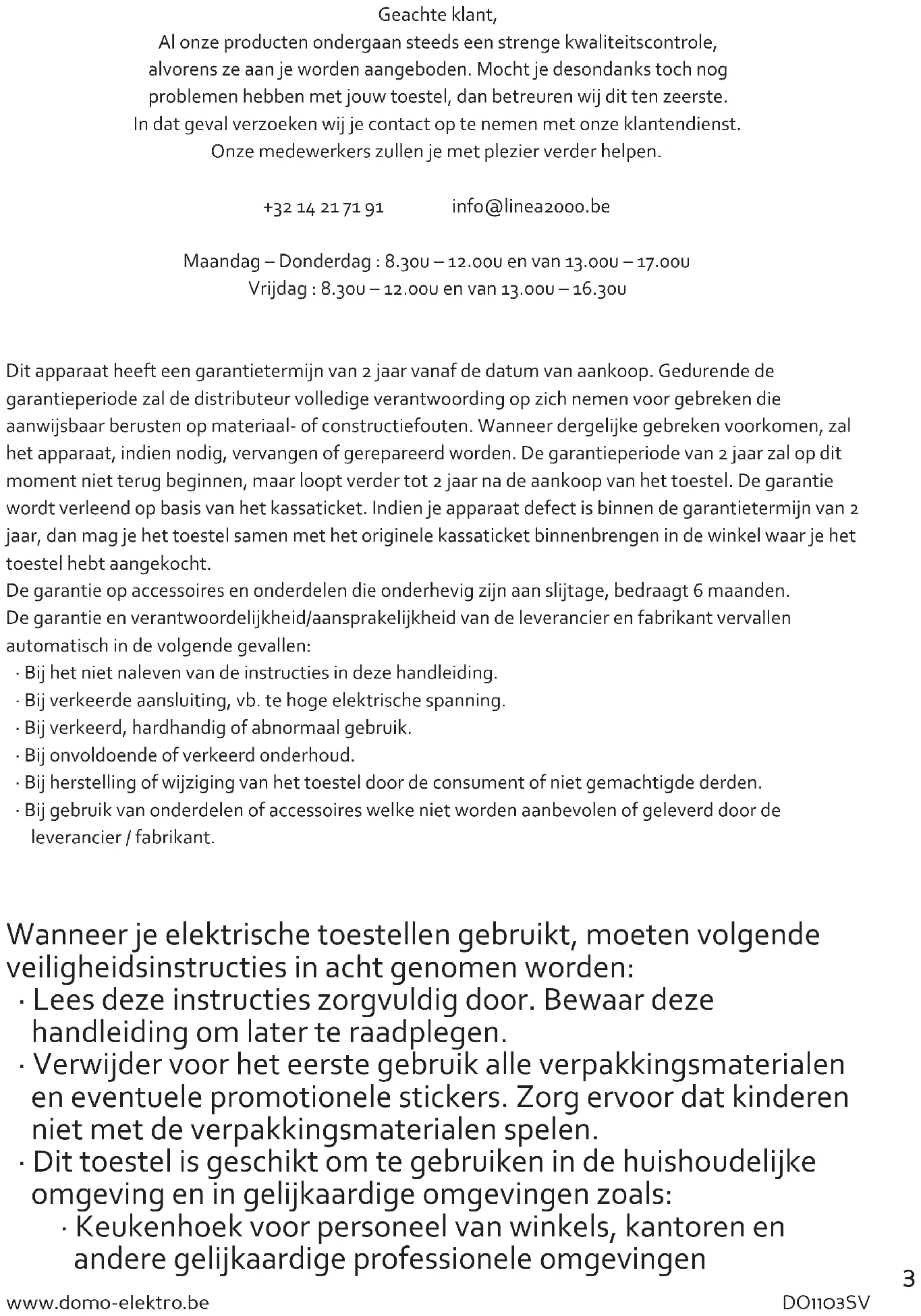 GARANTIE Geachte klant, Al onze producten ondergaan steeds een strenge kwaliteitscontrole, alvorens ze aan je worden aangeboden. Mocht je desondanks toch nog problemen hebben met jouw toestel, dan betreuren wij dit ten zeerste. In dat geval verzoeken wij je contact op te nemen met onze klantendienst. Onze medewerkers zullen je met plezier verder helpen. +32 14 21 71 91 info@linea2000.be Maandag – Donderdag : 8.30u – 12.00u en van 13.00u – 17.00u Vrijdag : 8.30u – 12.00u en van 13.00u – 16.30u Dit apparaat heeft een garantietermijn van 2 jaar vanaf de datum van aankoop. Gedurende de garantieperiode zal de distributeur volledige verantwoording op zich nemen voor gebreken die aanwijsbaar berusten op materiaal- of constructiefouten. Wanneer dergelijke gebreken voorkomen, zal het apparaat, indien nodig, vervangen of gerepareerd worden. De garantieperiode van 2 jaar zal op dit moment niet terug beginnen, maar loopt verder tot 2 jaar na de aankoop van het toestel. De garantie wordt verleend op basis van het kassaticket. Indien je apparaat defect is binnen de garantietermijn van 2 jaar, dan mag je het toestel samen met het originele kassaticket binnenbrengen in de winkel waar je het toestel hebt aangekocht. De garantie op accessoires en onderdelen die onderhevig zijn aan slijtage, bedraagt 6 maanden. De garantie en verantwoordelijkheid/aansprakelijkheid van de leverancier en fabrikant vervallen automatisch in de volgende gevallen:
