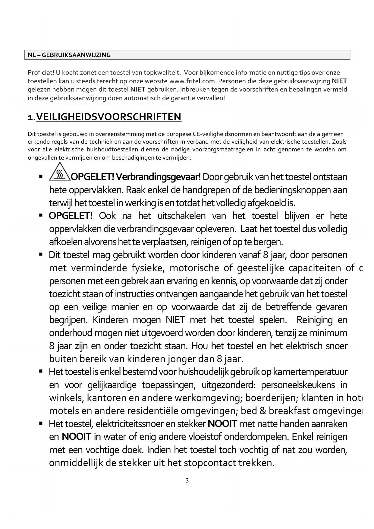 NL – GEBRUIKSAANWIJZING Proficiat! U kocht zonet een toestel van topkwaliteit. Voor bijkomende informatie en nuttige tips over onze toestellen kan u steeds terecht op onze website www.fritel.com. Personen die deze gebruiksaanwijzing NIET gelezen hebben mogen dit toestel NIET gebruiken. Inbreuken tegen de voorschriften en bepalingen vermeld in deze gebruiksaanwijzing doen automatisch de garantie vervallen! 1.VEILIGHEIDSVOORSCHRIFTEN Dit toestel is gebouwd in overeenstemming met de Europese CE-veiligheidsnormen en beantwoordt aan de algemeen erkende regels van de techniek en aan de voorschriften in verband met de veiligheid van elektrische toestellen. Zoals voor alle elektrische huishoudtoestellen dienen de nodige voorzorgsmaatregelen in acht genomen te worden om ongevallen te vermijden en om beschadigingen te vermijden.
