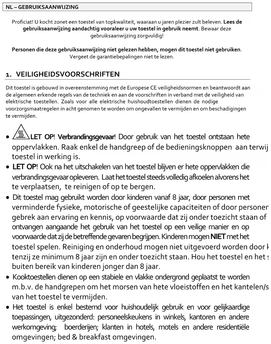 NL – GEBRUIKSAANWIJZING Proficiat! U kocht zonet een toestel van topkwaliteit, waaraan u jaren plezier zult beleven. Lees de gebruiksaanwijzing aandachtig vooraleer u uw toestel in gebruik neemt. Bewaar deze gebruiksaanwijzing zorgvuldig! Personen die deze gebruiksaanwijzing niet gelezen hebben, mogen dit toestel niet gebruiken. Vergeet de garantiebepalingen niet te lezen.