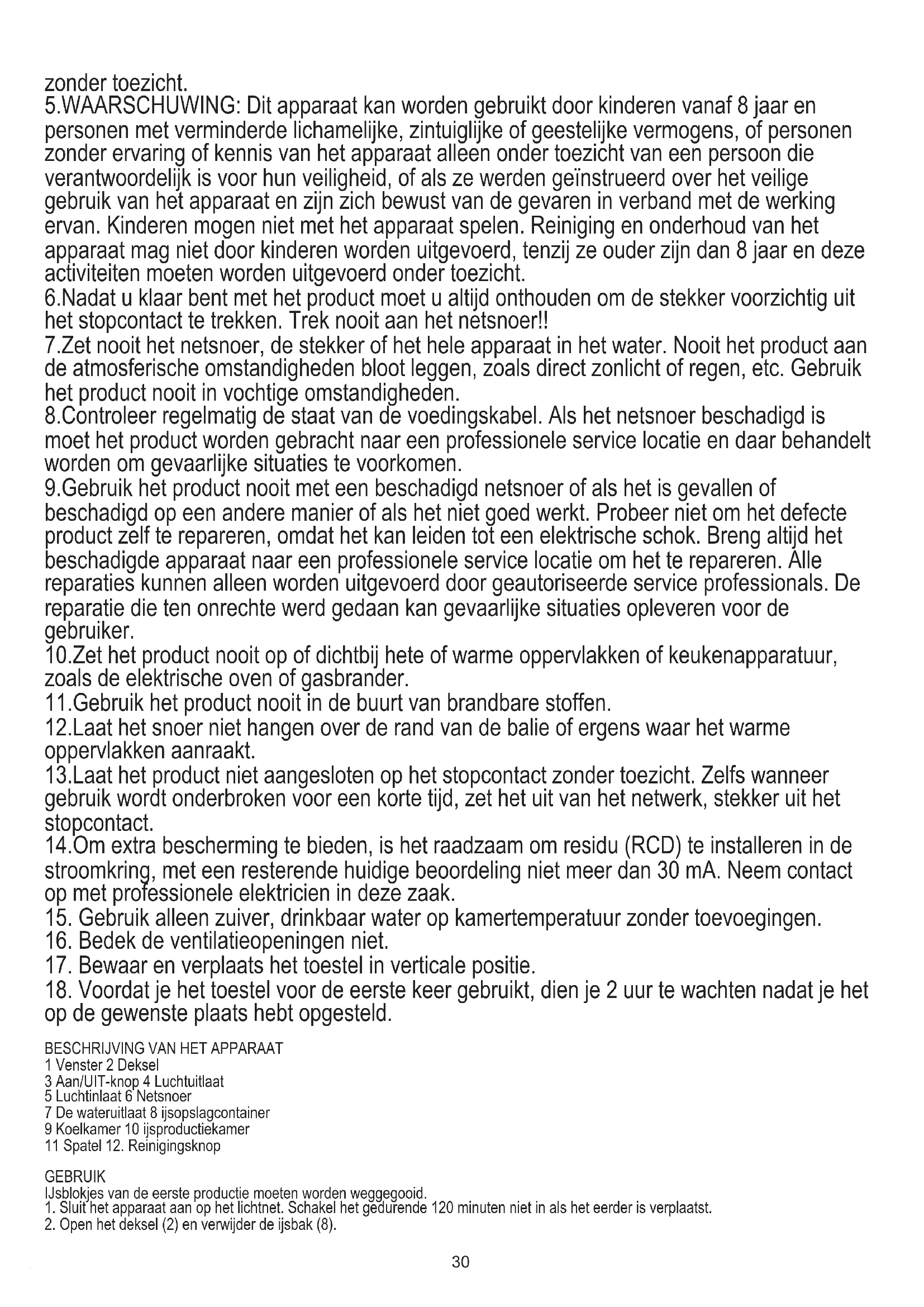 zonder toezicht. 7.Zet nooit het netsnoer, de stekker of het hele apparaat in het water. Nooit het product aan de atmosferische omstandigheden bloot leggen, zoals direct zonlicht of regen, etc. Gebruik het product nooit in vochtige omstandigheden. 6.Nadat u klaar bent met het product moet u altijd onthouden om de stekker voorzichtig uit het stopcontact te trekken. Trek nooit aan het netsnoer!! 5.WAARSCHUWING: Dit apparaat kan worden gebruikt door kinderen vanaf 8 jaar en personen met verminderde lichamelijke, zintuiglijke of geestelijke vermogens, of personen zonder ervaring of kennis van het apparaat alleen onder toezicht van een persoon die verantwoordelijk is voor hun veiligheid, of als ze werden geïnstrueerd over het veilige gebruik van het apparaat en zijn zich bewust van de gevaren in verband met de werking ervan. Kinderen mogen niet met het apparaat spelen. Reiniging en onderhoud van het apparaat mag niet door kinderen worden uitgevoerd, tenzij ze ouder zijn dan 8 jaar en deze activiteiten moeten worden uitgevoerd onder toezicht. 8.Controleer regelmatig de staat van de voedingskabel. Als het netsnoer beschadigd is moet het product worden gebracht naar een professionele service locatie en daar behandelt worden om gevaarlijke situaties te voorkomen. 9.Gebruik het product nooit met een beschadigd netsnoer of als het is gevallen of beschadigd op een andere manier of als het niet goed werkt. Probeer niet om het defecte product zelf te repareren, omdat het kan leiden tot een elektrische schok. Breng altijd het beschadigde apparaat naar een professionele service locatie om het te repareren. Alle reparaties kunnen alleen worden uitgevoerd door geautoriseerde service professionals. De reparatie die ten onrechte werd gedaan kan gevaarlijke situaties opleveren voor de gebruiker. 10.Zet het product nooit op of dichtbij hete of warme oppervlakken of keukenapparatuur, zoals de elektrische oven of gasbrander. 11.Gebruik het product nooit in de buurt van brandbare stoffen. 12.Laat het snoer niet hangen over de rand van de balie of ergens waar het warme oppervlakken aanraakt. 13.Laat het product niet aangesloten op het stopcontact zonder toezicht. Zelfs wanneer gebruik wordt onderbroken voor een korte tijd, zet het uit van het netwerk, stekker uit het stopcontact. 14.Om extra bescherming te bieden, is het raadzaam om residu (RCD) te installeren in de stroomkring, met een resterende huidige beoordeling niet meer dan 30 mA. Neem contact op met professionele elektricien in deze zaak.