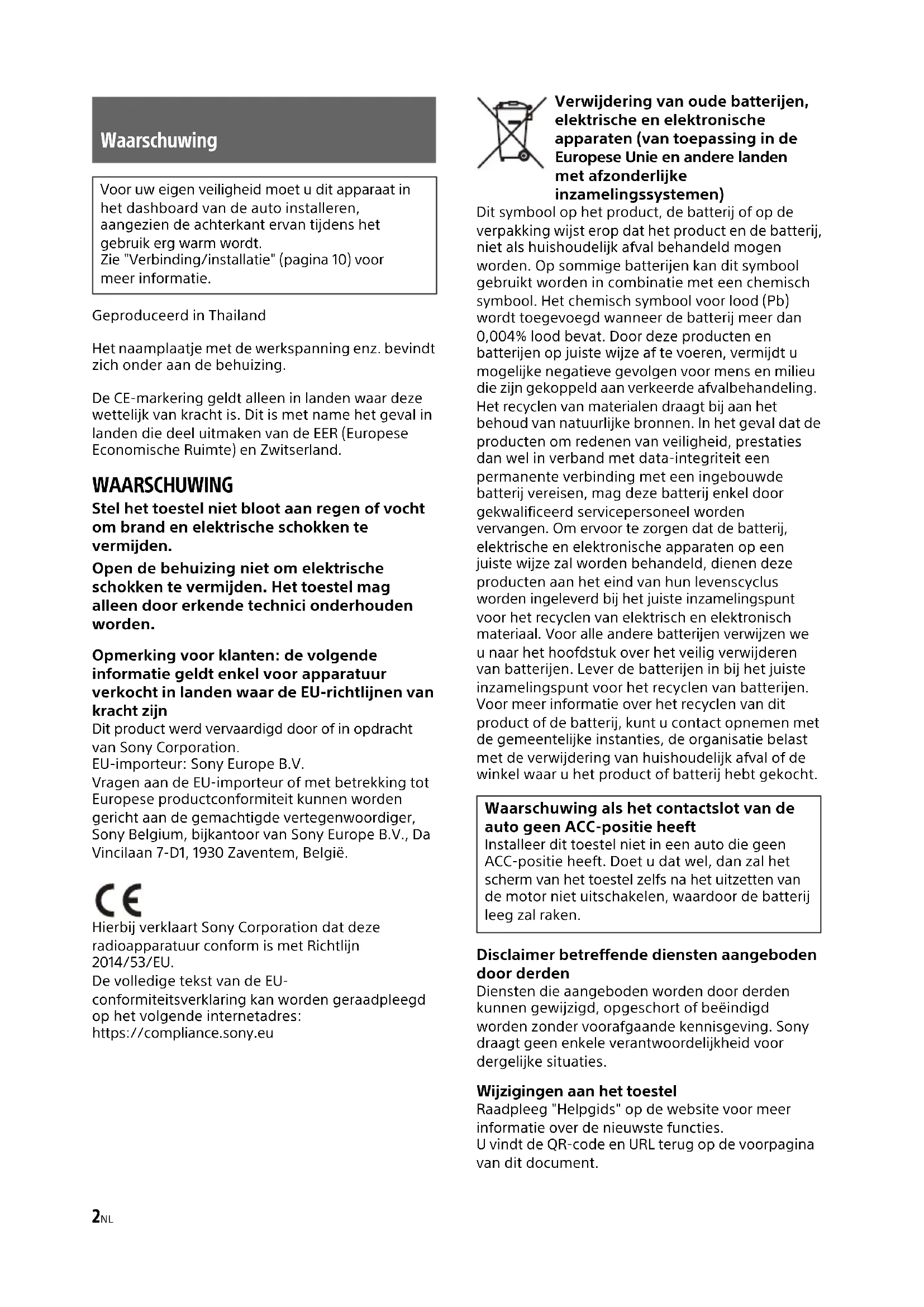 sponder a ninguna consulta sobre el contenido del código fuente.2NL Geproduceerd in Thailand Het naamplaatje met de werkspanning enz. bevindt zich onder aan de behuizing. De CE-markering geldt alleen in landen waar deze wettelijk van kracht is. Dit is met name het geval in landen die deel uitmaken van de EER (Europese Economische Ruimte) en Zwitserland. WAARSCHUWING Stel het toestel niet bloot aan regen of vocht om brand en elektrische schokken te vermijden. Open de behuizing niet om elektrische schokken te vermijden. Het toestel mag alleen door erkende technici onderhouden worden. Opmerking voor klanten: de volgende informatie geldt enkel voor apparatuur verkocht in landen waar de EU-richtlijnen van kracht zijn Dit product werd vervaardigd door of in opdracht van Sony Corporation. EU-importeur: Sony Europe B.V. Vragen aan de EU-importeur of met betrekking tot Europese productconformiteit kunnen worden gericht aan de gemachtigde vertegenwoordiger, Sony Belgium, bijkantoor van Sony Europe B.V., Da Vincilaan 7-D1, 1930 Zaventem, België. Hierbij verklaart Sony Corporation dat deze radioapparatuur conform is met Richtlijn 2014/53/EU. De volledige tekst van de EU- conformiteitsverklaring kan worden geraadpleegd op het volgende internetadres: https://compliance.sony.eu Verwijdering van oude batterijen, elektrische en elektronische apparaten (van toepassing in de Europese Unie en andere landen met afzonderlijke inzamelingssystemen) Dit symbool op het product, de batterij of op de verpakking wijst erop dat het product en de batterij, niet als huishoudelijk afval behandeld mogen worden. Op sommige batterijen kan dit symbool gebruikt worden in combinatie met een chemisch symbool. Het chemisch symbool voor lood (Pb) wordt toegevoegd wanneer de batterij meer dan 0,004% lood bevat. Door deze producten en batterijen op juiste wijze af te voeren, vermijdt u mogelijke negatieve gevolgen voor mens en milieu die zijn gekoppeld aan verkeerde afvalbehandeling. Het recyclen van materialen draagt bij aan het behoud van natuurlijke bronnen. In het geval dat de producten om redenen van veiligheid, prestaties dan wel in verband met data-integriteit een permanente verbinding met een ingebouwde batterij vereisen, mag deze batterij enkel door gekwalificeerd servicepersoneel worden vervangen. Om ervoor te zorgen dat de batterij, elektrische en elektronische apparaten op een juiste wijze zal worden behandeld, dienen deze producten aan het eind van hun levenscyclus worden ingeleverd bij het juiste inzamelingspunt voor het recyclen van elektrisch en elektronisch materiaal. Voor alle andere batterijen verwijzen we u naar het hoofdstuk over het veilig verwijderen van batterijen. Lever de batterijen in bij het juiste inzamelingspunt voor het recyclen van batterijen. Voor meer informatie over het recyclen van dit product of de batterij, kunt u contact opnemen met de gemeentelijke instanties, de organisatie belast met de verwijdering van huishoudelijk afval of de winkel waar u het product of batterij hebt gekocht. Disclaimer betreffende diensten aangeboden door derden Diensten die aangeboden worden door derden kunnen gewijzigd, opgeschort of beëindigd worden zonder voorafgaande kennisgeving. Sony draagt geen enkele verantwoordelijkheid voor dergelijke situaties. Wijzigingen aan het toestel Raadpleeg "Helpgids" op de website voor meer informatie over de nieuwste functies. U vindt de QR-code en URL terug op de voorpagina van dit document. Waarschuwing Voor uw eigen veiligheid moet u dit apparaat in het dashboard van de auto installeren, aangezien de achterkant ervan tijdens het gebruik erg warm wordt. Zie "Verbinding/installatie" (pagina 10) voor meer informatie. Waarschuwing als het contactslot van de auto geen ACC-positie heeft Installeer dit toestel niet in een auto die geen ACC-positie heeft. Doet u dat wel, dan zal het scherm van het toestel zelfs na het uitzetten van de motor niet uitschakelen, waardoor de batterij leeg zal raken.3NL Opgelet