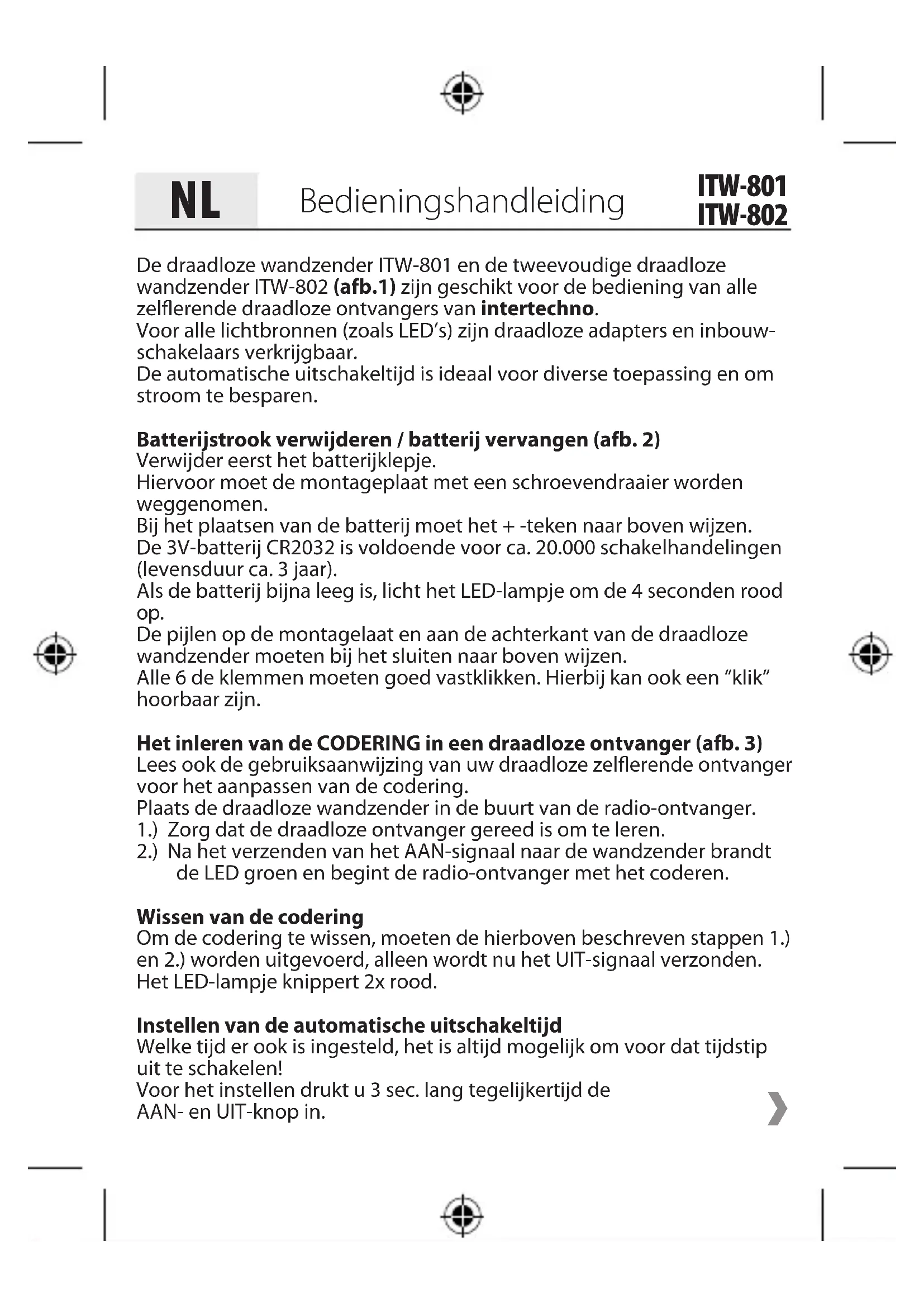 ITW-801 ITW-802De draadloze wandzender ITW-801 en de tweevoudige draadloze wandzender ITW-802 (afb.1) zijn geschikt voor de bediening van alle zelflerende draadloze ontvangers van intertechno. Voor alle lichtbronnen (zoals LED’s) zijn draadloze adapters en inbouw- schakelaars verkrijgbaar. De automatische uitschakeltijd is ideaal voor diverse toepassing en om stroom te besparen. Batterijstrook verwijderen / batterij vervangen (afb. 2) Verwijder eerst het batterijklepje. Hiervoor moet de montageplaat met een schroevendraaier worden weggenomen. Bij het plaatsen van de batterij moet het + -teken naar boven wijzen. De 3V-batterij CR2032 is voldoende voor ca. 20.000 schakelhandelingen (levensduur ca. 3 jaar). Als de batterij bijna leeg is, licht het LED-lampje om de 4 seconden rood op. De pijlen op de montagelaat en aan de achterkant van de draadloze wandzender moeten bij het sluiten naar boven wijzen. Alle 6 de klemmen moeten goed vastklikken. Hierbij kan ook een “klik” hoorbaar zijn. Het inleren van de CODERING in een draadloze ontvanger (afb. 3) Lees ook de gebruiksaanwijzing van uw draadloze zelflerende ontvanger voor het aanpassen van de codering. Plaats de draadloze wandzender in de buurt van de radio-ontvanger. 1.) Zorg dat de draadloze ontvanger gereed is om te leren. 2.) Na het verzenden van het AAN-signaal naar de wandzender brandt de LED groen en begint de radio-ontvanger met het coderen. Wissen van de codering Om de codering te wissen, moeten de hierboven beschreven stappen 1.) en 2.) worden uitgevoerd, alleen wordt nu het UIT-signaal verzonden. Het LED-lampje knippert 2x rood. Instellen van de automatische uitschakeltijd Welke tijd er ook is ingesteld, het is altijd mogelijk om voor dat tijdstip uit te schakelen! Voor het instellen drukt u 3 sec. lang tegelijkertijd de AAN- en UIT-knop in. Bedieningshandleiding