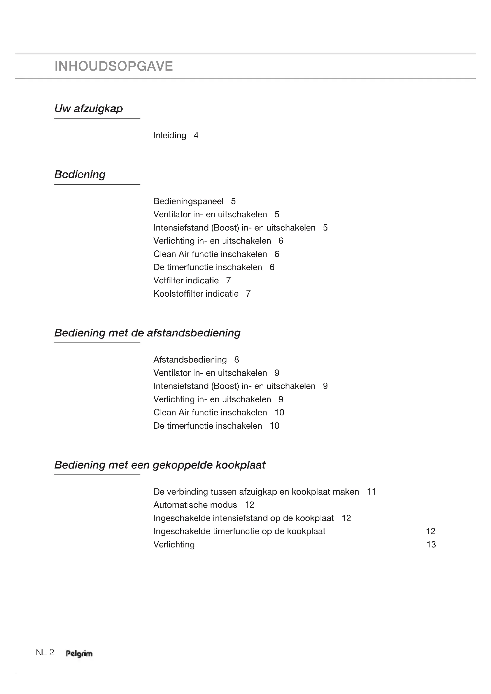 ISWA0960 ---INHOUDSOPGAVE Uw afzuigkap Inleiding 4 Bediening Bedieningspaneel 5 Ventilator in- en uitschakelen 5 Intensiefstand (Boost) in- en uitschakelen 5 Verlichting in- en uitschakelen 6 Clean Air functie inschakelen 6 De timerfunctie inschakelen 6 Vetfilter indicatie 7 Koolstoffilter indicatie 7 Bediening met de afstandsbediening Afstandsbediening 8 Ventilator in- en uitschakelen 9 Intensiefstand (Boost) in- en uitschakelen 9 Verlichting in- en uitschakelen 9 Clean Air functie inschakelen 10 De timerfunctie inschakelen 10 Bediening met een gekoppelde kookplaat De verbinding tussen afzuigkap en kookplaat maken 11 Automatische modus 12 Ingeschakelde intensiefstand op de kookplaat 12 Ingeschakelde timerfunctie op de kookplaat 12 Verlichting 13 NL 2NL 3 INHOUDSOPGAVE Onderhoud Reinigen 14 Afzuigkap 14 Roestvrijstalen schouwkappen 14 Metalen vetfilters 14 Vetfilters verwijderen 15 Het koolstoffilter vervangen 15 Verlichting 15 Milieuaspecten Verpakking en toestel afdanken 16 Gebruikte pictogrammen Belangrijke informatie Handig om te weten / Bon à savoir / Tipp / Nice to knowNL 4 Inleiding Gefeliciteerd met uw keuze voor deze afzuigkap van Pelgrim. In het ontwerp van dit product heeft eenvoudige bediening en optimale gebruiksvriendelijkheid centraal gestaan. Deze afzuigkap beschikt over AutoAir functionaliteit. Via een kookplaat met AutoAir functie kan de afzuiging op 3 verschillende manieren aangestuurd worden; handmatig, semi-automatisch en volledig automatisch. Kies de manier die het beste bij u past. Uiteraard is er altijd de mogelijkheid om de instellingen zelf aan te passen. In deze handleiding leest u hoe u dit toestel het best kunt gebruiken. Naast informatie over de bediening, vindt u hier ook achtergrondinformatie die u tijdens het gebruik van het toestel van pas kan komen. Lees eerst de separate veiligheidsinstructies voordat u het toestel gebruikt. Lees deze handleiding door voordat u het toestel in gebruik neemt, en berg de handleiding daarna veilig op voor toekomstig gebruik. Op onze website kunt u de meest recente versie van de gebruiksaanwijzing vinden. UW AFZUIGKAPNL 5 BEDIENING Bedieningspaneel De extra AutoAir functies die beschikbaar zijn als er een verbinding is gemaakt met een kookplaat, worden in een apart hoofdstuk beschreven (zie ‘Bediening met een gekoppelde kookplaat’). A B C D E A. Verlichtingstoets en timerfunctie B. Aan-/uittoets (Snelheid 1) C. Snelheidstoets 2 en Clean Air functie D. Snelheidstoets 3 en intensiefstand (Boost) E. Automatische modus toets Ventilator in- en uitschakelen