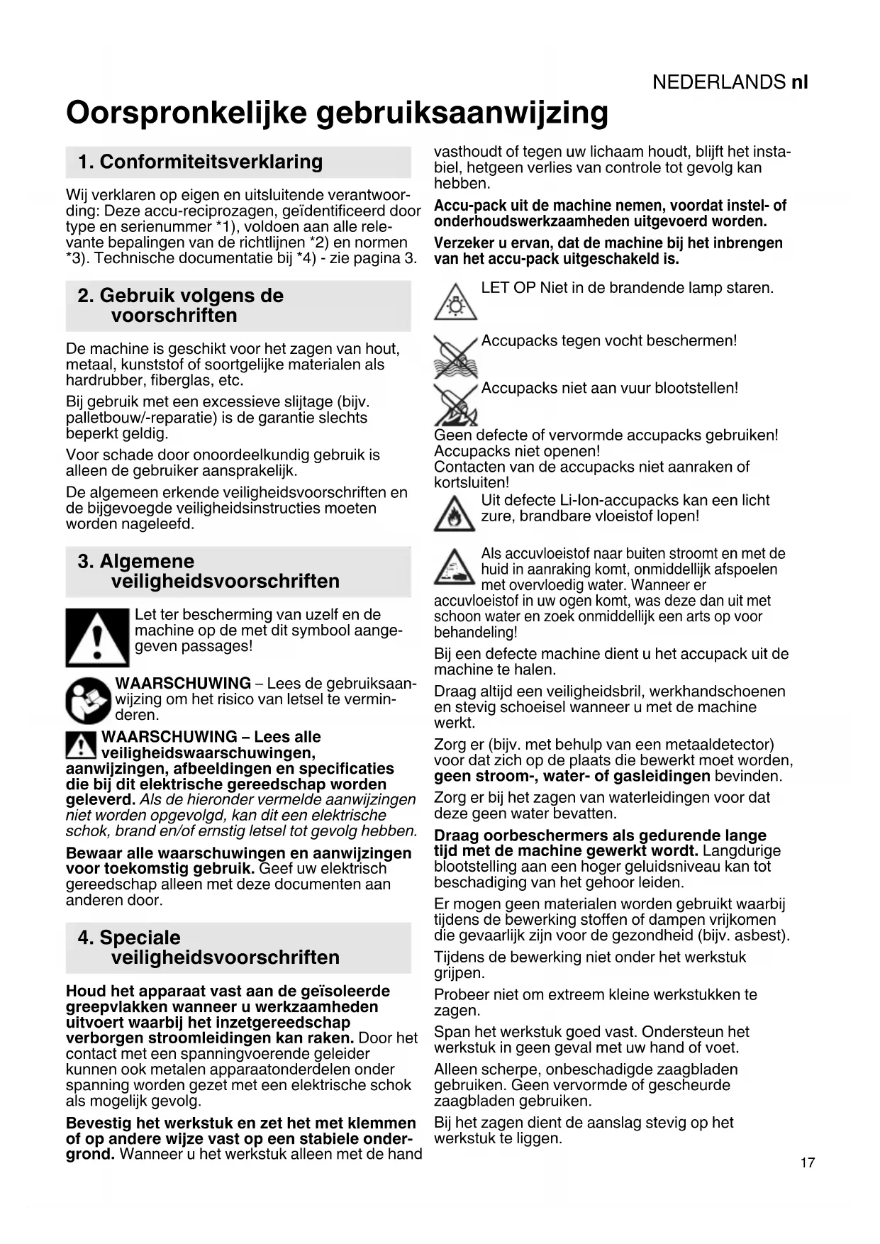 Oorspronkelijke gebruiksaanwijzing Wij verklaren op eigen en uitsluitende verantwoor- ding: Deze accu-reciprozagen, geïdentificeerd door type en serienummer *1), voldoen aan alle rele- vante bepalingen van de richtlijnen *2) en normen *3). Technische documentatie bij *4) - zie pagina 3. De machine is geschikt voor het zagen van hout, metaal, kunststof of soortgelijke materialen als hardrubber, fiberglas, etc. Bij gebruik met een excessieve slijtage (bijv. palletbouw/-reparatie) is de garantie slechts beperkt geldig. Voor schade door onoordeelkundig gebruik is alleen de gebruiker aansprakelijk. De algemeen erkende veiligheidsvoorschriften en de bijgevoegde veiligheidsinstructies moeten worden nageleefd. Let ter bescherming van uzelf en de machine op de met dit symbool aange- geven passages! WAARSCHUWING – Lees de gebruiksaan- wijzing om het risico van letsel te vermin- deren. WAARSCHUWING – Lees alle veiligheidswaarschuwingen, aanwijzingen, afbeeldingen en specificaties die bij dit elektrische gereedschap worden geleverd. Als de hieronder vermelde aanwijzingen niet worden opgevolgd, kan dit een elektrische schok, brand en/of ernstig letsel tot gevolg hebben. Bewaar alle waarschuwingen en aanwijzingen voor toekomstig gebruik. Geef uw elektrisch gereedschap alleen met deze documenten aan anderen door. Houd het apparaat vast aan de geïsoleerde greepvlakken wanneer u werkzaamheden uitvoert waarbij het inzetgereedschap verborgen stroomleidingen kan raken. Door het contact met een spanningvoerende geleider kunnen ook metalen apparaatonderdelen onder spanning worden gezet met een elektrische schok als mogelijk gevolg. Bevestig het werkstuk en zet het met klemmen of op andere wijze vast op een stabiele onder- grond. Wanneer u het werkstuk alleen met de hand vasthoudt of tegen uw lichaam houdt, blijft het insta- biel, hetgeen verlies van controle tot gevolg kan hebben. Accu-pack uit de machine nemen, voordat instel- of onderhoudswerkzaamheden uitgevoerd worden. Verzeker u ervan, dat de machine bij het inbrengen van het accu-pack uitgeschakeld is. LET OP Niet in de brandende lamp staren. Accupacks tegen vocht beschermen! Accupacks niet aan vuur blootstellen! Geen defecte of vervormde accupacks gebruiken! Accupacks niet openen! Contacten van de accupacks niet aanraken of kortsluiten! Uit defecte Li-Ion-accupacks kan een licht zure, brandbare vloeistof lopen! Als accuvloeistof naar buiten stroomt en met de huid in aanraking komt, onmiddellijk afspoelen met overvloedig water. Wanneer er accuvloeistof in uw ogen komt, was deze dan uit met schoon water en zoek onmiddellijk een arts op voor behandeling! Bij een defecte machine dient u het accupack uit de machine te halen. Draag altijd een veiligheidsbril, werkhandschoenen en stevig schoeisel wanneer u met de machine werkt. Zorg er (bijv. met behulp van een metaaldetector) voor dat zich op de plaats die bewerkt moet worden, geen stroom-, water- of gasleidingen bevinden. Zorg er bij het zagen van waterleidingen voor dat deze geen water bevatten. Draag oorbeschermers als gedurende lange tijd met de machine gewerkt wordt. Langdurige blootstelling aan een hoger geluidsniveau kan tot beschadiging van het gehoor leiden. Er mogen geen materialen worden gebruikt waarbij tijdens de bewerking stoffen of dampen vrijkomen die gevaarlijk zijn voor de gezondheid (bijv. asbest). Tijdens de bewerking niet onder het werkstuk grijpen. Probeer niet om extreem kleine werkstukken te zagen. Span het werkstuk goed vast. Ondersteun het werkstuk in geen geval met uw hand of voet. Alleen scherpe, onbeschadigde zaagbladen gebruiken. Geen vervormde of gescheurde zaagbladen gebruiken. Bij het zagen dient de aanslag stevig op het werkstuk te liggen.