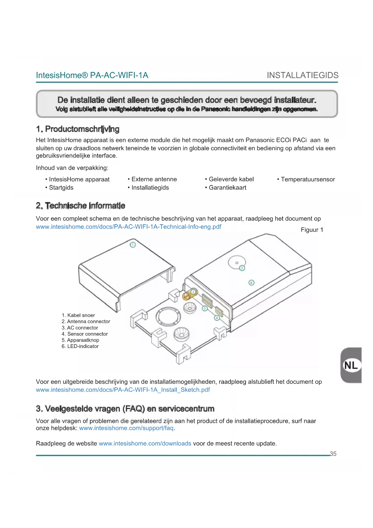 Het IntesisHome apparaat is een externe module die het mogelijk maakt om Panasonic ECOi PACi aan te sluiten op uw draadloos netwerk teneinde te voorzien in globale connectiviteit en bediening op afstand via een gebruiksvriendelijke interface. Inhoud van de verpakking: Voor een compleet schema en de technische beschrijving van het apparaat, raadpleeg het document op www.intesishome.com/docs/PA-AC-WIFI-1A-Technical-Info-eng.pdf Voor een uitgebreide beschrijving van de installatiemogelijkheden, raadpleeg alstublieft het document op www.intesishome.com/docs/PA-AC-WIFI-1A_Install_Sketch.pdf Voor alle vragen of problemen die gerelateerd zijn aan het product of de installatieprocedure, surf naar onze helpdesk: www.intesishome.com/support/faq. Raadpleeg de website www.intesishome.com/downloads voor de meest recente update. De installatie dient alleen te geschieden door een bevoegd installateur. Volg alstublieft alle veiligheidsinstructies op die in de Panasonic handleidingen zijn opgenomen.
