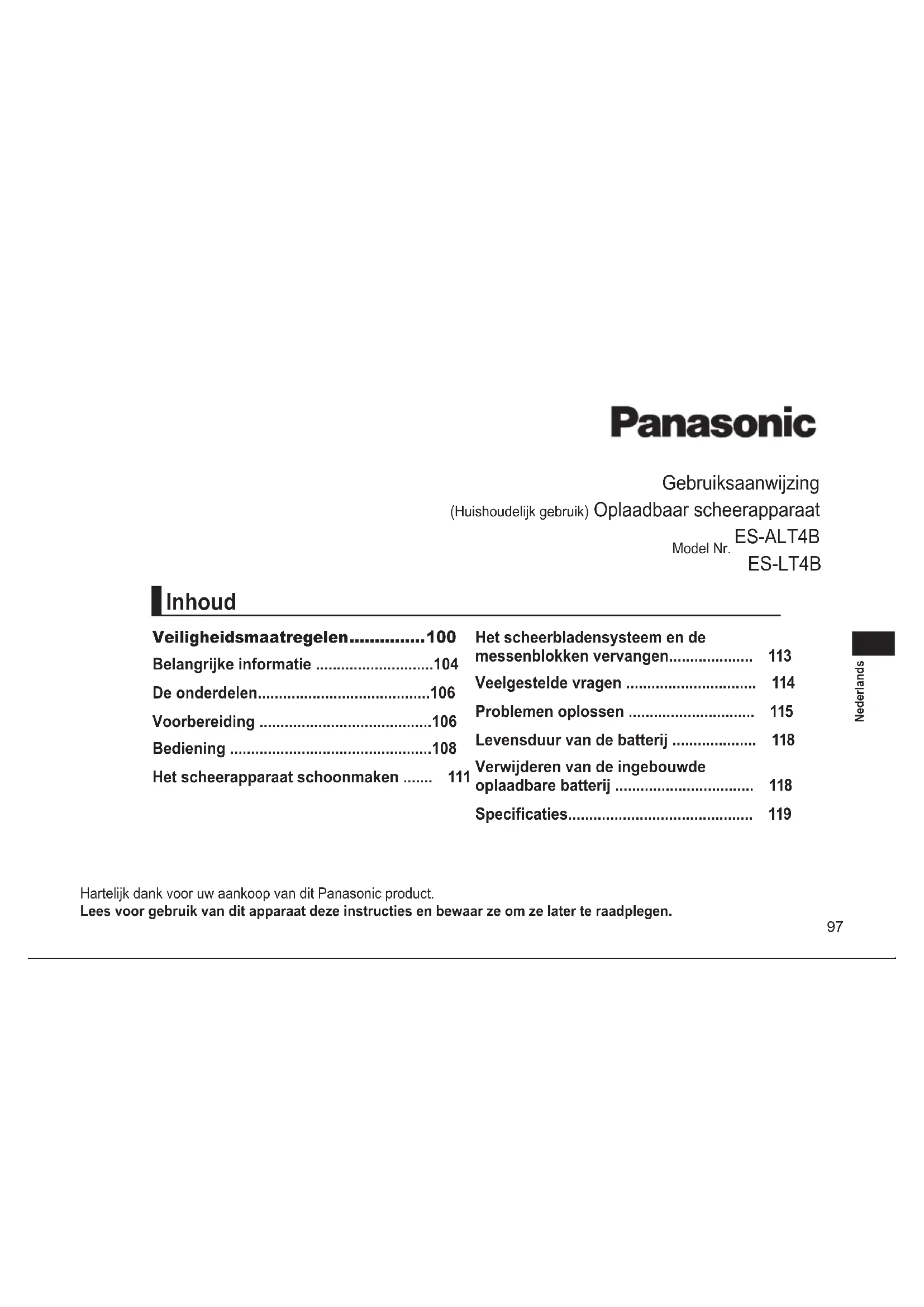 Plaats de messenblokken één voor één. ►Opmerking Gooi de scheerbladhouder niet weg. ►Vervangende onderdelen Vervangende onderdelen zijn verkrijgbaar bij uw dealer of servicecentrum. Vervangende onderdelen voor ES‑ALT4B/ES‑LT4B Scheerkoppen en de messenblokken WES9013 Scheerbladensysteem WES9087 Messenblokken WES9068 Smeerolie WES003P Veelgestelde vragen Vraag Antwoord Als de batterij voor langere tijd niet wordt gebruikt, zal de batterij dan verslechteren? De batterij zal verslechteren indien deze voor meer dan 6 maanden niet wordt gebruikt. Zorg er dus voor om deze minstens om de 6 maanden volledig op te laden. Kan ik het scheerapparaat na elk gebruik opladen? De gebruikte batterij is een lithium‑ion batterij, opladen na elk gebruik zal dus geen eect hebben op levensduur van de batterij. Waarom moet de adapter na het opladen worden losgekoppeld? De batterij langer dan 1 uur opladen heeft geen nadelige invloed op de werking van de batterij, maar maakt u de adapter los in het belang van de veiligheid en om energie te besparen. Wat is het bestanddeel van de speciale olie? Bestanddeel van de olie is vloeibare parane. Waarom maakt het apparaat na het uitschakelen twee keer een piepgeluid? Het geluid geeft aan dat de batterijcapaciteit laag is. Laad het apparaat op.115 Nederlands Problemen oplossen Voer de volgende acties uit. Als de problemen nog steeds niet zijn opgelost, neem contact op met de winkel waar u het apparaat hebt gekocht of met een door Panasonic erkend service center voor reparatie. Probleem Actie De stroomschakelaar mag niet AAN staan. Ontgrendel de vergrendeling van de schakelaar. (Zie pagina 111.) De stroomschakelaar wordt op UIT gezet. Druk tweemaal op de stroomschakelaar terwijl u het scheerapparaat bij natscheren met scheerschuim gebruikt. Probleem Actie De scheersensor reageert niet. Afhankelijk van de dikte van de baard of de hoeveelheid afgeschoren haar in de scheerkop, kan het zijn dat de scheersensor niet reageert en het aandrijfgeluid niet varieert. Dit is geen defect. De scheersensor reageert mogelijk niet, afhankelijk van het type scheergel en de hoeveelheid. Dit is niet abnormaal. De scheersensor reageert mogelijk niet wanneer de overblijvende batterijcapaciteit te laag is. Laad het scheerapparaat in dat geval opnieuw op. Olie aanbrengen. (Zie pagina 112.) De scheersensor reageert mogelijk niet wanneer er onvoldoende olie op de mesjes aanwezig is.116 Nederlands Probleem Actie De scheersensor reageert ook al is het scheerapparaat niet in contact met de huid. Reinig het scheerapparaat om de baardresten te verwijderen. Wanneer het scheerapparaat erg vuil is, gebruik dan eerst het reinigingsborsteltje om de baardresten te verwijderen. Of, verwijder de scheerbladhouder en spoel af met water. (Zie pagina 112.) Vervang het scheerbladensysteem en/of de messenblokken. Verwachte levensduur van het scheerbladsysteem en messenblokken: Scheerbladensysteem: Ongeveer 1 jaar Messenblokken: Ongeveer 2 jaar Schuim kan niet gemaakt worden bij natscheren met scheerschuim. Schuim maken kan moeilijk zijn, afhankelijk van het soort gezichtsreiniger etc., dus pas de hoeveelheid water of gezichtsreiniger aan. Schuim gemaakt bij natscheren met scheerschuim bevat scheersel. Voordat u schuim maakt, spoelt u alle scheersel goed af. (Zie pagina 111.) Probleem Actie Het scheerapparaat kan niet worden opgeladen. De aanbevolen oplaadtemperatuur bedraagt 10 °C – 35 °C. Als bij een andere temperatuur wordt opgeladen dan aanbevolen, kan het langer duren om het scheerapparaat op te laden of kan het helemaal niet worden opgeladen. De werkingstijd is kort, zelfs na een volledige oplading. Het scheerapparaat kan ongeveer 2 weken worden gebruikt op een volle lading, uitgaande van 3 minuten droogscheren per dag. Het aantal bruikbare dagen kan echter worden verminderd, afhankelijk van hoe het scheerapparaat wordt gebruikt (bijvoorbeeld gebruik in natscheren met scheerschuim, natscheren of bij gebruik bij lage temperaturen). Olie aanbrengen. Wanneer het aantal scheerbeurten per laadbeurt begint te verminderen, is de batterij bijna op het einde van zijn levensduur.117 Nederlands Probleem Actie Het scheerapparaat werkt ook na opladen niet meer. Gebruik het apparaat bij een omgevingstemperatuur van ongeveer 5 °C of hoger. De batterij heeft het einde van zijn levensduur bereikt. Het scheerapparaat zal niet werken zolang de wisselstroomadapter is aangesloten. Gebruik het scheerapparaat wanneer het voldoende is opgeladen en de wisselstroomadapter is losgemaakt. Het aandrijfgeluid varieert met het scheren. De scheersensor werkt. Het geluid varieert afhankelijk van de dikte van de baard. Probleem Actie Maakt veel lawaai. Olie aanbrengen. De mesjes zullen niet gelijkmatig bewegen wanneer er geen olie op de mesjes is, zodat er meer vermogen nodig is. Het scheerapparaat maakt een hoog geluid vanwege de lineaire motoraandrijving. Dit wijst niet op een probleem. Controleer of de scheerbladen correct zijn bevestigd. Reinig het scheerbladensysteem met het borsteltje. De geur wordt sterker. Dit kan worden verbeterd door het apparaat altijd na het scheren te reinigen. Getrimde haren vliegen overal rond. Dit kan worden verbeterd door het apparaat altijd na het scheren te reinigen. Reinig de messenblokken met de borstel wanneer er haartjes aan de messenblokken kleven. Controleer of de reinigingssluiter goed is gesloten.118 Nederlands Probleem Actie Het scheerbladensysteem wordt heet. Olie aanbrengen. Vervang het scheerbladensysteem als dit beschadigd of vervormd is. (Zie pagina 113.) U bent niet meer zo kort geschoren als voorheen. Olie aanbrengen. Dit kan worden verbeterd door het apparaat altijd na het scheren te reinigen. Vervang het scheerbladensysteem en/of de messenblokken. Verwachte levensduur van het scheerbladsysteem en messenblokken: Scheerbladensysteem: Ongeveer 1 jaar Messenblokken: Ongeveer 2 jaar Het scheerapparaat kan niet goed worden schoongemaakt, zelfs nadat het water uit de waterinlaten