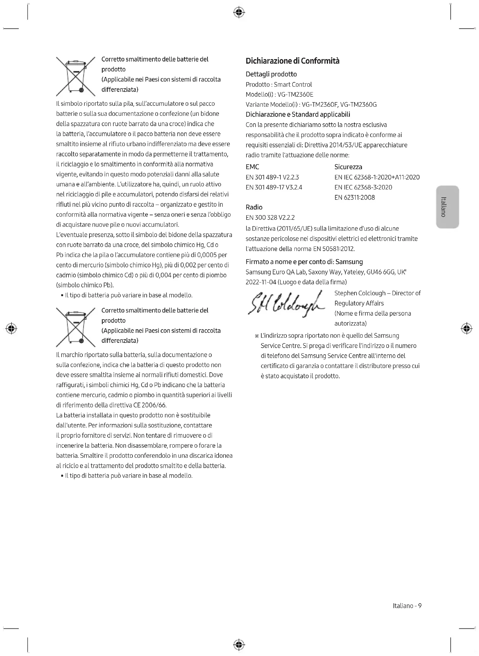 2022-11-04 (Plaats en datum van handtekening) Stephen Colclough – Directeur Regulatory Affairs (Naam en handtekening van bevoegde persoon) ※ Dit is niet het adres van het Samsung Servicecenter. Voor het adres of telefoonnummer van het Samsung Servicecenter raadpleegt u de garantiekaart of neemt u contact op met de winkel waar u het product heeft gekocht. Correcte behandeling van een gebruikte accu uit dit product (Van toepassing in landen waar afval gescheiden wordt ingezameld) Dit merkteken op de accu, handleiding of verpakking geeft aan dat de accu in dit product aan het einde van de levensduur niet samen met ander huishoudelijk afval mag worden weggegooid. De chemische symbolen Hg, Cd of Pb geven aan dat het kwik-, cadmium- of loodgehalte in de accu hoger is dan de referentieniveaus in de Richtlijn 2006/66/EC. Indien de gebruikte accu niet op de juiste wijze wordt behandeld, kunnen deze stoffen schadelijk zijn voor de gezondheid van mensen of het milieu. Ter bescherming van de natuurlijke hulpbronnen en ter bevordering van het hergebruik van materialen, verzoeken wij u afgedankte accu’s en batterijen te scheiden van andere soorten afval en voor recycling aan te bieden bij het gratis inzamelingssysteem voor accu’s en batterijen in uw omgeving.