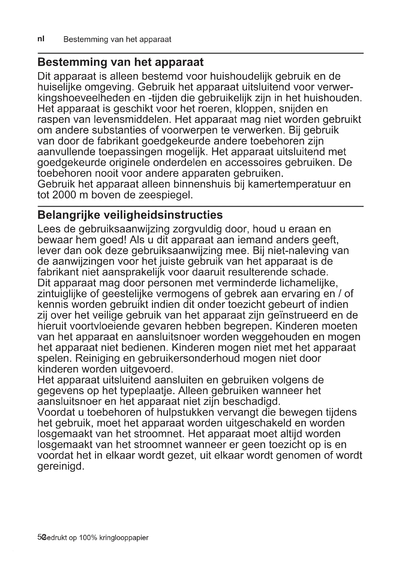 Bestemming van het apparaat Dit apparaat is alleen bestemd voor huishoudelijk gebruik en de huiselijke omgeving. Gebruik het apparaat uitsluitend voor verwer- kingshoeveelheden en -tijden die gebruikelijk zijn in het huishouden. Het apparaat is geschikt voor het roeren, kloppen, snijden en raspen van levensmiddelen. Het apparaat mag niet worden gebruikt om andere substanties of voorwerpen te verwerken. Bij gebruik van door de fabrikant goedgekeurde andere toebehoren zijn aanvullende toepassingen mogelijk. Het apparaat uitsluitend met goedgekeurde originele onderdelen en accessoires gebruiken. De toebehoren nooit voor andere apparaten gebruiken. Gebruik het apparaat alleen binnenshuis bij kamertemperatuur en tot 2000 m boven de zeespiegel. Belangrijke veiligheidsinstructies Lees de gebruiksaanwijzing zorgvuldig door, houd u eraan en bewaar hem goed! Als u dit apparaat aan iemand anders geeft, lever dan ook deze gebruiksaanwijzing mee. Bij niet-naleving van de aanwijzingen voor het juiste gebruik van het apparaat is de fabrikant niet aansprakelijk voor daaruit resulterende schade. Dit apparaat mag door personen met verminderde lichamelijke, zintuiglijke of geestelijke vermogens of gebrek aan ervaring en / of kennis worden gebruikt indien dit onder toezicht gebeurt of indien zij over het veilige gebruik van het apparaat zijn geïnstrueerd en de hieruit voortvloeiende gevaren hebben begrepen. Kinderen moeten van het apparaat en aansluitsnoer worden weggehouden en mogen het apparaat niet bedienen. Kinderen mogen niet met het apparaat spelen. Reiniging en gebruikersonderhoud mogen niet door kinderen worden uitgevoerd. Het apparaat uitsluitend aansluiten en gebruiken volgens de gegevens op het typeplaatje. Alleen gebruiken wanneer het aansluitsnoer en het apparaat niet zijn beschadigd. Voordat u toebehoren of hulpstukken vervangt die bewegen tijdens het gebruik, moet het apparaat worden uitgeschakeld en worden losgemaakt van het stroomnet. Het apparaat moet altijd worden losgemaakt van het stroomnet wanneer er geen toezicht op is en voordat het in elkaar wordt gezet, uit elkaar wordt genomen of wordt gereinigd. Gedrukt op 100% kringlooppapier Bestemming van het apparaat53