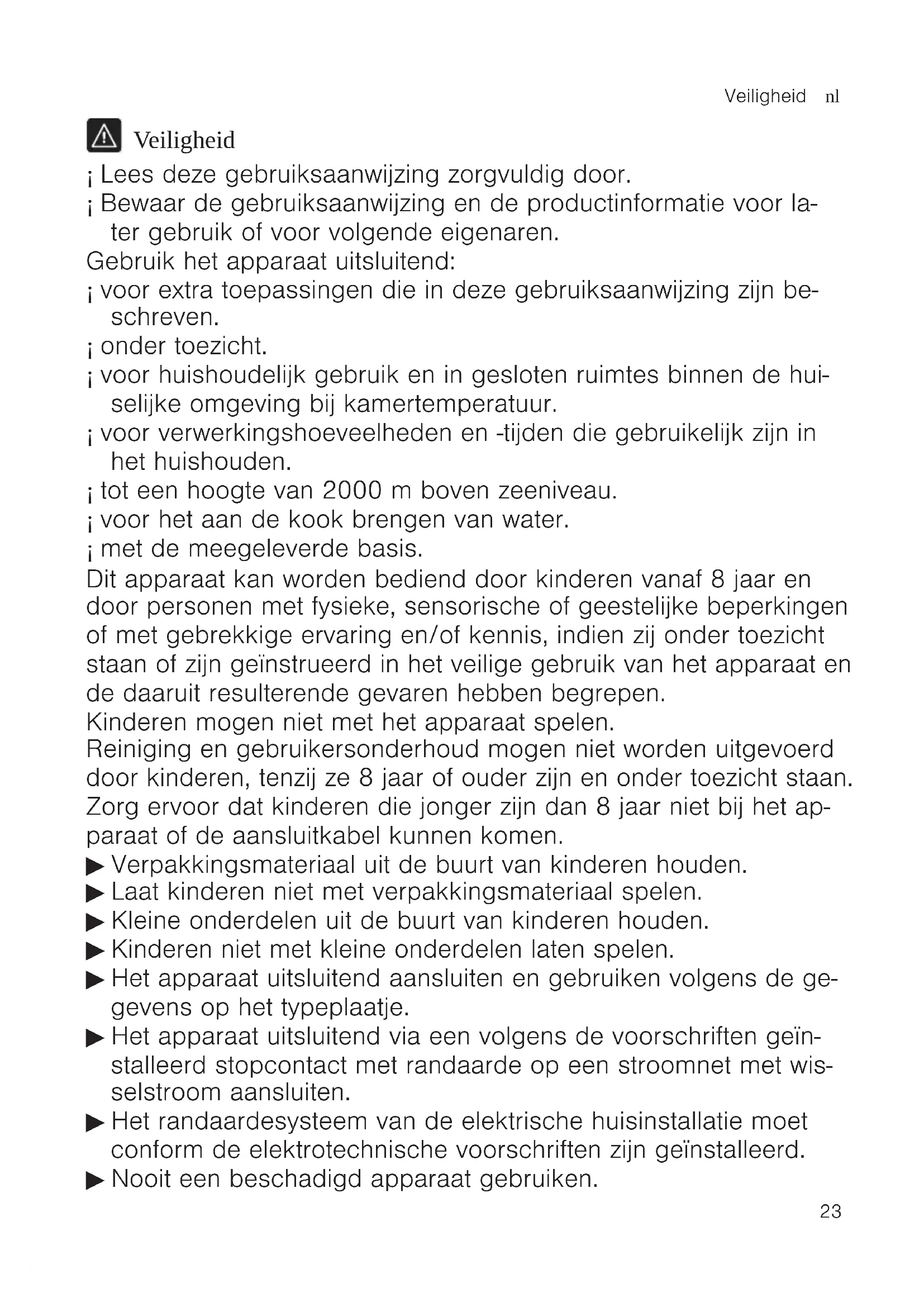Veiligheid ¡ Lees deze gebruiksaanwijzing zorgvuldig door. ¡ Bewaar de gebruiksaanwijzing en de productinformatie voor la- ter gebruik of voor volgende eigenaren. Gebruik het apparaat uitsluitend: ¡ voor extra toepassingen die in deze gebruiksaanwijzing zijn be- schreven. ¡ onder toezicht. ¡ voor huishoudelijk gebruik en in gesloten ruimtes binnen de hui- selijke omgeving bij kamertemperatuur. ¡ voor verwerkingshoeveelheden en -tijden die gebruikelijk zijn in het huishouden. ¡ tot een hoogte van 2000m boven zeeniveau. ¡ voor het aan de kook brengen van water. ¡ met de meegeleverde basis. Dit apparaat kan worden bediend door kinderen vanaf 8 jaar en door personen met fysieke, sensorische of geestelijke beperkingen of met gebrekkige ervaring en/of kennis, indien zij onder toezicht staan of zijn geïnstrueerd in het veilige gebruik van het apparaat en de daaruit resulterende gevaren hebben begrepen. Kinderen mogen niet met het apparaat spelen. Reiniging en gebruikersonderhoud mogen niet worden uitgevoerd door kinderen, tenzij ze 8jaar of ouder zijn en onder toezicht staan. Zorg ervoor dat kinderen die jonger zijn dan 8 jaar niet bij het ap- paraat of de aansluitkabel kunnen komen. ▶ Verpakkingsmateriaal uit de buurt van kinderen houden. ▶ Laat kinderen niet met verpakkingsmateriaal spelen. ▶ Kleine onderdelen uit de buurt van kinderen houden. ▶ Kinderen niet met kleine onderdelen laten spelen. ▶ Het apparaat uitsluitend aansluiten en gebruiken volgens de ge- gevens op het typeplaatje. ▶ Het apparaat uitsluitend via een volgens de voorschriften geïn- stalleerd stopcontact met randaarde op een stroomnet met wis- selstroom aansluiten. ▶ Het randaardesysteem van de elektrische huisinstallatie moet conform de elektrotechnische voorschriften zijn geïnstalleerd. ▶ Nooit een beschadigd apparaat gebruiken.nl Het voorkomen van materiële schade