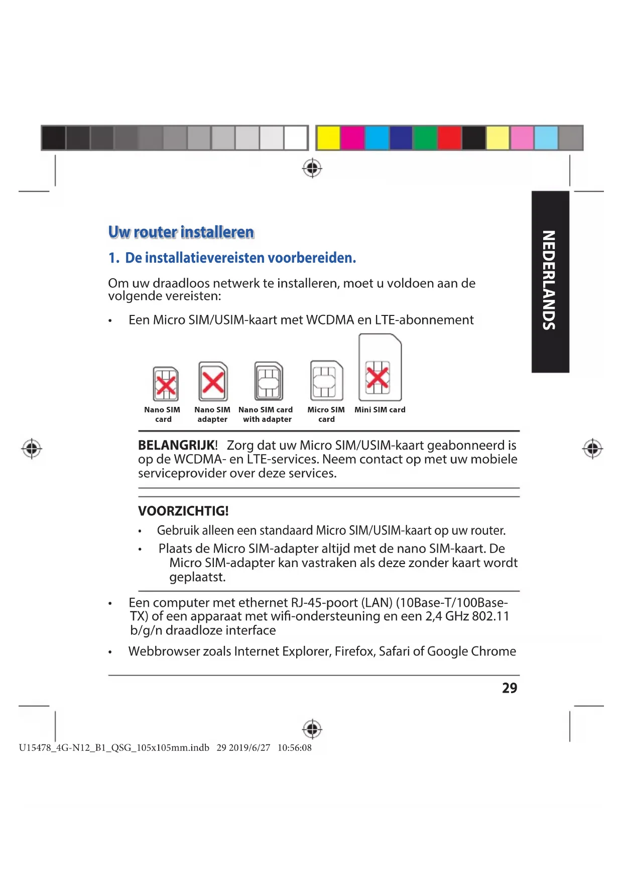 op de WCDMA- en LTE-services. Neem contact op met uw mobiele serviceprovider over deze services. VOORZICHTIG! t (FCSVJLBMMFFOFFOTUBOEBBSE.JDSP4*.64*.LBBSUPQVXSPVUFS t Plaats de Micro SIM-adapter altijd met de nano SIM-kaart. De Micro SIM-adapter kan vastraken als deze zonder kaart wordt geplaatst. t &FODPNQVUFSNFUFUIFSOFU3+QPPSU-"/#BTF5#BTF TX) of een apparaat met wi-ondersteuning en een 2,4 GHz 802.11 b/g/n draadloze interface t 8FCCSPXTFS[PBMT*OUFSOFU&YQMPSFS'JSFGPY4BGBSJPG(PPHMF$ISPNF Mini SIM card Micro SIM card Nano SIM card Nano SIM adapter Nano SIM card with adapter U15478_4G-N12_B1_QSG_105x105mm.indb 29 2019/6/27 10:56:08NEDERLANDS