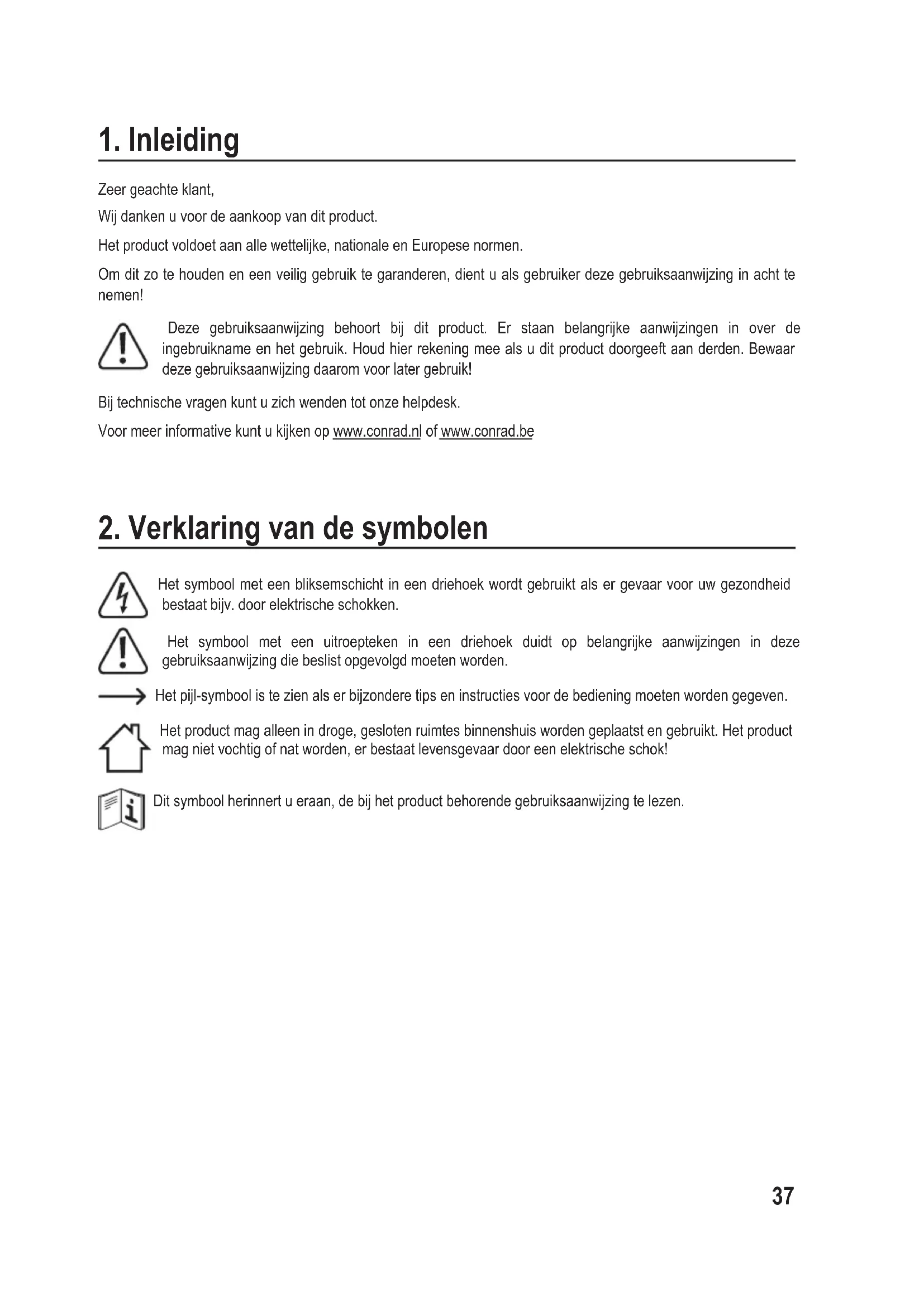 Zeer geachte klant, Wij danken u voor de aankoop van dit product. Het product voldoet aan alle wettelijke, nationale en Europese normen. Om dit zo te houden en een veilig gebruik te garanderen, dient u als gebruiker deze gebruiksaanwijzing in acht te nemen! Deze gebruiksaanwijzing behoort bij dit product. Er staan belangrijke aanwijzingen in over de ingebruikname en het gebruik. Houd hier rekening mee als u dit product doorgeeft aan derden. Bewaar deze gebruiksaanwijzing daarom voor later gebruik! Bij technische vragen kunt u zich wenden tot onze helpdesk. Voor meer informative kunt u kijken op www.conrad.nl of www.conrad.be