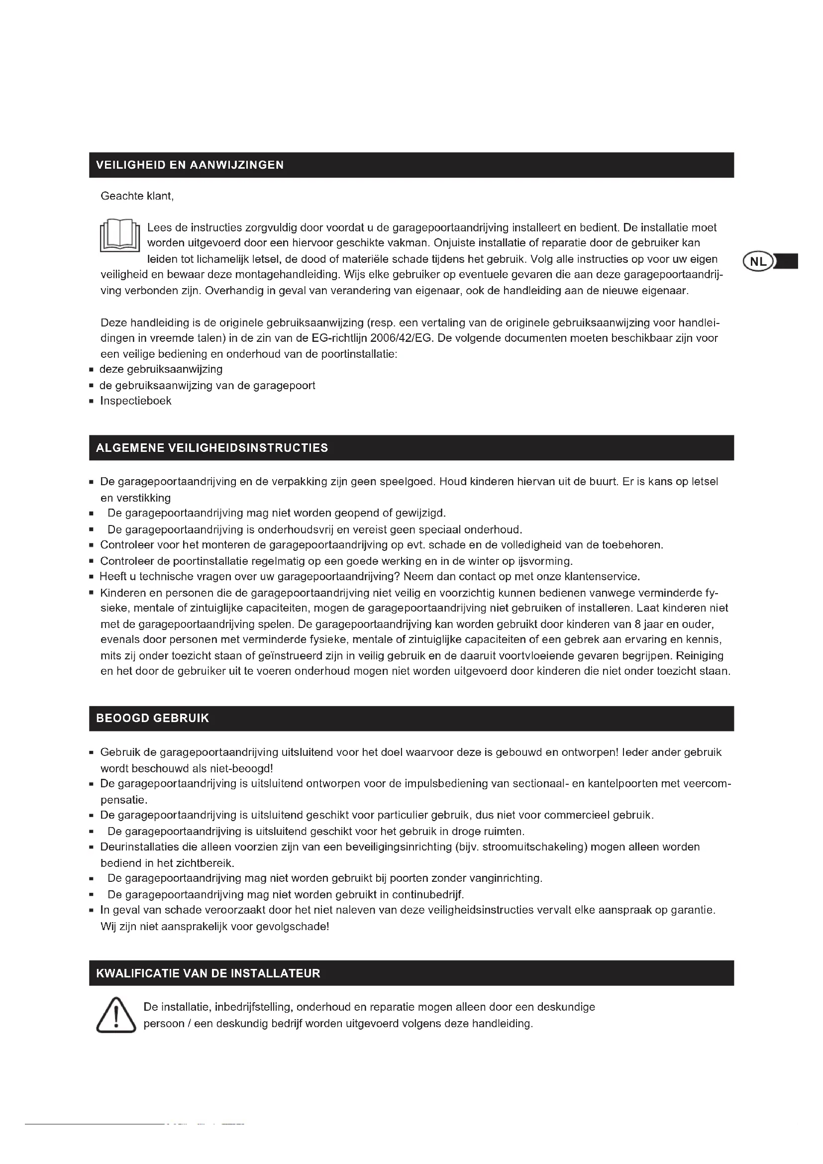 Geachte klant, Lees de instructies zorgvuldig door voordat u de garagepoortaandrijving installeert en bedient De installatie moet worden uitgevoerd door een hiervoor geschikte vakman Onjuiste installatie of reparatie door de gebruiker kan leiden tot lichamelijk letsel, de dood of materiële schade tijdens het gebruik Volg alle instructies op voor uw eigen veiligheid en bewaar deze montagehandleiding Wijs elke gebruiker op eventuele gevaren die aan deze garagepoortaandrij- ving verbonden zijn Overhandig in geval van verandering van eigenaar, ook de handleiding aan de nieuwe eigenaar Deze handleiding is de originele gebruiksaanwijzing (resp. een vertaling van de originele gebruiksaanwijzing voor handlei- dingen in vreemde talen) in de zin van de EG-richtlijn 2006/42/EG. De volgende documenten moeten beschikbaar zijn voor een veilige bediening en onderhoud van de poortinstallatie: deze gebruiksaanwijzing de gebruiksaanwijzing van de garagepoort Inspectieboek ALGEMENE VEILIGHEIDSINSTRUCTIES De garagepoortaandrijving en de verpakking zijn geen speelgoed Houd kinderen hiervan uit de buurt Er is kans op letsel en verstikking De garagepoortaandrijving mag niet worden geopend of gewijzigd De garagepoortaandrijving is onderhoudsvrij en vereist geen speciaal onderhoud Controleer voor het monteren de garagepoortaandrijving op evt schade en de volledigheid van de toebehoren Controleer de poortinstallatie regelmatig op een goede werking en in de winter op ijsvorming Heeft u technische vragen over uw garagepoortaandrijving? Neem dan contact op met onze klantenservice Kinderen en personen die de garagepoortaandrijving niet veilig en voorzichtig kunnen bedienen vanwege verminderde fy- sieke, mentale of zintuiglijke capaciteiten, mogen de garagepoortaandrijving niet gebruiken of installeren Laat kinderen niet met de garagepoortaandrijving spelen De garagepoortaandrijving kan worden gebruikt door kinderen van 8 jaar en ouder, evenals door personen met verminderde fysieke, mentale of zintuiglijke capaciteiten of een gebrek aan ervaring en kennis, mits zij onder toezicht staan of geïnstrueerd zijn in veilig gebruik en de daaruit voortvloeiende gevaren begrijpen Reiniging en het door de gebruiker uit te voeren onderhoud mogen niet worden uitgevoerd door kinderen die niet onder toezicht staan BEOOGD GEBRUIK Gebruik de garagepoortaandrijving uitsluitend voor het doel waarvoor deze is gebouwd en ontworpen! Ieder ander gebruik wordt beschouwd als niet-beoogd! De garagepoortaandrijving is uitsluitend ontworpen voor de impulsbediening van sectionaal- en kantelpoorten met veercom- pensatie De garagepoortaandrijving is uitsluitend geschikt voor particulier gebruik, dus niet voor commercieel gebruik De garagepoortaandrijving is uitsluitend geschikt voor het gebruik in droge ruimten Deurinstallaties die alleen voorzien zijn van een beveiligingsinrichting (bijv. stroomuitschakeling) mogen alleen worden bediend in het zichtbereik De garagepoortaandrijving mag niet worden gebruikt bij poorten zonder vanginrichting De garagepoortaandrijving mag niet worden gebruikt in continubedrijf In geval van schade veroorzaakt door het niet naleven van deze veiligheidsinstructies vervalt elke aanspraak op garantie Wij zijn niet aansprakelijk voor gevolgschade!