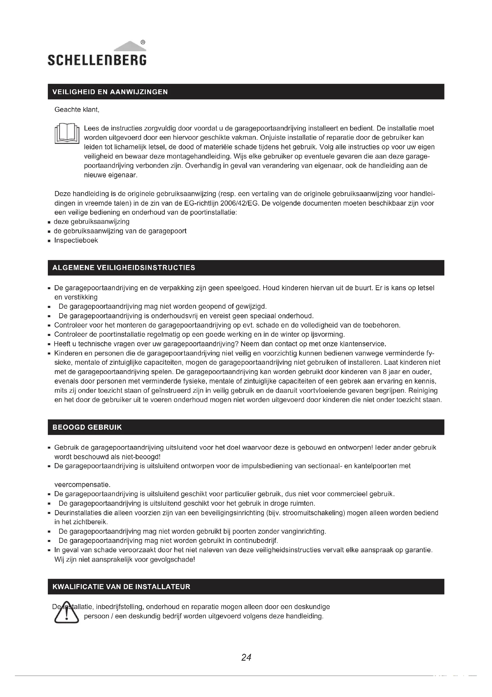 Geachte klant, Lees de instructies zorgvuldig door voordat u de garagepoortaandrijving installeert en bedient De installatie moet worden uitgevoerd door een hiervoor geschikte vakman Onjuiste installatie of reparatie door de gebruiker kan leiden tot lichamelijk letsel, de dood of materiële schade tijdens het gebruik Volg alle instructies op voor uw eigen veiligheid en bewaar deze montagehandleiding Wijs elke gebruiker op eventuele gevaren die aan deze garage- poortaandrijving verbonden zijn Overhandig in geval van verandering van eigenaar, ook de handleiding aan de nieuwe eigenaar Deze handleiding is de originele gebruiksaanwijzing (resp. een vertaling van de originele gebruiksaanwijzing voor handlei- dingen in vreemde talen) in de zin van de EG-richtlijn 2006/42/EG. De volgende documenten moeten beschikbaar zijn voor een veilige bediening en onderhoud van de poortinstallatie: deze gebruiksaanwijzing de gebruiksaanwijzing van de garagepoort Inspectieboek ALGEMENE VEILIGHEIDSINSTRUCTIES De garagepoortaandrijving en de verpakking zijn geen speelgoed Houd kinderen hiervan uit de buurt Er is kans op letsel en verstikking De garagepoortaandrijving mag niet worden geopend of gewijzigd De garagepoortaandrijving is onderhoudsvrij en vereist geen speciaal onderhoud Controleer voor het monteren de garagepoortaandrijving op evt schade en de volledigheid van de toebehoren Controleer de poortinstallatie regelmatig op een goede werking en in de winter op ijsvorming Heeft u technische vragen over uw garagepoortaandrijving? Neem dan contact op met onze klantenservice Kinderen en personen die de garagepoortaandrijving niet veilig en voorzichtig kunnen bedienen vanwege verminderde fy- sieke, mentale of zintuiglijke capaciteiten, mogen de garagepoortaandrijving niet gebruiken of installeren Laat kinderen niet met de garagepoortaandrijving spelen De garagepoortaandrijving kan worden gebruikt door kinderen van 8 jaar en ouder, evenals door personen met verminderde fysieke, mentale of zintuiglijke capaciteiten of een gebrek aan ervaring en kennis, mits zij onder toezicht staan of geïnstrueerd zijn in veilig gebruik en de daaruit voortvloeiende gevaren begrijpen Reiniging en het door de gebruiker uit te voeren onderhoud mogen niet worden uitgevoerd door kinderen die niet onder toezicht staan BEOOGD GEBRUIK Gebruik de garagepoortaandrijving uitsluitend voor het doel waarvoor deze is gebouwd en ontworpen! Ieder ander gebruik wordt beschouwd als niet-beoogd! De garagepoortaandrijving is uitsluitend ontworpen voor de impulsbediening van sectionaal- en kantelpoorten met veercompensatie De garagepoortaandrijving is uitsluitend geschikt voor particulier gebruik, dus niet voor commercieel gebruik De garagepoortaandrijving is uitsluitend geschikt voor het gebruik in droge ruimten Deurinstallaties die alleen voorzien zijn van een beveiligingsinrichting (bijv. stroomuitschakeling) mogen alleen worden bediend in het zichtbereik De garagepoortaandrijving mag niet worden gebruikt bij poorten zonder vanginrichting De garagepoortaandrijving mag niet worden gebruikt in continubedrijf In geval van schade veroorzaakt door het niet naleven van deze veiligheidsinstructies vervalt elke aanspraak op garantie Wij zijn niet aansprakelijk voor gevolgschade!