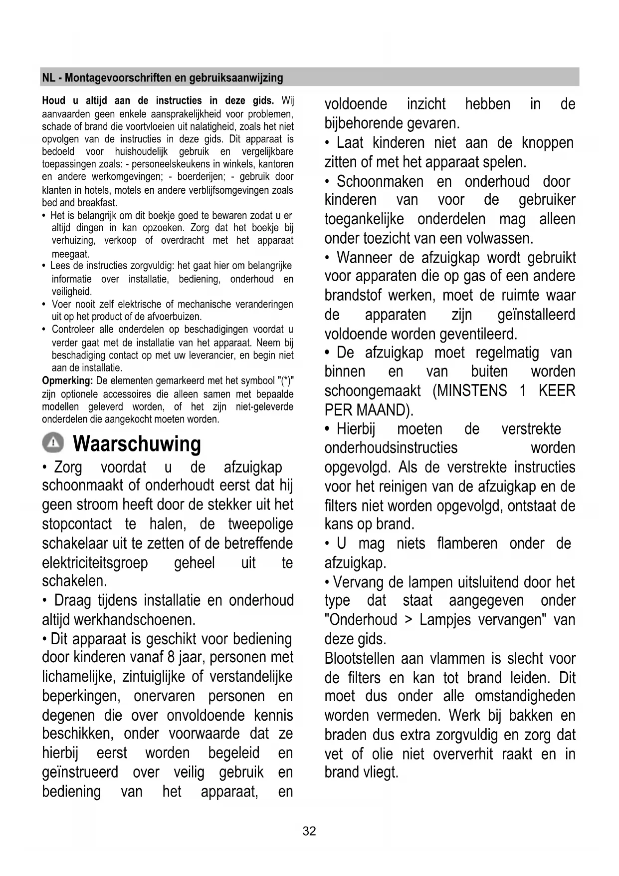 Fig. 12 Remplacement des lampes La hotte est dotée d’un système d’éclairage basé sur la technologie LED. Les LEDS garantissent un éclairage optimal, une durée jusqu’à 10 fois supérieures aux ampoules traditionnelles et permettent une épargne de 90% en énergie électrique. Pour le remplacement, s’adresser au service d’assistance technique.32 NL - Montagevoorschriften en gebruiksaanwijzing Houd u altijd aan de instructies in deze gids. Wij aanvaarden geen enkele aansprakelijkheid voor problemen, schade of brand die voortvloeien uit nalatigheid, zoals het niet opvolgen van de instructies in deze gids. Dit apparaat is bedoeld voor huishoudelijk gebruik en vergelijkbare toepassingen zoals: - personeelskeukens in winkels, kantoren en andere werkomgevingen; - boerderijen; - gebruik door klanten in hotels, motels en andere verblijfsomgevingen zoals bed and breakfast.
