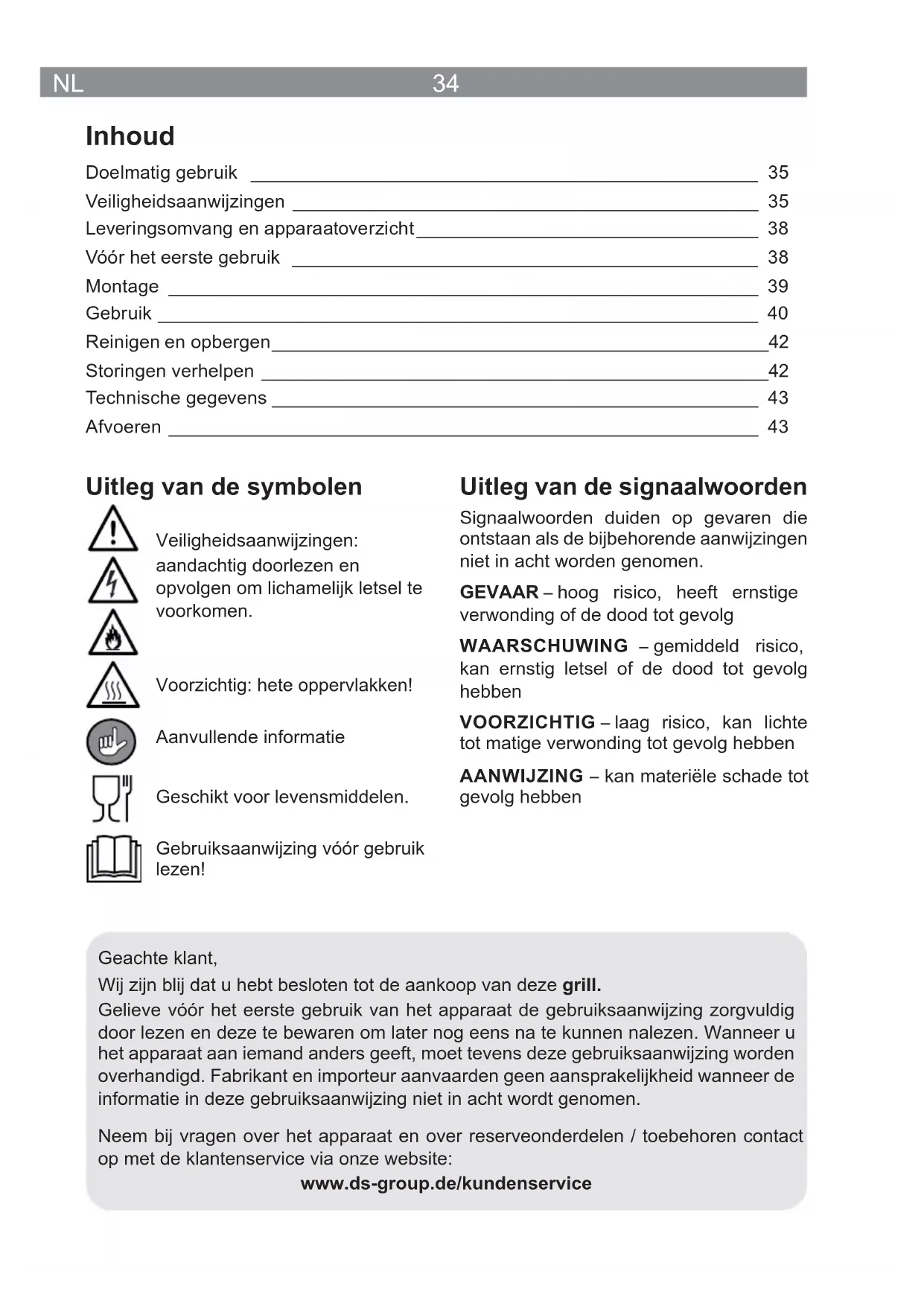 Prix d’un appel vers le réseau xe allemand au tarif de votre fournisseur. www.ds-group.de/kundenservice Alle Rechte vorbehalten.NL 34 Inhoud Doelmatig gebruik _________________________________________________ 35 Veiligheidsaanwijzingen _____________________________________________ 35 Leveringsomvang en apparaatoverzicht _________________________________ 38 Vóór het eerste gebruik _____________________________________________ 38 Montage _________________________________________________________ 39 Gebruik __________________________________________________________ 40 Reinigen en opbergen ________________________________________________42 Storingen verhelpen _________________________________________________42 Technische gegevens _______________________________________________ 43 Afvoeren _________________________________________________________ 43 Geachte klant, Wij zijn blij dat u hebt besloten tot de aankoop van deze grill. Gelieve vóór het eerste gebruik van het apparaat de gebruiksaanwijzing zorgvuldig door lezen en deze te bewaren om later nog eens na te kunnen nalezen. Wanneer u het apparaat aan iemand anders geeft, moet tevens deze gebruiksaanwijzing worden overhandigd. Fabrikant en importeur aanvaarden geen aansprakelijkheid wanneer de informatie in deze gebruiksaanwijzing niet in acht wordt genomen. Neem bij vragen over het apparaat en over reserveonderdelen / toebehoren contact op met de klantenservice via onze website: www.ds-group.de/kundenservice Uitleg van de symbolen Veiligheidsaanwijzingen: aandachtig doorlezen en opvolgen om lichamelijk letsel te voorkomen. Voorzichtig: hete oppervlakken! Aanvullende informatie Geschikt voor levensmiddelen. Gebruiksaanwijzing vóór gebruik lezen! Uitleg van de signaalwoorden Signaalwoorden duiden op gevaren die ontstaan als de bijbehorende aanwijzingen niet in acht worden genomen. GEVAAR – hoog risico, heeft ernstige verwonding of de dood tot gevolg WAARSCHUWING – gemiddeld risico, kan ernstig letsel of de dood tot gevolg hebben VOORZICHTIG – laag risico, kan lichte tot matige verwonding tot gevolg hebben AANWIJZING – kan materiële schade tot gevolg hebben35 NL Doelmatig gebruik