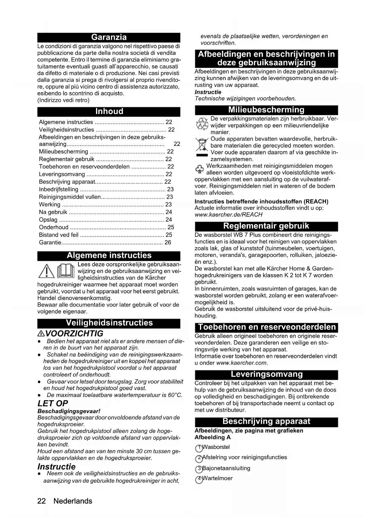 - dere il capitolo Rabbocco del detergente.22 Nederlands Garanzia Le condizioni di garanzia valgono nel rispettivo paese di pubblicazione da parte della nostra società di vendita competente. Entro il termine di garanzia eliminiamo gra- tuitamente eventuali guasti all’apparecchio, se causati da difetto di materiale o di produzione. Nei casi previsti dalla garanzia si prega di rivolgersi al proprio rivendito- re, oppure al più vicino centro di assistenza autorizzato, esibendo lo scontrino di acquisto. (Indirizzo vedi retro) Inhoud Algemene instructies Lees deze oorspronkelijke gebruiksaan- wijzing en de gebruiksaanwijzing en vei- ligheidsinstructies van de Kärcher hogedrukreiniger waarmee het apparaat moet worden gebruikt, voordat u het apparaat voor het eerst gebruikt. Handel dienovereenkomstig. Bewaar alle documentatie voor later gebruik of voor de volgende eigenaar. Veiligheidsinstructies 몇 VOORZICHTIG ● Bedien het apparaat niet als er andere mensen of die- ren in de buurt van het apparaat zijn. ● Schakel na beëindiging van de reinigingswerkzaam- heden de hogedrukreiniger uit en koppel het apparaat los van het hogedrukpistool voordat u het apparaat controleert of onderhoudt. ● Gevaar voor letsel door terugslag. Zorg voor stabiliteit en houd het hogedrukpistool goed vast. ● De maximaal toelaatbare watertemperatuur is 60°C. LET OP Beschadigingsgevaar! Beschadigingsgevaar door onvoldoende afstand van de hogedruksproeier. Gebruik het hogedrukpistool alleen zolang de hoge- druksproeier zich op voldoende afstand van oppervlak- ken bevindt. Houd een afstand aan van ten minste 30 cm tussen ge- lakte oppervlakken en de hogedruksproeier. Instructie ● Neem ook de veiligheidsinstructies en de gebruiks- aanwijzing van de gebruikte hogedrukreiniger in acht, evenals de plaatselijke wetten, verordeningen en voorschriften. Afbeeldingen en beschrijvingen in deze gebruiksaanwijzing Afbeeldingen en beschrijvingen in deze gebruiksaanwij- zing kunnen afwijken van de leveringsomvang en de uit- rusting van uw apparaat. Instructie Technische wijzigingen voorbehouden. Milieubescherming De verpakkingsmaterialen zijn herbruikbaar. Ver- wijder verpakkingen op een milieuvriendelijke manier. Oude apparaten bevatten waardevolle, herbruik- bare materialen die gerecycled moeten worden. Voer oude apparaten daarom af via geschikte in- zamelsystemen. Werkzaamheden met reinigingsmiddelen mogen alleen worden uitgevoerd op vloeistofdichte werk- oppervlakken met een aansluiting op de vuilwateraf- voer. Reinigingsmiddelen niet in wateren of de bodem laten afvloeien. Instructies betreffende inhoudsstoffen (REACH) Actuele informatie over inhoudsstoffen vindt u op: www.kaercher.de/REACH Reglementair gebruik De wasborstel WB 7 Plus combineert drie reinigings- functies en is ideaal voor het reinigen van oppervlakken zoals lak, glas of kunststof (tuinmeubelen, voertuigen, motoren, veranda's, garagepoorten, rolluiken, jaloezie- ën enz.). De wasborstel kan met alle Kärcher Home & Garden- hogedrukreinigers van de klassen K 2 tot K 7 worden gebruikt. In binnenruimten, zoals wasruimten of garages, kan de wasborstel worden gebruikt, zolang er een waterafvoer- mogelijkheid is. Gebruik de wasborstel uitsluitend voor de privé-huis- houding. Toebehoren en reserveonderdelen Gebruik alleen origineel toebehoren en originele reser- veonderdelen. Deze garanderen een veilige en sto- ringsvrije werking van het apparaat. Informatie over toebehoren en reserveonderdelen vindt u onder www.kaercher.com. Leveringsomvang Controleer bij het uitpakken van het apparaat met be- hulp van de gebruiksaanwijzing de inhoud van de doos op volledigheid en beschadigingen. Bij ontbrekende toebehoren of bij transportschade neemt u contact op met uw distributeur. Beschrijving apparaat Afbeeldingen, zie pagina met grafieken Afbeelding A 1 Wasborstel 2 Afstelring voor reinigingsfuncties 3 Bajonetaansluiting 4 Wartelmoer Algemene instructies p. 22