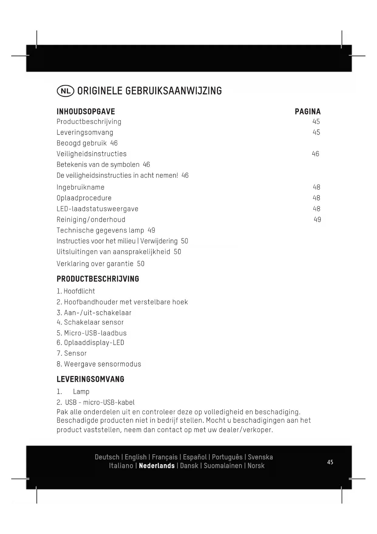 Pak alle onderdelen uit en controleer deze op volledigheid en beschadiging. Beschadigde producten niet in bedrijf stellen. Mocht u beschadigingen aan het product vaststellen, neem dan contact op met uw dealer/verkoper. Productbeschrijving 45 Leveringsomvang 45 Beoogd gebruik 46 Veiligheidsinstructies 46 Betekenis van de symbolen 46 De veiligheidsinstructies in acht nemen! 46 Ingebruikname 48 Oplaadprocedure 48 LED-laadstatusweergave 48 Reiniging/onderhoud 49 Technische gegevens lamp 49 Instructies voor het milieu | Verwijdering 50 Uitsluitingen van aansprakelijkheid 50 Verklaring over garantie 50 Deutsch | English | Français | Español | Português | Svenska Italiano | Nederlands | Dansk | Suomalainen | Norsk Deutsch | English | Français | Español | Português | Svenska Italiano | Nederlands | Dansk | Suomalainen | Norsk46 BEOOGD GEBRUIK § Het product dient als mobiele hoofdlamp § De lamp is niet voor het gebruik in andere toepassingen bestemd § Niet geschikt als kamerverlichting in het huishouden § Het product is niet voor commercieel gebruik bedoeld VEILIGHEIDSINSTRUCTIES Deze gebruiksaanwijzing bevat belangrijke informatie over het gebruik en de ingebruikname voor het volgende product: Sensor-Headlight, verder in de tekst alleen lamp c.q. product genoemd. Lees vóór het eerste gebruik van uw lamp zorgvuldig deze gebruikershandleiding en handel daarnaar. Bewaar deze gebruikershandleiding voor later gebruik of voor de volgende eigenaar. Bij niet-inachtneming van de gebruiksaanwijzing en de veiligheidsinstructies kan er schade aan het product en gevaren (letsel) voor de operator en andere personen ontstaan. De gebruiksaanwijzing heeft betrekking op geldige normen en regels van de Euro- pese Unie. Hiervoor ook de landspecifieke wetten en richtlijnen in het buitenland in acht nemen.