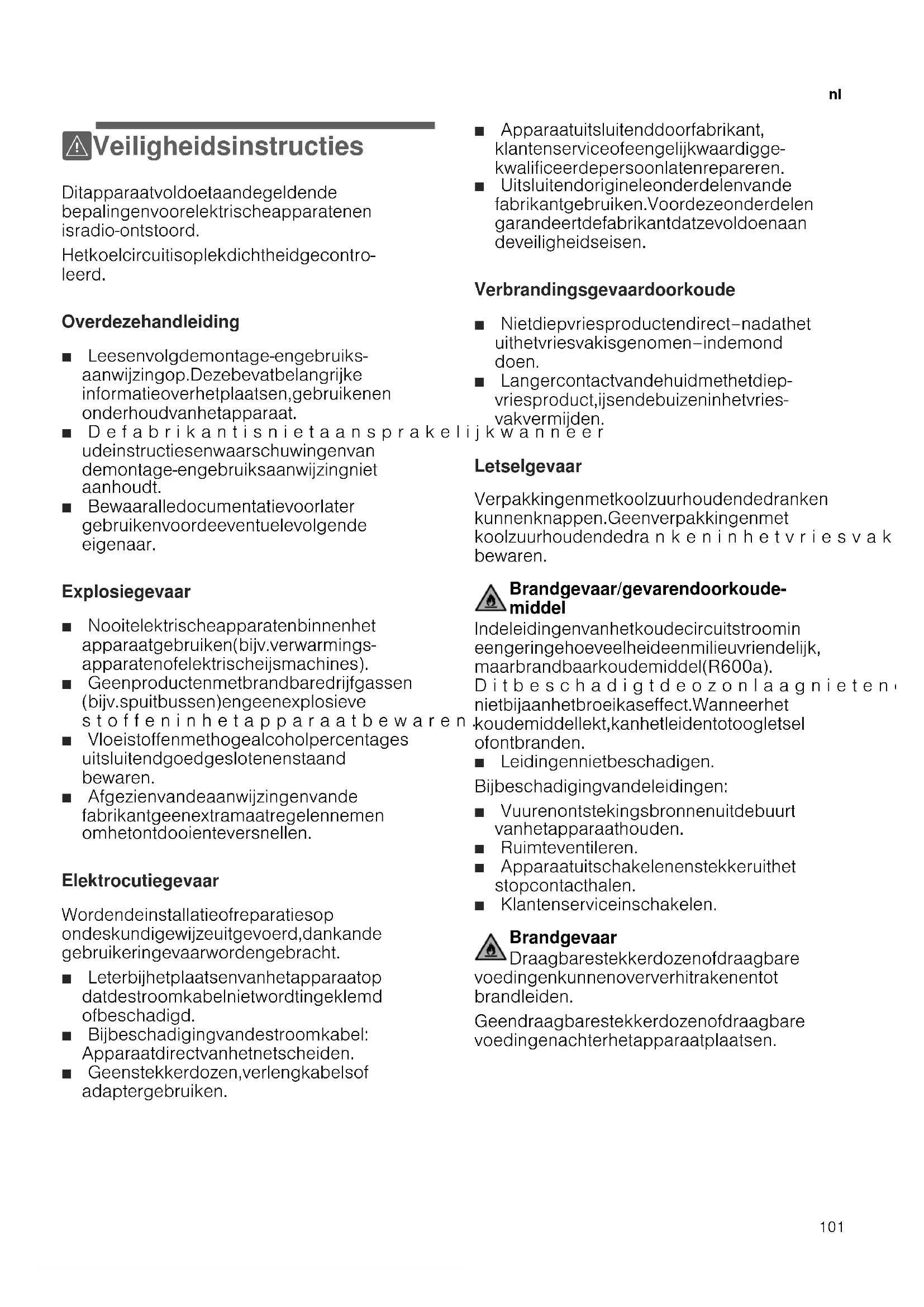 ( Veiligheidsinstructies Dit apparaat voldoet aan de geldende bepalingen voor elektrische apparaten en is radio-ontstoord. Het koelcircuit is op lekdichtheid gecontro leerd. Over deze handleiding Ø Lees en volg de montage- en gebruiks aanwijzing op. Deze bevat belangrijke informatie over het plaatsen, gebruiken en onderhoud van het apparaat. Ø Defabrikantisnietaansprakelijkwanneer u de instructies en waarschuwingen van de montage- en gebruiksaanwijzing niet aanhoudt. Ø Bewaar alle documentatie voor later gebruik en voor de eventuele volgende eigenaar. Explosiegevaar Ø Nooit elektrische apparaten binnen het apparaat gebruiken (bijv. verwarmings apparaten of elektrische ijsmachines). Ø Geen producten met brandbare drijfgassen (bijv. spuitbussen) en geen explosieve stoffeninhetapparaatbewaren. Ø Vloeistoffen met hoge alcoholpercentages uitsluitend goed gesloten en staand bewaren. Ø Afgezien van de aanwijzingen van de fabrikant geen extra maatregelen nemen om het ontdooien te versnellen. Elektrocutiegevaar Worden de installatie of reparaties op ondeskundige wijze uitgevoerd, dan kan de gebruiker in gevaar worden gebracht. Ø Let er bij het plaatsen van het apparaat op dat de stroomkabel niet wordt ingeklemd of beschadigd. Ø Bij beschadiging van de stroomkabel: Apparaat direct van het net scheiden. Ø Geen stekkerdozen, verlengkabels of adapter gebruiken. Ø Apparaat uitsluitend door fabrikant, klantenservice of een gelijkwaardig ge kwalificeerde persoon laten repareren. Ø Uitsluitend originele onderdelen van de fabrikant gebruiken. Voor deze onderdelen garandeert de fabrikant dat ze voldoen a an de veiligheidseisen. Verbrandingsgevaar door koude Ø Niet diepvriesproducten direct – nadat het uit het vriesvak is genomen – in de mond doen. Ø Langer contact van de huid met het diep vriesproduct, ijs en de buizen in het vries vak vermijden. Letselgevaar Verpakkingen met koolzuurhoudende dranken kunnen knappen. Geen verpakkingen met koolzuurhoudende drankeninhetvriesvak bewaren. Brandgevaar / gevaren door koude middel In de leidingen van het koudecircuit stroom in een geringe hoeveelheid een milieuvriendelijk, maar brandbaar koudemiddel (R600a). Ditbeschadigtdeozonlaagnietendraagt niet bij aan het broeikaseffect. Wanneer het koudemiddel lekt, kan het leiden tot oogletsel of ontbranden. Ø Leidingen niet beschadigen. Bij beschadiging van de leidingen : Ø Vuur en ontstekingsbronnen uit de buurt van het apparaat houden. Ø Ruimte ventileren. Ø Apparaat uitschakelen en stekker uit het stopcontact halen. Ø Klantenservice inschakelen. Brandgevaar Draagbare stekkerdozen of draagbare voedingen kunnen oververhit raken en tot brand leiden. Geen draagbare stekkerdozen of draagbare voedingen achter het apparaat plaatsen.nl