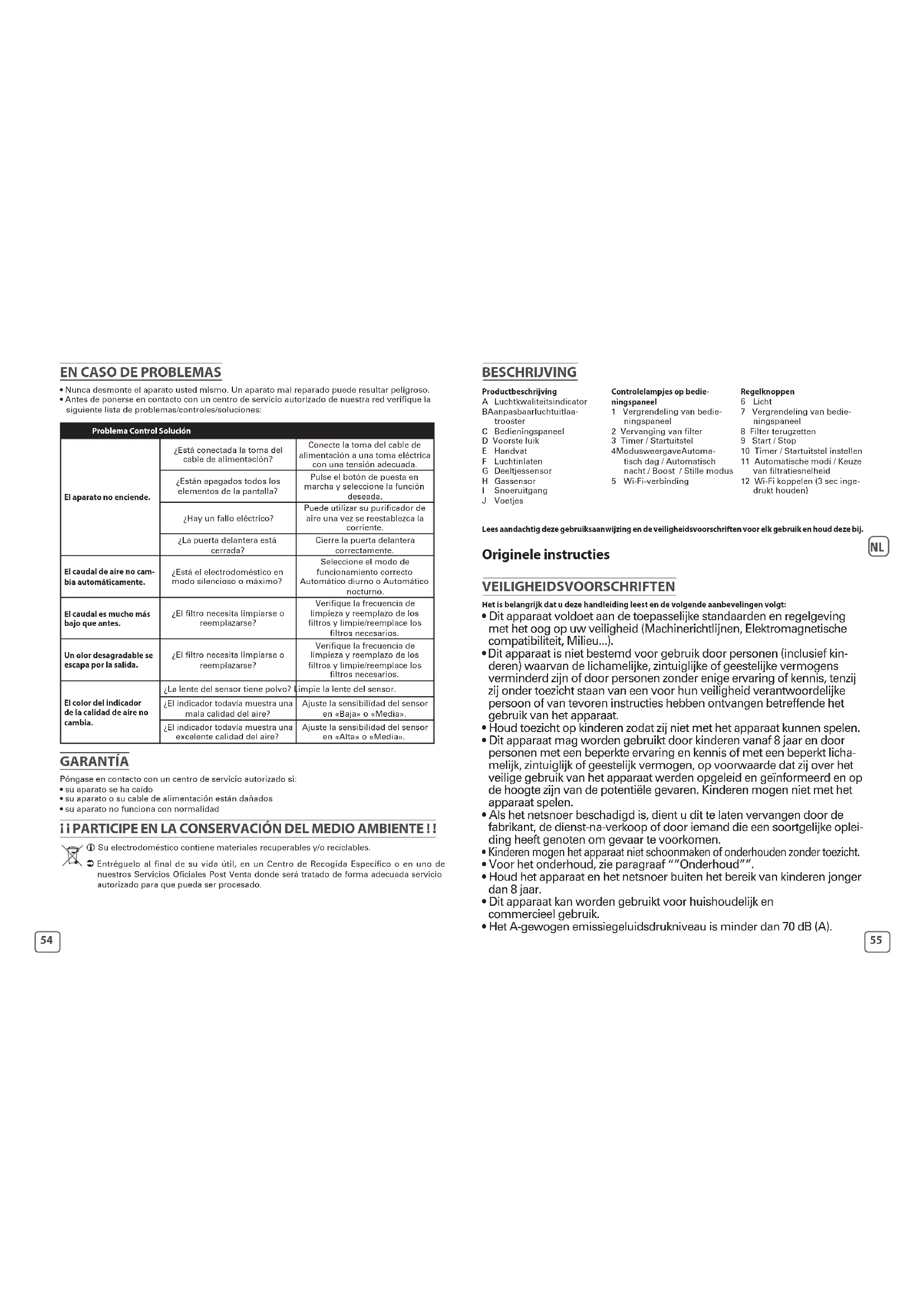 - Voor u contact opneemt met een erkend servicecentrum van ons netwerk, raadpleeg onders- taande lijst van problemen/controle/oplossingen: Probleem Controle Oplossing Het apparaat wordt niet ingeschakeld. Is de voedingskabel aangesloten? Sluit de voedingskabel aan op een stopcontact met de juiste spanning. Zijn alle weergave-instrumenten uit? Druk op de aan-/uitknop en selecteer de gewenste functie. Is er een stroomonderbreking? U kunt uw luchtreiniger gebruiken zodra er opnieuw stroomtoevoer is. Is de kap vooraan gesloten? Sluit de kap vooraan correct. De luchtstroom verandert niet automatisch. Bevindt het apparaat zich in de stille of boostmodus? Selecteer de juiste bedrijfsmodus Automatisch dag of Automatisch nacht. De luchtstroom is veel zwakker dan voorheen. Moet de lter worden schoongemaakt of vervangen? Verieer hoe vaak de lters al werden schoongemaakt en vervangen en maak de lters schoon of vervang ze indien nodig. De luchtuitgang geeft een slechte geur af. Ligt er stof op de lens van de sensor? Verieer hoe vaak de lters al werden schoongemaakt en vervangen en maak de lters schoon of vervang ze indien nodig. De kleur van het controlelampje voor de luchtkwaliteit verandert niet. Ligt er stof op de lens van de sensor? Maak de lens van de sensor schoon. Wijst het controlelampje nog steeds op een slechte luchtkwaliteit? Stel de gevoeligheid van de sensor in op «Laag gevoelig» of op «Gemiddeld». Wijst het controlelampje nog steeds op een uitstekende luchtkwaliteit? Stel de gevoeligheid van de sensor in op “Gevoelig” of op “Gemiddeld”. GARANTIE Neem contact op met een erkend servicecentrum indien: