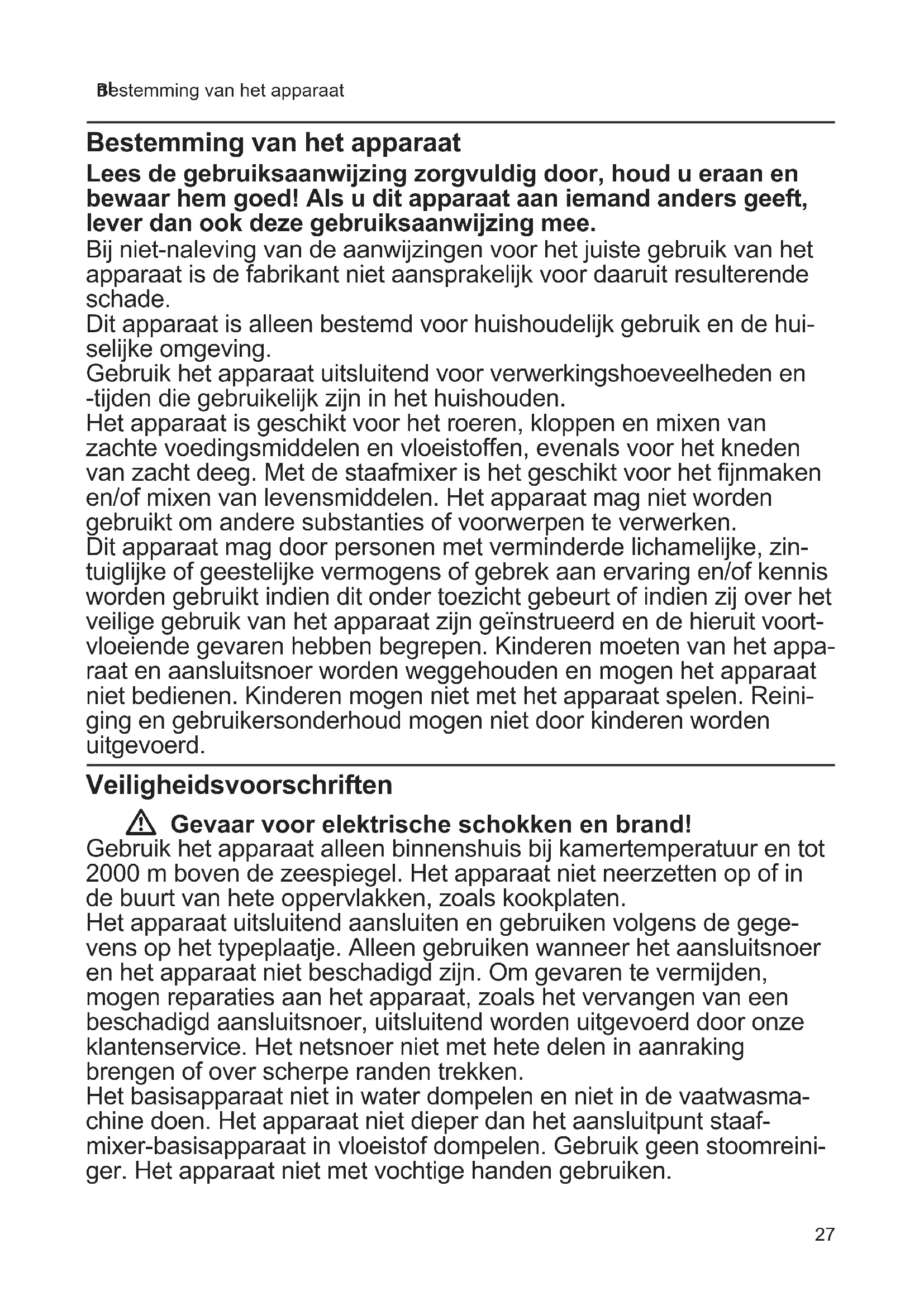 Bestemming van het apparaat Bestemming van het apparaat Lees de gebruiksaanwijzing zorgvuldig door, houd u eraan en bewaar hem goed! Als u dit apparaat aan iemand anders geeft, lever dan ook deze gebruiksaanwijzing mee. Bij niet-naleving van de aanwijzingen voor het juiste gebruik van het apparaat is de fabrikant niet aansprakelijk voor daaruit resulterende schade. Dit apparaat is alleen bestemd voor huishoudelijk gebruik en de hui- selijke omgeving. Gebruik het apparaat uitsluitend voor verwerkingshoeveelheden en -tijden die gebruikelijk zijn in het huishouden. Het apparaat is geschikt voor het roeren, kloppen en mixen van zachte voedingsmiddelen en vloeistoffen, evenals voor het kneden van zacht deeg. Met de staafmixer is het geschikt voor het fijnmaken en/of mixen van levensmiddelen. Het apparaat mag niet worden gebruikt om andere substanties of voorwerpen te verwerken. Dit apparaat mag door personen met verminderde lichamelijke, zin- tuiglijke of geestelijke vermogens of gebrek aan ervaring en/of kennis worden gebruikt indien dit onder toezicht gebeurt of indien zij over het veilige gebruik van het apparaat zijn geïnstrueerd en de hieruit voort- vloeiende gevaren hebben begrepen. Kinderen moeten van het appa- raat en aansluitsnoer worden weggehouden en mogen het apparaat niet bedienen. Kinderen mogen niet met het apparaat spelen. Reini- ging en gebruikersonderhoud mogen niet door kinderen worden uitgevoerd. Veiligheidsvoorschriften W Gevaar voor elektrische schokken en brand! Gebruik het apparaat alleen binnenshuis bij kamertemperatuur en tot 2000 m boven de zeespiegel. Het apparaat niet neerzetten op of in de buurt van hete oppervlakken, zoals kookplaten. Het apparaat uitsluitend aansluiten en gebruiken volgens de gege- vens op het typeplaatje. Alleen gebruiken wanneer het aansluitsnoer en het apparaat niet beschadigd zijn. Om gevaren te vermijden, mogen reparaties aan het apparaat, zoals het vervangen van een beschadigd aansluitsnoer, uitsluitend worden uitgevoerd door onze klantenservice. Het netsnoer niet met hete delen in aanraking brengen of over scherpe randen trekken. Het basisapparaat niet in water dompelen en niet in de vaatwasma- chine doen. Het apparaat niet dieper dan het aansluitpunt staaf- mixer-basisapparaat in vloeistof dompelen. Gebruik geen stoomreini- ger. Het apparaat niet met vochtige handen gebruiken.28 nl Veiligheidsvoorschriften Het apparaat moet na ieder gebruik, als er geen toezicht aanwezig is, voor de montage, demontage of reiniging en bij storingen altijd van het net worden gescheiden. W Gevaar voor letsel! Het apparaat nooit aansluiten op een tijdschakelaar of op een op afstand bedienbaar stopcontact. Bij een stroomstoring blijft het appa- raat ingeschakeld; na de stroomstoring gaat het automatisch weer lopen. Het apparaat direct uitschakelen. Tijdens het gebruik altijd toe- zicht houden op het apparaat! Het apparaat niet langer ingeschakeld laten dan nodig is voor het verwerken van het levensmiddel. Direct na gebruik van het apparaat wachten totdat de aandrijving stilstaat. Voordat u toebehoren of hulpstukken vervangt die bewegen tijdens het gebruik, moet het apparaat worden uitgeschakeld en worden los- gemaakt van het stroomnet. Hulpstukken alleen aanbrengen en ver- wijderen wanneer het apparaat stilstaat – na het uitschakelen loopt het apparaat nog even na. Het apparaat niet onbelast laten lopen. Nooit in de draaiende onderdelen grijpen. Nooit in het mes van de mixervoet grijpen. Messen nooit met blote handen reinigen. Een borstel gebruiken. Ervoor zorgen dat lang haar en losse kledingstuk- ken niet door de roterende hulpmiddelen worden gegrepen. Het apparaat uitsluitend met originele onderdelen en accessoires gebrui- ken. Alleen hulpstukken van hetzelfde type (zoals 2 kneedhaken) paarsgewijs aanbrengen. Hulpstukken nooit gelijktijdig met toebeho- ren in de opening in de achterzijde gebruiken. W Verbrandingsgevaar! Voorzichtig te werk gaan bij verwerking van heet mixgoed. Heet mixgoed kan opspatten tijdens de verwerking. W Gezondheidsrisico! Verontreinigingen aan de oppervlakken kunnen de gezondheid schaden. Neem de reinigingsinstructies in acht. Oppervlakken die met voedingsmiddelen in contact komen, vóór elk gebruik reinigen. W Belangrijk! Bij gebruik van de staafmixer in een kookpan de pan eerst van de kookplaat nemen. De mixkom is niet geschikt voor gebruik in de magnetron. Het apparaat na elk gebruik of als het langere tijd niet is gebruikt, altijd volgens de beschrijving reinigen. X “Reinigen” zie pagina 3129