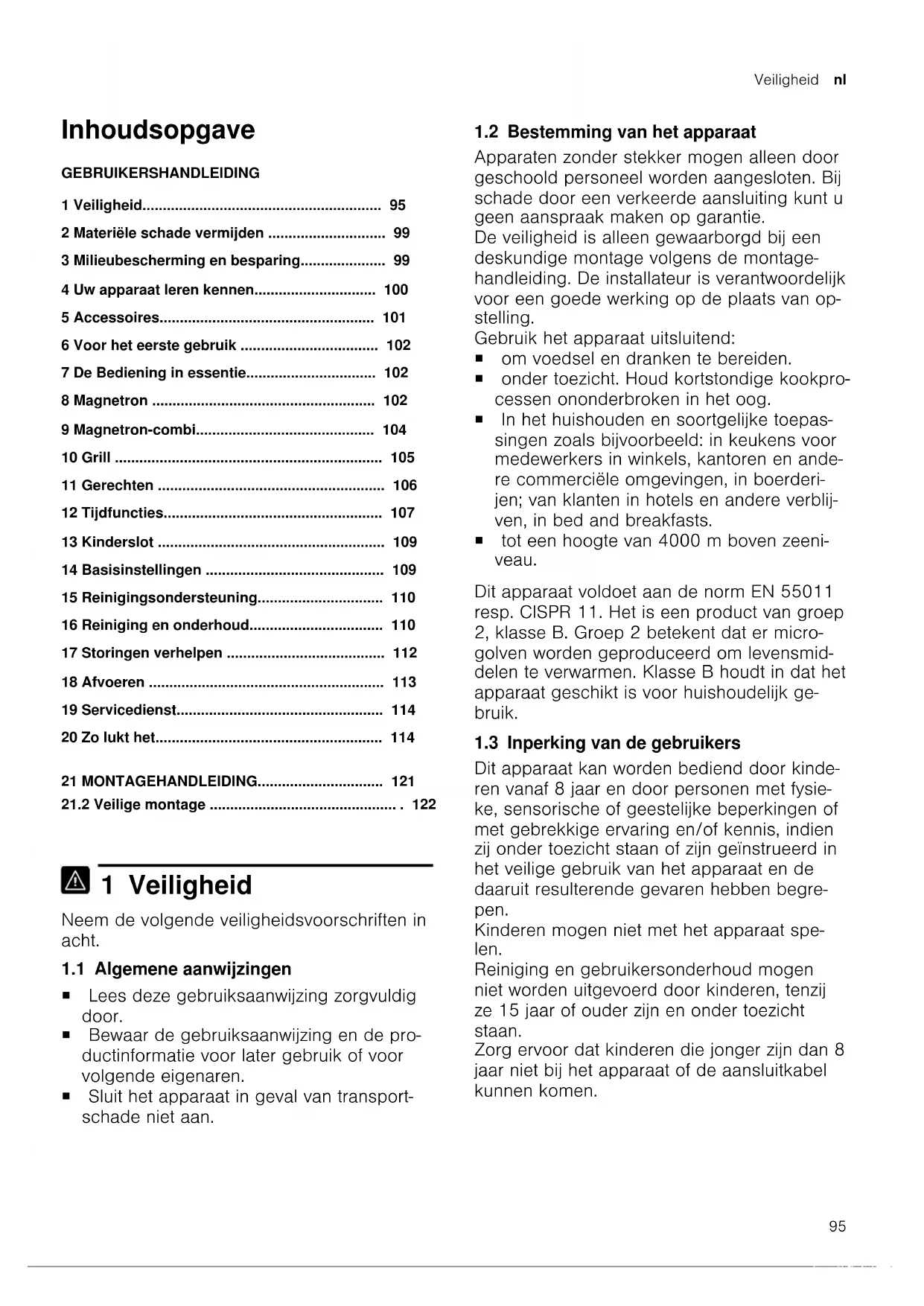 1 Veiligheid Neem de volgende veiligheidsvoorschriften in acht. 1.1 Algemene aanwijzingen ¡ Lees deze gebruiksaanwijzing zorgvuldig door. ¡ Bewaar de gebruiksaanwijzing en de pro- ductinformatie voor later gebruik of voor volgende eigenaren. ¡ Sluit het apparaat in geval van transport- schade niet aan. 1.2 Bestemming van het apparaat Apparaten zonder stekker mogen alleen door geschoold personeel worden aangesloten. Bij schade door een verkeerde aansluiting kunt u geen aanspraak maken op garantie. De veiligheid is alleen gewaarborgd bij een deskundige montage volgens de montage- handleiding. De installateur is verantwoordelijk voor een goede werking op de plaats van op- stelling. Gebruik het apparaat uitsluitend: ¡ om voedsel en dranken te bereiden. ¡ onder toezicht. Houd kortstondige kookpro- cessen ononderbroken in het oog. ¡ In het huishouden en soortgelijke toepas- singen zoals bijvoorbeeld: in keukens voor medewerkers in winkels, kantoren en ande- re commerciële omgevingen, in boerderi- jen; van klanten in hotels en andere verblij- ven, in bed and breakfasts. ¡ tot een hoogte van 4000m boven zeeni- veau. Dit apparaat voldoet aan de norm EN55011 resp. CISPR11. Het is een product van groep 2, klasse B. Groep 2 betekent dat er micro- golven worden geproduceerd om levensmid- delen te verwarmen. Klasse B houdt in dat het apparaat geschikt is voor huishoudelijk ge- bruik. 1.3 Inperking van de gebruikers Dit apparaat kan worden bediend door kinde- ren vanaf 8 jaar en door personen met fysie- ke, sensorische of geestelijke beperkingen of met gebrekkige ervaring en/of kennis, indien zij onder toezicht staan of zijn geïnstrueerd in het veilige gebruik van het apparaat en de daaruit resulterende gevaren hebben begre- pen. Kinderen mogen niet met het apparaat spe- len. Reiniging en gebruikersonderhoud mogen niet worden uitgevoerd door kinderen, tenzij ze 15jaar of ouder zijn en onder toezicht staan. Zorg ervoor dat kinderen die jonger zijn dan 8 jaar niet bij het apparaat of de aansluitkabel kunnen komen.nl Veiligheid