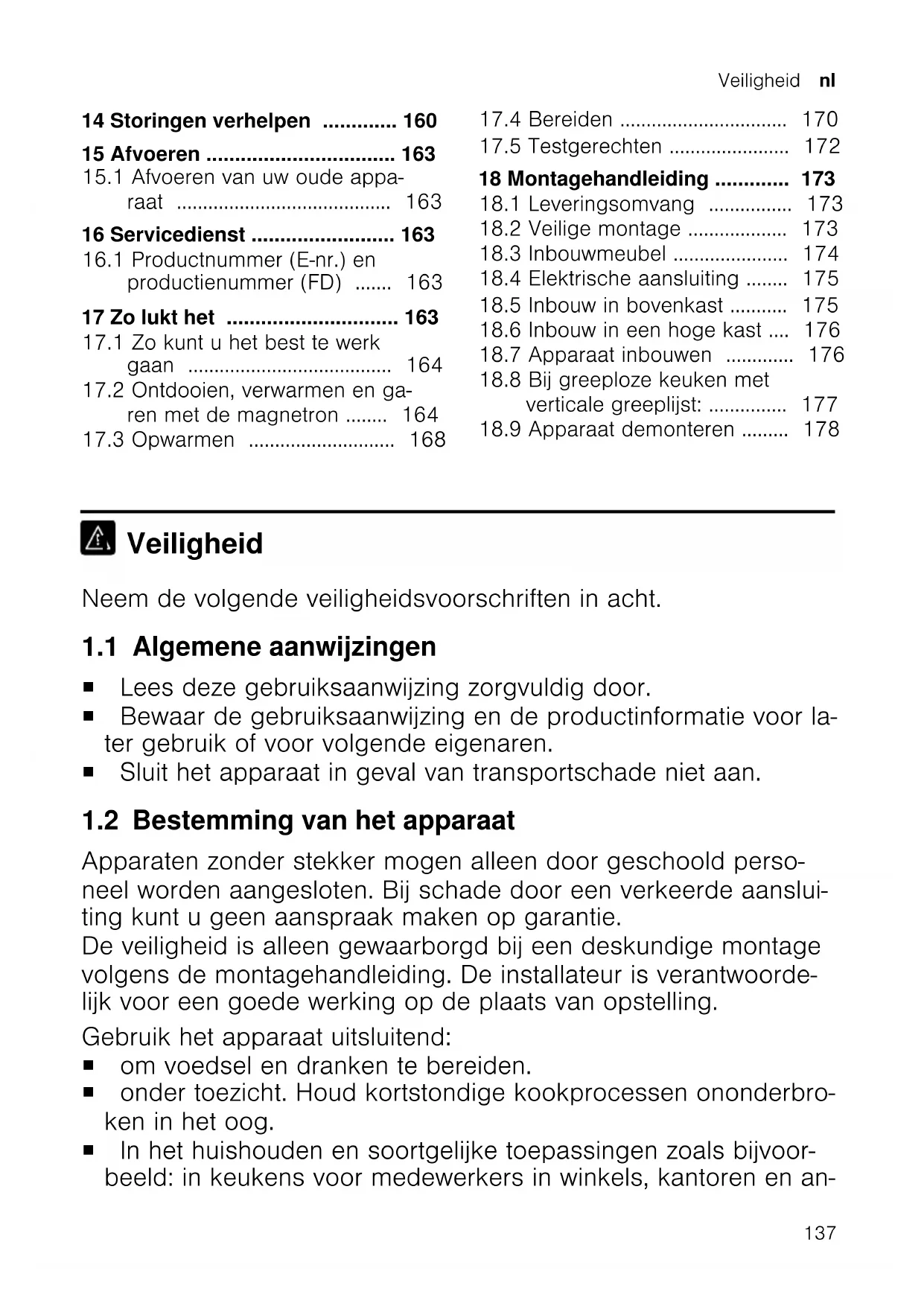 Veiligheid 1 Veiligheid Neem de volgende veiligheidsvoorschriften in acht. 1.1 Algemene aanwijzingen ¡ Lees deze gebruiksaanwijzing zorgvuldig door. ¡ Bewaar de gebruiksaanwijzing en de productinformatie voor la- ter gebruik of voor volgende eigenaren. ¡ Sluit het apparaat in geval van transportschade niet aan. 1.2 Bestemming van het apparaat Apparaten zonder stekker mogen alleen door geschoold perso- neel worden aangesloten. Bij schade door een verkeerde aanslui- ting kunt u geen aanspraak maken op garantie. De veiligheid is alleen gewaarborgd bij een deskundige montage volgens de montagehandleiding. De installateur is verantwoorde- lijk voor een goede werking op de plaats van opstelling. Gebruik het apparaat uitsluitend: ¡ om voedsel en dranken te bereiden. ¡ onder toezicht. Houd kortstondige kookprocessen ononderbro- ken in het oog. ¡ In het huishouden en soortgelijke toepassingen zoals bijvoor- beeld: in keukens voor medewerkers in winkels, kantoren en an- 137nl Veiligheid dere commerciële omgevingen, in boerderijen; van klanten in hotels en andere verblijven, in bed and breakfasts. ¡ tot een hoogte van 4000m boven zeeniveau. Dit apparaat voldoet aan de norm EN55011 resp. CISPR11. Het is een product van groep 2, klasse B. Groep 2 betekent dat er mi- crogolven worden geproduceerd om levensmiddelen te verwar- men. Klasse B houdt in dat het apparaat geschikt is voor huishou- delijk gebruik. 1.3 Inperking van de gebruikers Dit apparaat kan worden bediend door kinderen vanaf 8 jaar en door personen met fysieke, sensorische of geestelijke beperkin- gen of met gebrekkige ervaring en/of kennis, indien zij onder toe- zicht staan of zijn geïnstrueerd in het veilige gebruik van het appa- raat en de daaruit resulterende gevaren hebben begrepen. Kinderen mogen niet met het apparaat spelen. Reiniging en gebruikersonderhoud mogen niet worden uitgevoerd door kinderen, tenzij ze 15jaar of ouder zijn en onder toezicht staan. Zorg ervoor dat kinderen die jonger zijn dan 8 jaar niet bij het ap- paraat of de aansluitkabel kunnen komen. 1.4 Veiliger gebruik Accessoires altijd op de juiste manier in de binnenruimte schui- ven. WAARSCHUWING‒Brandgevaar! In de binnenruimte bewaarde brandbare voorwerpen kunnen vlam vatten. Bewaar nooit brandbare materialen in de binnenruimte. Wanneer er rook wordt geproduceerd moet het apparaat wor- den uitgeschakeld of de stekker uit het stopcontact worden ge- haald en moet de deur gesloten worden gehouden om eventu- eel optredende vlammen te doven. Losse voedselresten, vet en vleessap kunnen in brand vliegen. Voor gebruik dient u de binnenruimte, de verwarmingselemen- ten en de accessoires vrij te maken van grove verontreiniging. 138Veiligheid nl WAARSCHUWING‒Kans op brandwonden! Accessoires of vormen worden zeer heet. Neem hete accessoires en vormen altijd met behulp van een pannenlap uit de binnenruimte. In de hete binnenruimte kunnen alcoholdampen vlam vatten. De apparaatdeur kan openspringen. Er kunnen hete dampen en steekvlammen naar buiten treden. Gebruik slechts geringe hoeveelheden drank met een hoog al- coholpercentage. Geen alcoholhoudende dranken (≥ 15 % vol.) in onverdunde toestand (bijv. voor het opgieten of overgieten van gerechten) verhitten. Apparaatdeur voorzichtig openen. WAARSCHUWING‒Kans op verbranding! Tijdens het gebruik worden de toegankelijke onderdelen heet. De hete onderdelen nooit aanraken. Zorg ervoor dat er geen kinderen in de buurt zijn. Bij het openen van de apparaatdeur kan hete stoom vrijkomen. Stoom is afhankelijk van de temperatuur niet altijd zichtbaar. Apparaatdeur voorzichtig openen. Zorg ervoor dat er geen kinderen in de buurt zijn. Door water in de hete binnenruimte kan hete waterdamp ontstaan. Nooit water in de hete binnenruimte gieten. WAARSCHUWING‒Kans op letsel! Wanneer er krassen op het glas van de apparaatdeur zitten, kan dit barsten. Gebruik geen scherp of schurend reinigingsmiddel of scherpe metalen schraper voor het reinigen van het glas van de appa- raatdeur omdat dit het oppervlak kan beschadigen. Bij het openen en sluiten van de apparaatdeur bewegen de schar- nieren zich en kunnen ze klem komen te zitten. Kom niet met uw handen bij de scharnieren. WAARSCHUWING‒Kans op elektrische schok! Ondeskundige reparaties zijn gevaarlijk. Alleen daarvoor geschoold vakpersoneel mag reparaties aan het apparaat uitvoeren. 139nl Veiligheid Er mogen uitsluitend originele reserveonderdelen worden ge- bruikt voor reparatie van het apparaat. Wanneer de netaansluitkabel of de apparaataansluitkabel van dit apparaat beschadigd raakt, moet deze worden vervangen door een speciale netaansluitkabel of speciale apparaataansluit- kabel die verkrijgbaar is bij de fabrikant of de klantenservice. Als het netsnoer van dit apparaat wordt beschadigd, moet het door geschoold vakpersoneel worden vervangen. Een beschadigde isolatie van het netsnoer is gevaarlijk. Nooit het aansluitsnoer met hete apparaatonderdelen of warm- tebronnen in contact brengen. Nooit het aansluitsnoer met scherpe punten of randen in con- tact brengen. Het aansluitsnoer nooit knikken, knellen of veranderen. Binnendringend vocht kan een elektrische schok veroorzaken. Geen stoomreiniger of hogedrukreiniger gebruiken om het ap- paraat te reinigen. Een beschadigd apparaat of een beschadigd netsnoer is gevaar- lijk. Nooit een beschadigd apparaat gebruiken. Nooit een apparaat met gescheurd of gebroken oppervlak ge- bruiken. Nooit aan het netsnoer trekken, om het apparaat van het elektri- citeitsnet te scheiden. Altijd aan de stekker van het netsnoer trekken. Wanneer het apparaat of het netsnoer is beschadigd, dan direct de stekker van het netsnoer uit het stopcontact halen of de ze- kering in de meterkast uitschakelen. Neem contact op met de klantenservice.