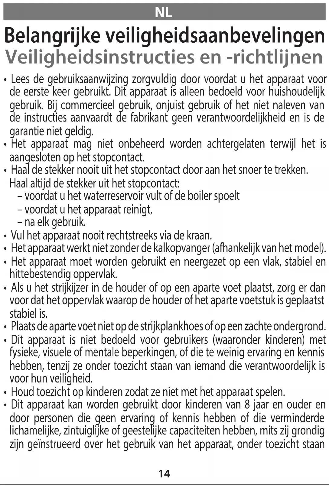 - Dit apparaat kan worden gebruikt door kinderen van 8 jaar en ouder en door personen die geen ervaring of kennis hebben of die verminderde lichamelijke, zintuiglijke of geestelijke capaciteiten hebben, mits zij grondig zijn geïnstrueerd over het gebruik van het apparaat, onder toezicht staan1515 en de risico’s van het gebruik begrijpen. Laat kinderen niet spelen met het apparaat. Kinderen mogen het apparaat niet zonder toezicht reinigen of gebruikersonderhoud plegen. Houd het apparaat en het snoer buiten het bereik van kinderen jonger dan 8 jaar. De oppervlakken van het apparaat kunnen zeer hoge temperaturen bereiken tijdens het gebruik en zo brandwonden veroorzaken. Raak de hete oppervlakken van het apparaat niet aan (toegankelijke metalen onderdelen en kunststof onderdelen naast de metalen onderdelen).