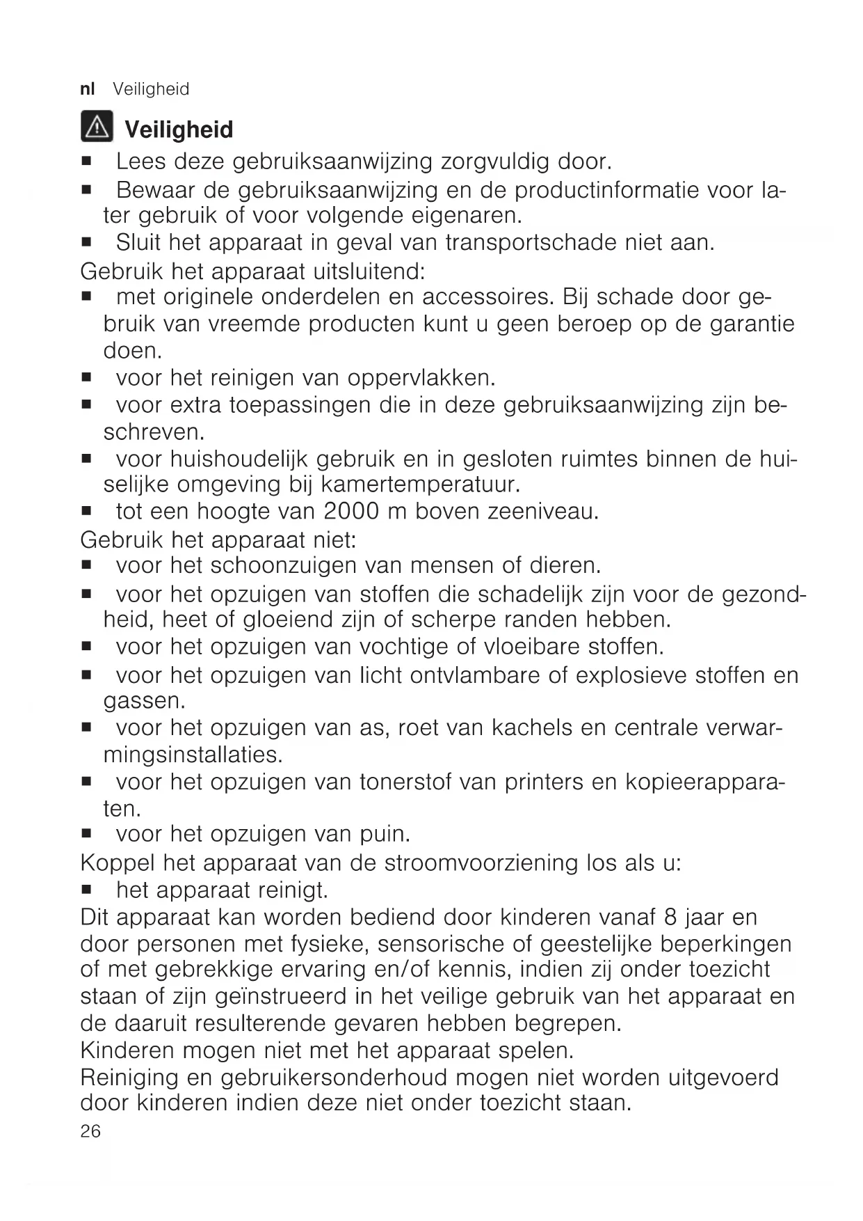 Veiligheid ¡ Lees deze gebruiksaanwijzing zorgvuldig door. ¡ Bewaar de gebruiksaanwijzing en de productinformatie voor la- ter gebruik of voor volgende eigenaren. ¡ Sluit het apparaat in geval van transportschade niet aan. Gebruik het apparaat uitsluitend: ¡ met originele onderdelen en accessoires. Bij schade door ge- bruik van vreemde producten kunt u geen beroep op de garantie doen. ¡ voor het reinigen van oppervlakken. ¡ voor extra toepassingen die in deze gebruiksaanwijzing zijn be- schreven. ¡ voor huishoudelijk gebruik en in gesloten ruimtes binnen de hui- selijke omgeving bij kamertemperatuur. ¡ tot een hoogte van 2000m boven zeeniveau. Gebruik het apparaat niet: ¡ voor het schoonzuigen van mensen of dieren. ¡ voor het opzuigen van stoffen die schadelijk zijn voor de gezond- heid, heet of gloeiend zijn of scherpe randen hebben. ¡ voor het opzuigen van vochtige of vloeibare stoffen. ¡ voor het opzuigen van licht ontvlambare of explosieve stoffen en gassen. ¡ voor het opzuigen van as, roet van kachels en centrale verwar- mingsinstallaties. ¡ voor het opzuigen van tonerstof van printers en kopieerappara- ten. ¡ voor het opzuigen van puin. Koppel het apparaat van de stroomvoorziening los als u: ¡ het apparaat reinigt. Dit apparaat kan worden bediend door kinderen vanaf 8 jaar en door personen met fysieke, sensorische of geestelijke beperkingen of met gebrekkige ervaring en/of kennis, indien zij onder toezicht staan of zijn geïnstrueerd in het veilige gebruik van het apparaat en de daaruit resulterende gevaren hebben begrepen. Kinderen mogen niet met het apparaat spelen. Reiniging en gebruikersonderhoud mogen niet worden uitgevoerd door kinderen indien deze niet onder toezicht staan.Veiligheid nl