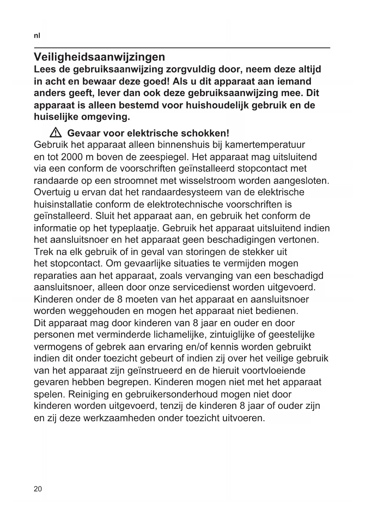 Veiligheidsaanwijzingen Lees de gebruiksaanwijzing zorgvuldig door, neem deze altijd in acht en bewaar deze goed! Als u dit apparaat aan iemand anders geeft, lever dan ook deze gebruiksaanwijzing mee. Dit apparaat is alleen bestemd voor huishoudelijk gebruik en de huiselijke omgeving. W Gevaar voor elektrische schokken! Gebruik het apparaat alleen binnenshuis bij kamertemperatuur en tot 2000 m boven de zeespiegel. Het apparaat mag uitsluitend via een conform de voorschriften geïnstalleerd stopcontact met randaarde op een stroomnet met wisselstroom worden aangesloten. Overtuig u ervan dat het randaardesysteem van de elektrische huisinstallatie conform de elektrotechnische voorschriften is geïnstalleerd. Sluit het apparaat aan, en gebruik het conform de informatie op het typeplaatje. Gebruik het apparaat uitsluitend indien het aansluitsnoer en het apparaat geen beschadigingen vertonen. Trek na elk gebruik of in geval van storingen de stekker uit het stopcontact. Om gevaarlijke situaties te vermijden mogen reparaties aan het apparaat, zoals vervanging van een beschadigd aansluitsnoer, alleen door onze servicedienst worden uitgevoerd. Kinderen onder de 8 moeten van het apparaat en aansluitsnoer worden weggehouden en mogen het apparaat niet bedienen. Dit apparaat mag door kinderen van 8 jaar en ouder en door personen met verminderde lichamelijke, zintuiglijke of geestelijke vermogens of gebrek aan ervaring en/of kennis worden gebruikt indien dit onder toezicht gebeurt of indien zij over het veilige gebruik van het apparaat zijn geïnstrueerd en de hieruit voortvloeiende gevaren hebben begrepen. Kinderen mogen niet met het apparaat spelen. Reiniging en gebruikersonderhoud mogen niet door kinderen worden uitgevoerd, tenzij de kinderen 8 jaar of ouder zijn en zij deze werkzaamheden onder toezicht uitvoeren.21