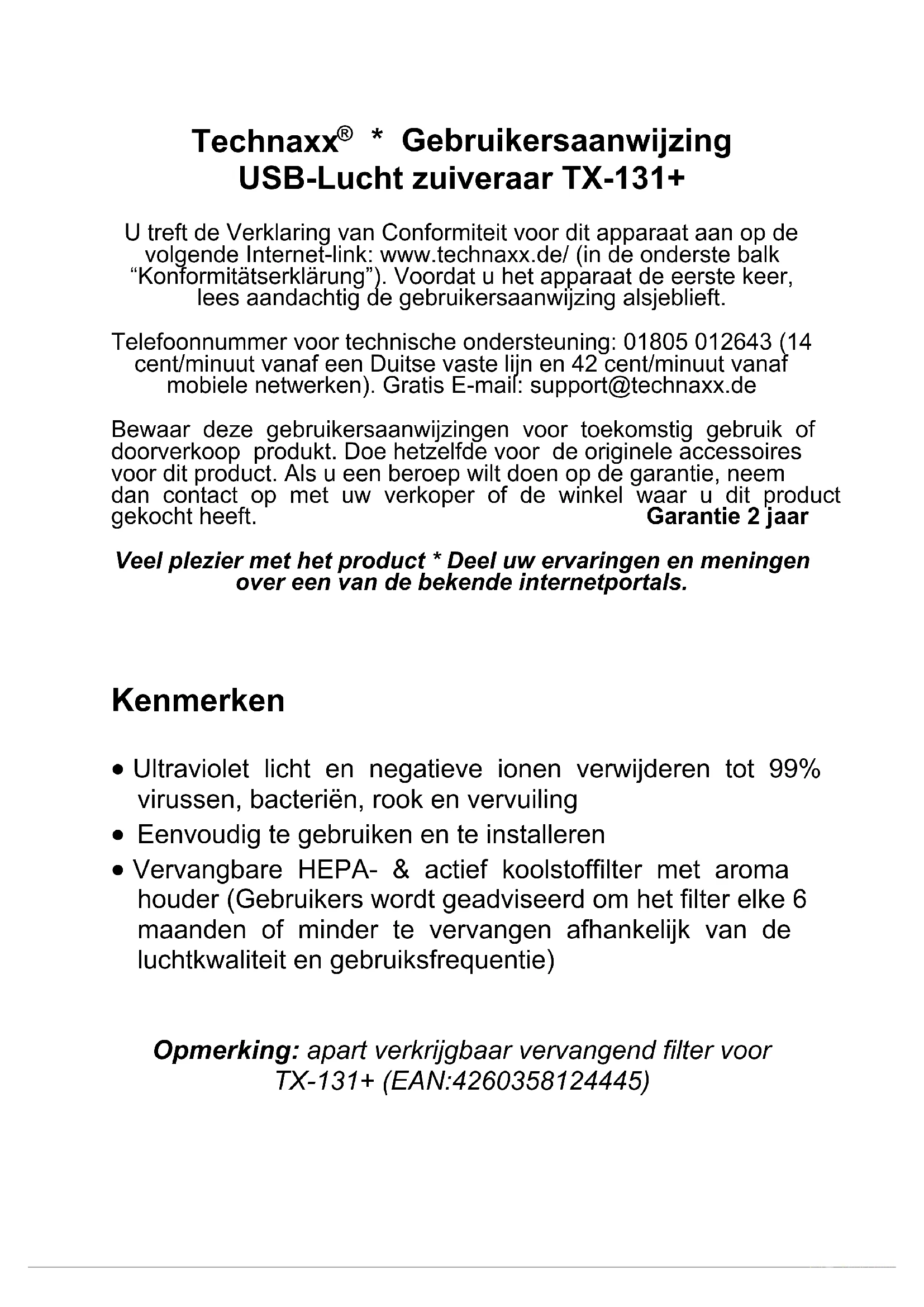 - Gebruikersaanwijzing USB-Lucht zuiveraar TX-131+ U treft de Verklaring van Conformiteit voor dit apparaat aan op de volgende Internet-link: www.technaxx.de/ (in de onderste balk “Konformitätserklärung”). Voordat u het apparaat de eerste keer, lees aandachtig de gebruikersaanwijzing alsjeblieft. Telefoonnummer voor technische ondersteuning: 01805 012643 (14 cent/minuut vanaf een Duitse vaste lijn en 42 cent/minuut vanaf mobiele netwerken). Gratis E-mail: support@technaxx.de Bewaar deze gebruikersaanwijzingen voor toekomstig gebruik of doorverkoop produkt. Doe hetzelfde voor de originele accessoires voor dit product. Als u een beroep wilt doen op de garantie, neem dan contact op met uw verkoper of de winkel waar u dit product gekocht heeft. Garantie 2 jaar Veel plezier met het product * Deel uw ervaringen en meningen over een van de bekende internetportals.