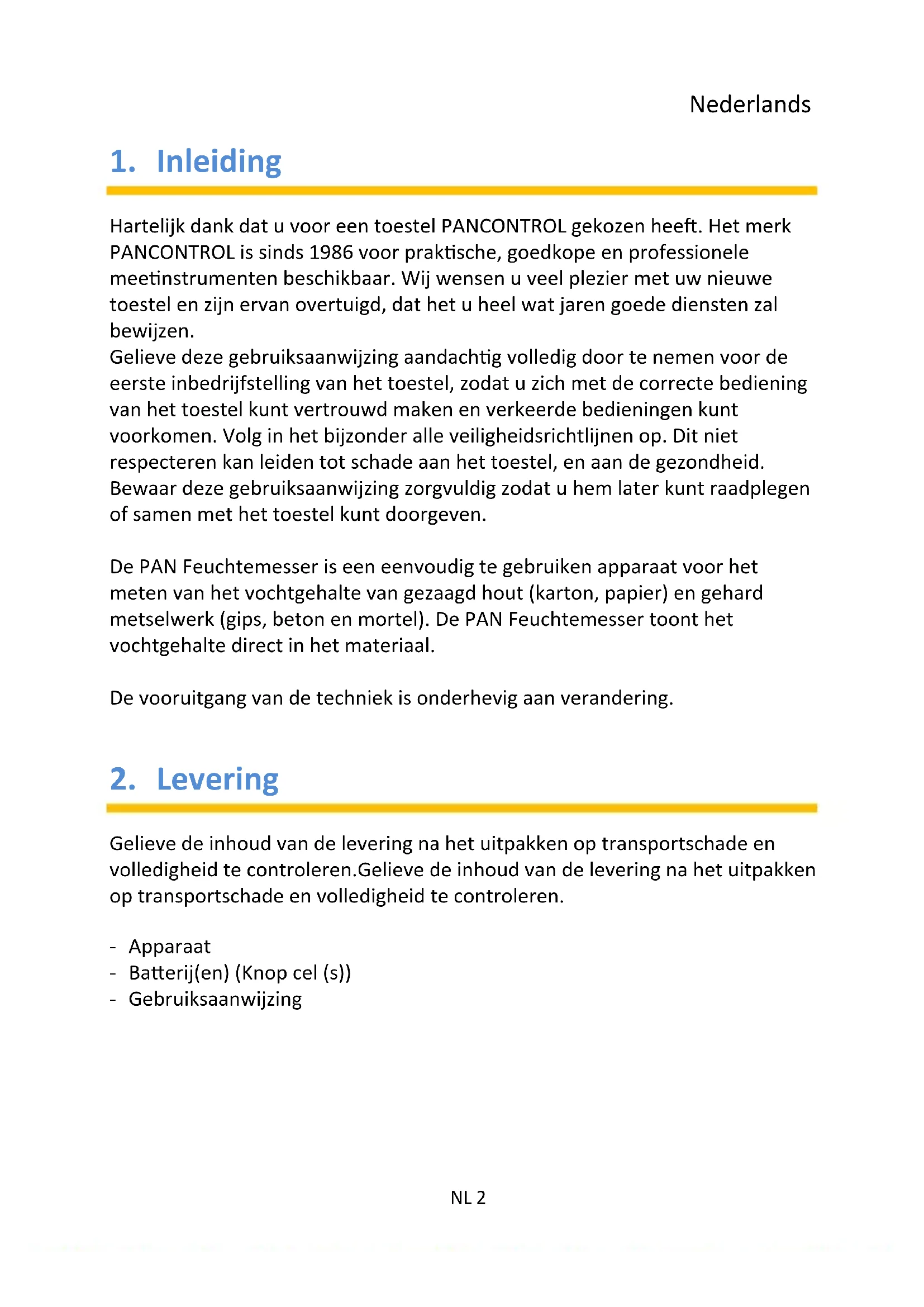 Hartelijk dank dat u voor een toestel PANCONTROL gekozen heeft. Het merk PANCONTROL is sinds 1986 voor praktische, goedkope en professionele meetinstrumenten beschikbaar. Wij wensen u veel plezier met uw nieuwe toestel en zijn ervan overtuigd, dat het u heel wat jaren goede diensten zal bewijzen. Gelieve deze gebruiksaanwijzing aandachtig volledig door te nemen voor de eerste inbedrijfstelling van het toestel, zodat u zich met de correcte bediening van het toestel kunt vertrouwd maken en verkeerde bedieningen kunt voorkomen. Volg in het bijzonder alle veiligheidsrichtlijnen op. Dit niet respecteren kan leiden tot schade aan het toestel, en aan de gezondheid. Bewaar deze gebruiksaanwijzing zorgvuldig zodat u hem later kunt raadplegen of samen met het toestel kunt doorgeven. De PAN Feuchtemesser is een eenvoudig te gebruiken apparaat voor het meten van het vochtgehalte van gezaagd hout (karton, papier) en gehard metselwerk (gips, beton en mortel). De PAN Feuchtemesser toont het vochtgehalte direct in het materiaal. De vooruitgang van de techniek is onderhevig aan verandering.
