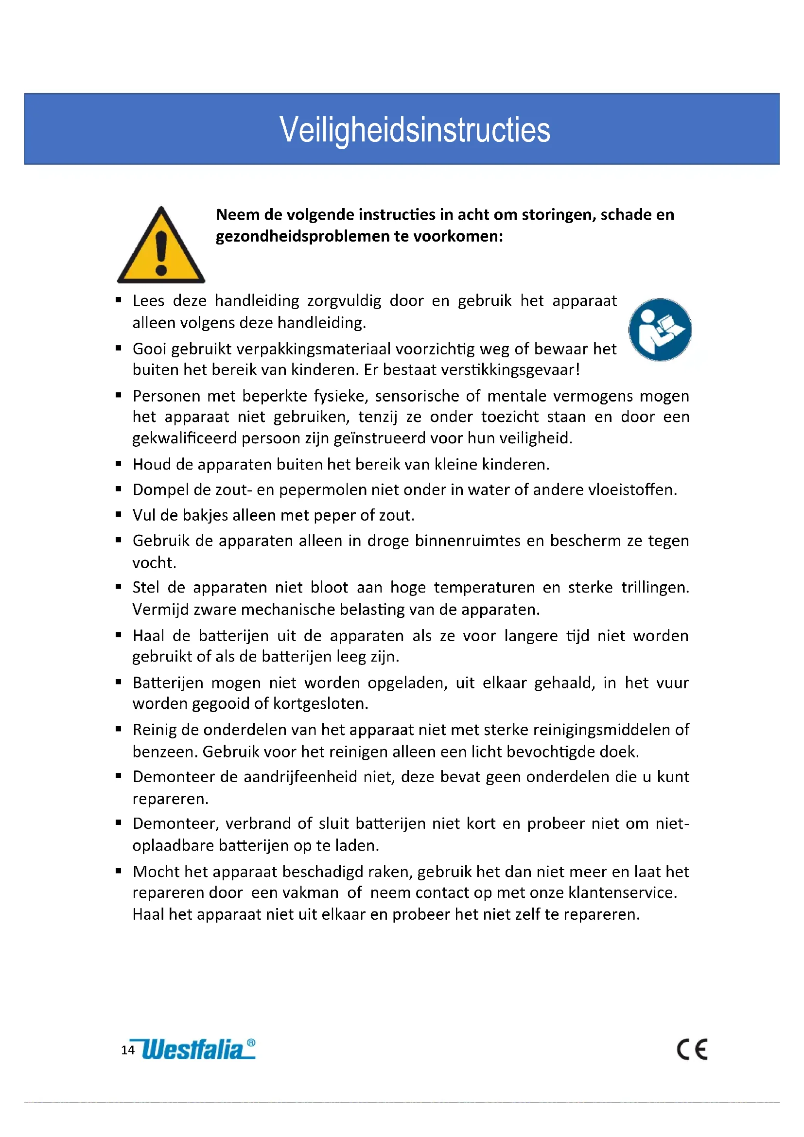 Lees deze handleiding zorgvuldig door en gebruik het apparaat alleen volgens deze handleiding. Gooi gebruikt verpakkingsmateriaal voorzichtig weg of bewaar het buiten het bereik van kinderen. Er bestaat verstikkingsgevaar! Personen met beperkte fysieke, sensorische of mentale vermogens mogen het apparaat niet gebruiken, tenzij ze onder toezicht staan en door een gekwalificeerd persoon zijn geïnstrueerd voor hun veiligheid. Houd de apparaten buiten het bereik van kleine kinderen. Dompel de zout- en pepermolen niet onder in water of andere vloeistoffen. Vul de bakjes alleen met peper of zout. Gebruik de apparaten alleen in droge binnenruimtes en bescherm ze tegen vocht. Stel de apparaten niet bloot aan hoge temperaturen en sterke trillingen. Vermijd zware mechanische belasting van de apparaten. Haal de batterijen uit de apparaten als ze voor langere tijd niet worden gebruikt of als de batterijen leeg zijn. Batterijen mogen niet worden opgeladen, uit elkaar gehaald, in het vuur worden gegooid of kortgesloten. Reinig de onderdelen van het apparaat niet met sterke reinigingsmiddelen of benzeen. Gebruik voor het reinigen alleen een licht bevochtigde doek. Demonteer de aandrijfeenheid niet, deze bevat geen onderdelen die u kunt repareren. Demonteer, verbrand of sluit batterijen niet kort en probeer niet om niet- oplaadbare batterijen op te laden. Mocht het apparaat beschadigd raken, gebruik het dan niet meer en laat het repareren door een vakman of neem contact op met onze klantenservice. Haal het apparaat niet uit elkaar en probeer het niet zelf te repareren. Veiligheidsinstructies15