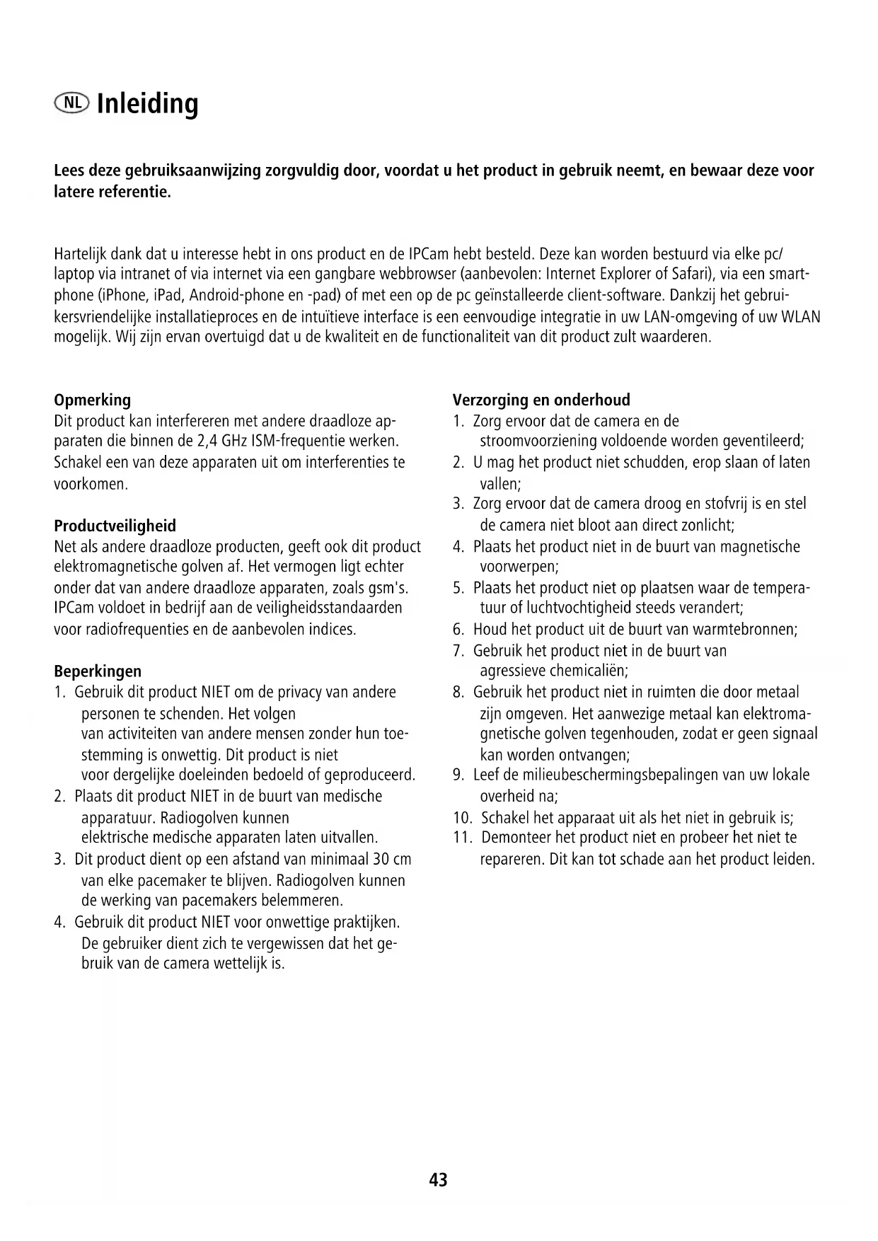 Inleiding Lees deze gebruiksaanwijzing zorgvuldig door, voordat u het product in gebruik neemt, en bewaar deze voor latere referentie. Hartelijk dank dat u interesse hebt in ons product en de IPCam hebt besteld. Deze kan worden bestuurd via elke pc/ laptop via intranet of via internet via een gangbare webbrowser (aanbevolen: Internet Explorer of Safari), via een smart- phone (iPhone, iPad, Android-phone en -pad) of met een op de pc geïnstalleerde client-software. Dankzij het gebrui- kersvriendelijke installatieproces en de intuïtieve interface is een eenvoudige integratie in uw LAN-omgeving of uw WLAN mogelijk. Wij zijn ervan overtuigd dat u de kwaliteit en de functionaliteit van dit product zult waarderen. Opmerking Dit product kan interfereren met andere draadloze ap- paraten die binnen de 2,4 GHz ISM-frequentie werken. Schakel een van deze apparaten uit om interferenties te voorkomen. Productveiligheid Net als andere draadloze producten, geeft ook dit product elektromagnetische golven af. Het vermogen ligt echter onder dat van andere draadloze apparaten, zoals gsm's. IPCam voldoet in bedrijf aan de veiligheidsstandaarden voor radiofrequenties en de aanbevolen indices. Beperkingen