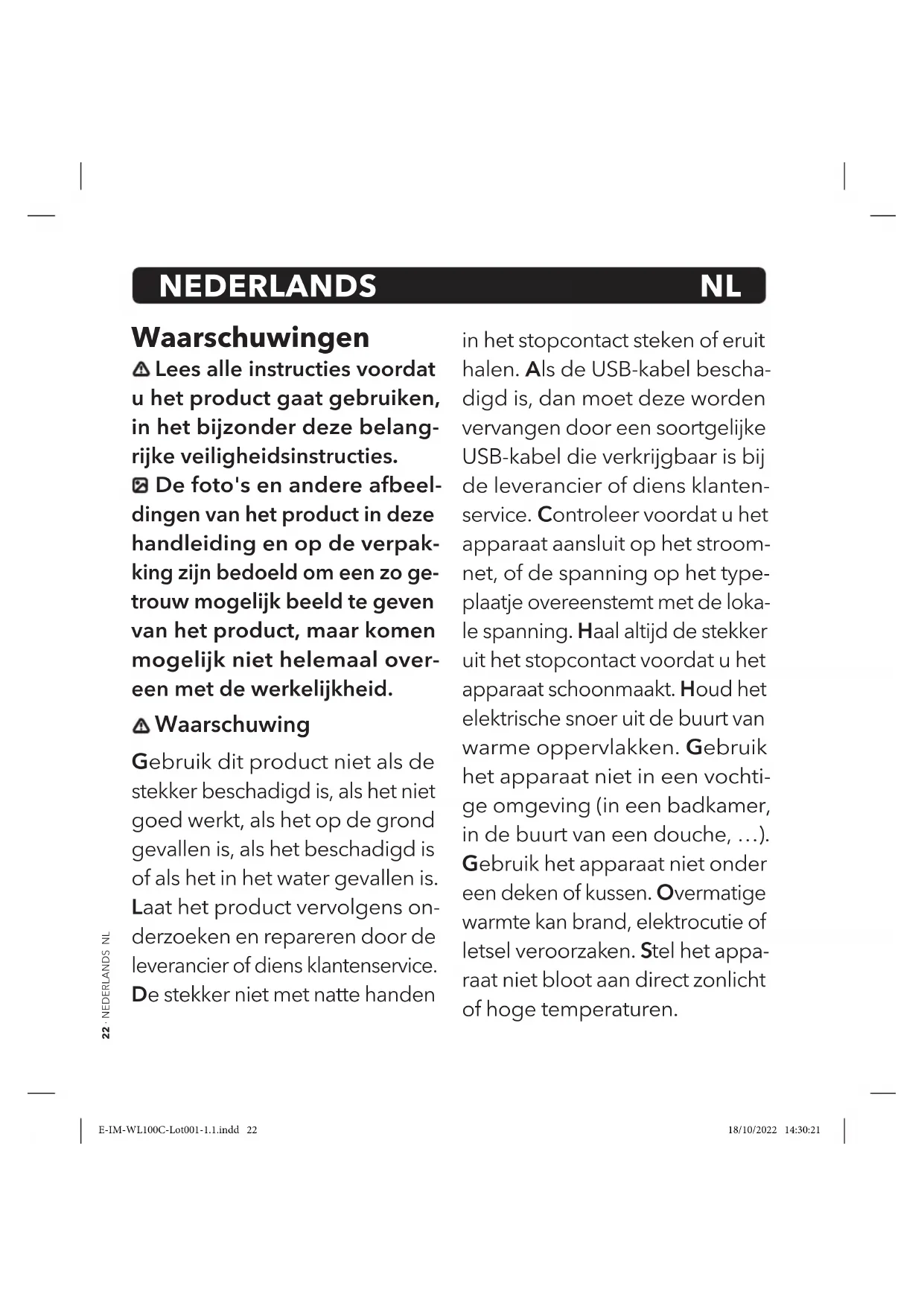 - Bande de fréquence FM : 87,5 - 108 MHz Conseils relatifs à l’élimination des déchets L’emballage est entièrement composé de ma- tériaux sans danger pour l’environnement qui peuvent être déposés auprès du centre de tri de votre commune pour être utilisés comme matières secondaires. Le carton peut être pla- cé dans un bac de collecte papier. Les lms d’emballage doivent être remis au centre de tri et de recyclage de votre commune. Lorsque vous ne vous servez plus de l’appa- reil, éliminez-le de manière respectueuse de l’environnement et conformément aux direc- tives légales. Retirez préalablement la pile et déposez-la dans une borne de collecte an qu’elle soit recyclée. Les piles usées ne doivent en aucune façon être mises aux ordures ménagères. Garantie limitée Lanaform garantit que ce produit est exempt de tout vice de matériau et de fabrication à compter de sa date d’achat et ce pour une période de deux ans, à l’exception des préci- sions ci-dessous. La garantie Lanaform ne couvre pas les dom- mages causés suite à une usure normale de ce produit. En outre, la garantie sur ce produit Lanaform ne couvre pas les dommages causés à la suite de toute utilisation abusive ou inap- propriée ou encore de tout mauvais usage, ac- cident, xation de tout accessoire non auto- risé, modication apportée au produit ou de toute autre condition, de quelle que nature que ce soit, échappant au contrôle de Lanaform. Lanaform ne sera pas tenue pour responsable de tout type de dommage accessoire, consé- cutif ou spécial. Toutes les garanties implicites d’aptitude du produit sont limitées à une période de deux années à compter de la date d’achat initiale pour autant qu’une copie de la preuve d’achat puisse être présentée. Dès réception, Lanaform réparera ou rempla- cera, suivant le cas, votre appareil et vous le renverra. La garantie n’est eectuée que par le biais du Centre Service de Lanaform. Toute activité d’entretien de ce produit conée à toute personne autre que le Centre Service de Lanaform annule la présente garantie. E-IM-WL100C-Lot001-1.1.indd 21E-IM-WL100C-Lot001-1.1.indd 21 18/10/2022 14:30:2118/10/2022 14:30:2122 · NEDERLANDS NL NEDERLANDS NL Waarschuwingen Lees alle instructies voordat u het product gaat gebruiken, in het bijzonder deze belang- rijke veiligheidsinstructies. De foto's en andere afbeel- dingen van het product in deze handleiding en op de verpak- king zijn bedoeld om een zo ge- trouw mogelijk beeld te geven van het product, maar komen mogelijk niet helemaal over- een met de werkelijkheid. Waarschuwing Gebruik dit product niet als de stekker beschadigd is, als het niet goed werkt, als het op de grond gevallen is, als het beschadigd is of als het in het water gevallen is. Laat het product vervolgens on- derzoeken en repareren door de leverancier of diens klantenservice. De stekker niet met natte handen in het stopcontact steken of eruit halen. Als de USB-kabel bescha- digd is, dan moet deze worden vervangen door een soortgelijke USB-kabel die verkrijgbaar is bij de leverancier of diens klanten- service. Controleer voordat u het apparaat aansluit op het stroom- net, of de spanning op het type- plaatje overeenstemt met de loka- le spanning. Haal altijd de stekker uit het stopcontact voordat u het apparaat schoonmaakt. Houd het elektrische snoer uit de buurt van warme oppervlakken. Gebruik het apparaat niet in een vochti- ge omgeving (in een badkamer, in de buurt van een douche, …). Gebruik het apparaat niet onder een deken of kussen. Overmatige warmte kan brand, elektrocutie of letsel veroorzaken. Stel het appa- raat niet bloot aan direct zonlicht of hoge temperaturen. E-IM-WL100C-Lot001-1.1.indd 22E-IM-WL100C-Lot001-1.1.indd 22 18/10/2022 14:30:2118/10/2022 14:30:2123 · NEDERLANDS NL Let op Gebruik dit product uitsluitend zoals beschreven in deze hand- leiding. Lanaform kan niet aan- sprakelijk worden gesteld voor in- cidentele schade als gevolg van een gebruik dat in strijd is met de voorschriften in deze handleiding. Dit apparaat is niet bedoeld voor gebruik door personen, waaron- der kinderen, met verminderde lichamelijke, zintuiglijke of gees- telijke vermogens, of door per- sonen zonder ervaring of kennis, tenzij zij onder toezicht staan of van tevoren instructies hebben gekregen over het gebruik van het apparaat van een persoon die verantwoordelijk is voor hun veiligheid. Zorg ervoor dat kinde- ren niet met het apparaat spelen. Zorg ervoor dat kinderen en min- derjarigen niet met het apparaat spelen en het niet gebruiken. Ge- bruik geen accessoires die niet aanbevolen zijn door Lanaform of die niet met het apparaat zijn meegeleverd. Het is verboden om wijzigingen aan het apparaat aan te brengen. Plaats de voedingska- bel op zo’n manier dat niemand erover kan struikelen. Gebruik het snoer niet als handgreep of om het apparaat te dragen. Laat nooit iets vallen op het apparaat en steek nooit een voorwerp in een van de openingen. Presentatie Hartelijk dank voor het aanschaen van de WL- 100C-lichtwekker van Lanaform. De multifunc- tionele WL-100C-lichtwekker helpt u rustig wakker te worden zodat u uw dag goed kunt beginnen, en helpt u tevens rustig in te slaap te vallen. De WL-100C is voorzien van een functie die u helpt bij het inslapen (inslaaphulpfunc- tie) en is volledig verbonden voor een een- voudige en eciënte bediening op afstand. Inhoud van de verpakking