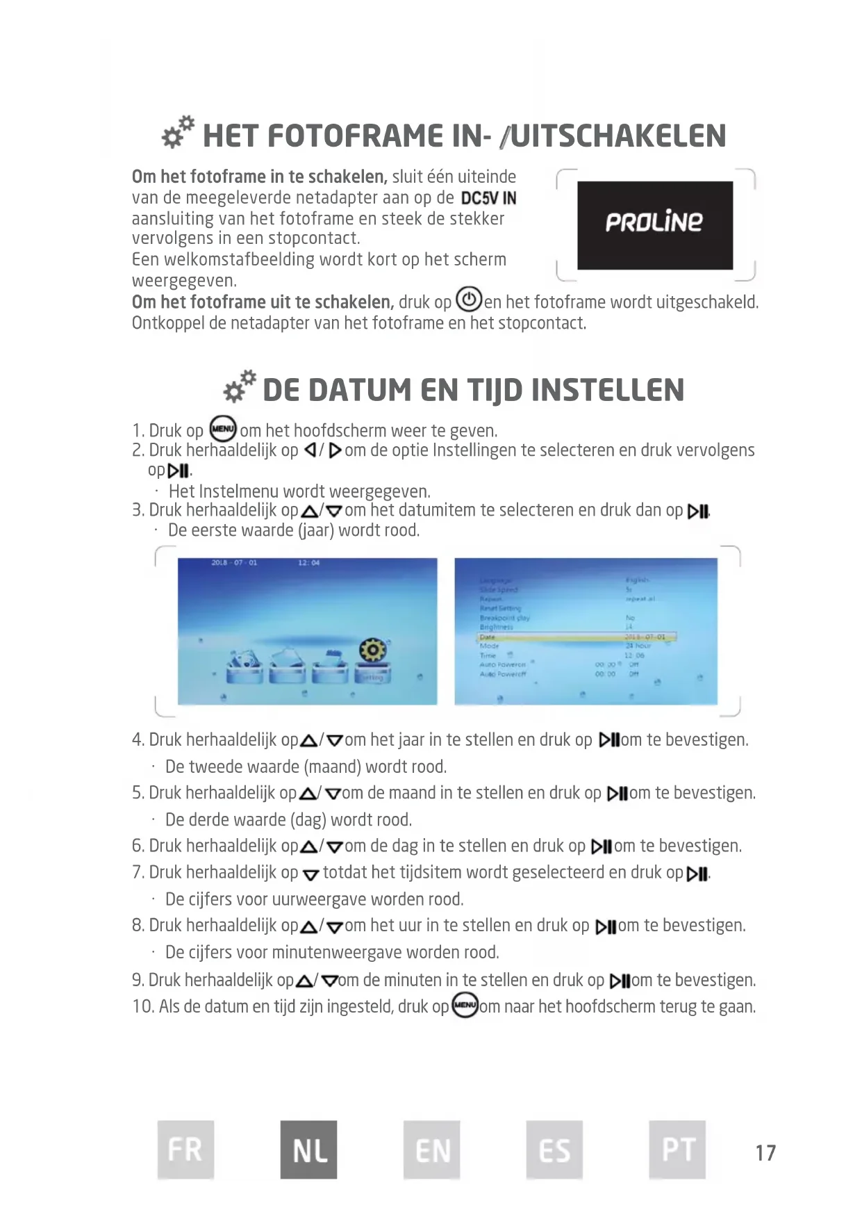 Download de handleiding voor uw Digitale fotolijst in PDF-formaat gratis! Vind uw handleiding PL-DPF720 - PROLINE en neem uw elektronisch apparaat weer in handen. Op deze pagina staan alle documenten die nodig zijn voor het gebruik van uw apparaat. PL-DPF720 van het merk PROLINE.